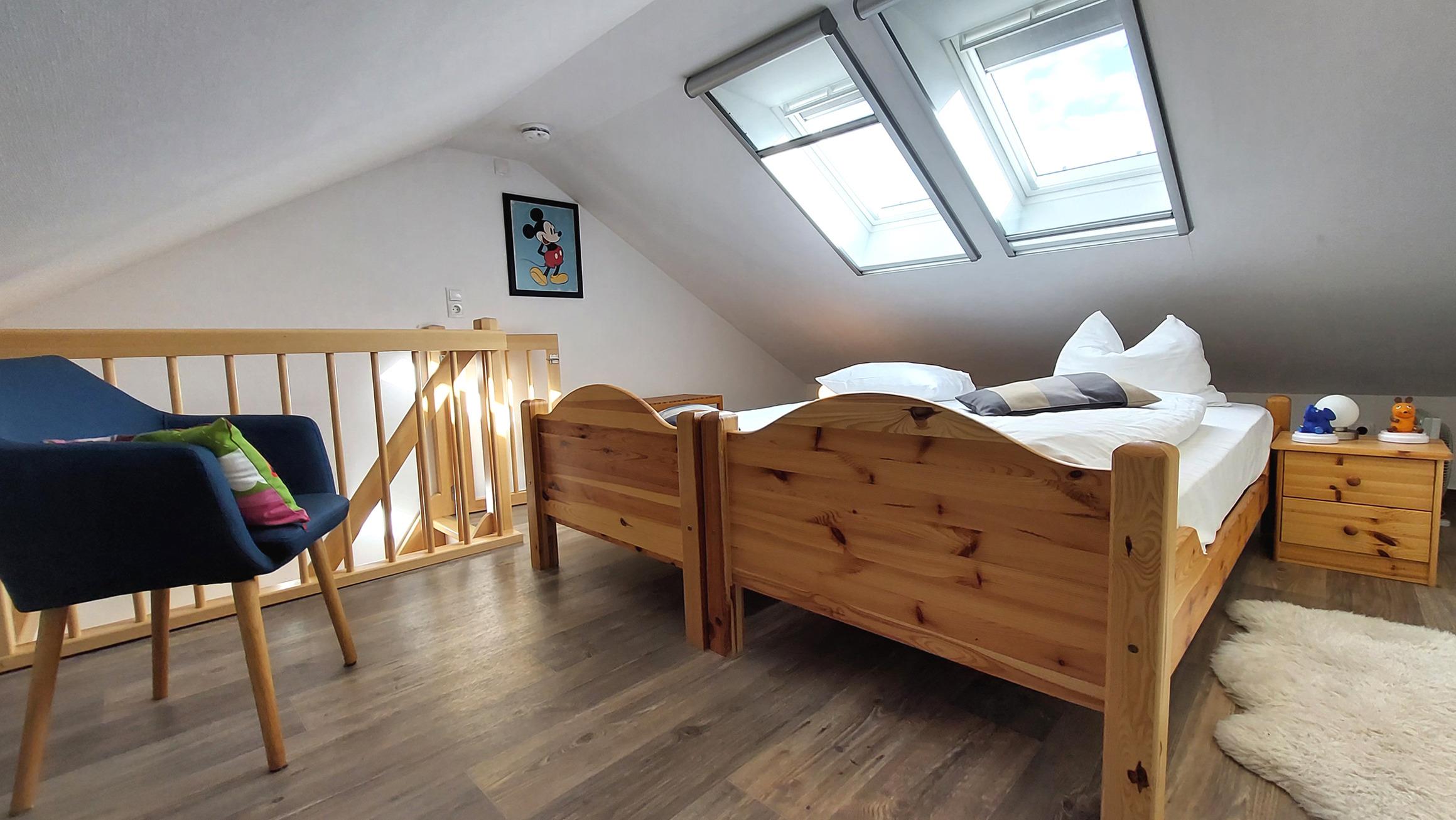 Die beiden Einzelbetten dort können problemlos zusammenschoben werden.