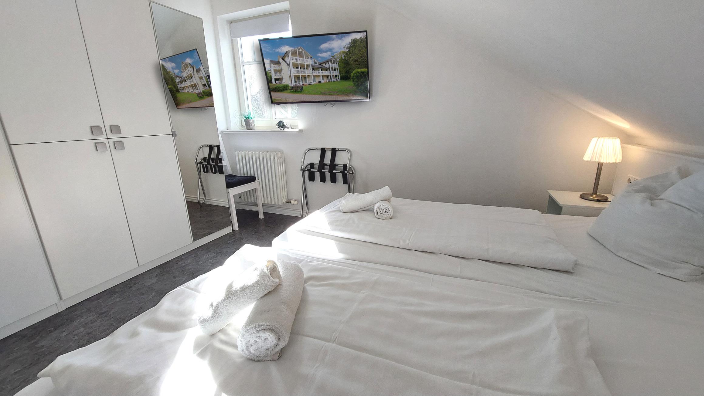 Im unteren Schlafzimmer finden Sie ein Doppelbett mit Nachtischen, Kleiderschrank und zusätzlichem Fernseher.