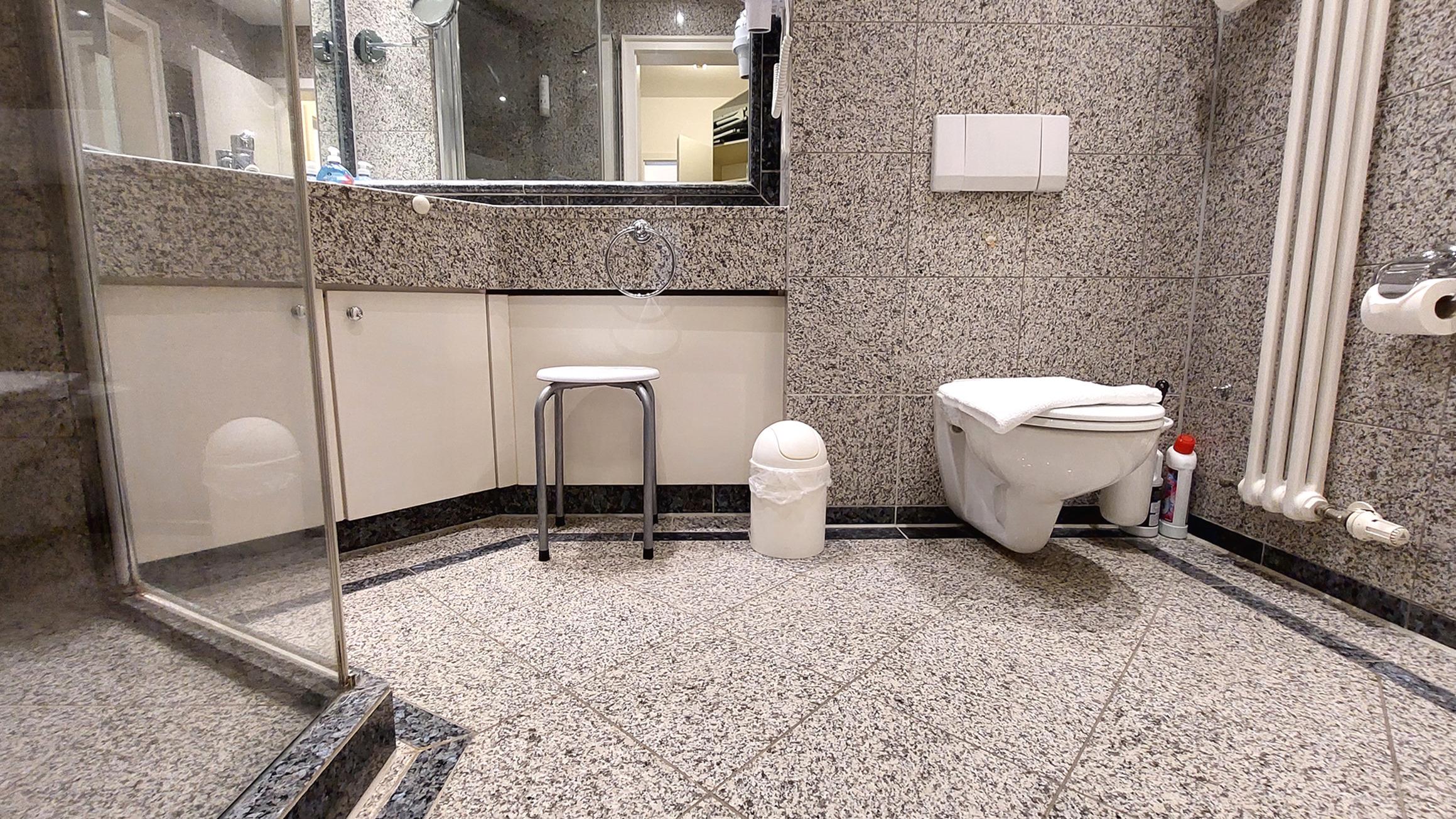 Das Badezimmer ist in Marmoroptik gehalten und verfügt über eine Toilette, einen Waschtisch, eine Dusche, einen Kosmetikspiegel, Fön und Zugang zum Ankleidezimmer mit viel Stauraum.