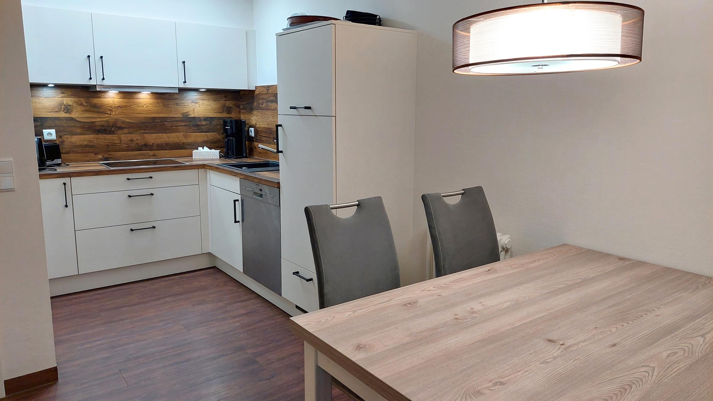 Der Wohn- und Essbereich beherbergt eine moderne Küchenzeile mit Ceran-Kochfeldern, einem Geschirrspüler, einem Kühlschrank mit Gefrierfach, einer Mikrowelle und verschiedenen Küchenutensilien. Der Essbereich bietet sogar Platz für 4 Personen und eine gemütliche Sitzlandschaft lädt zum Verweilen ein. Zur technischen Ausstattung gehören kostenfreies WLAN, ein Smart-TV samt Blu-ray-Player und eine kleine Musikanlage.