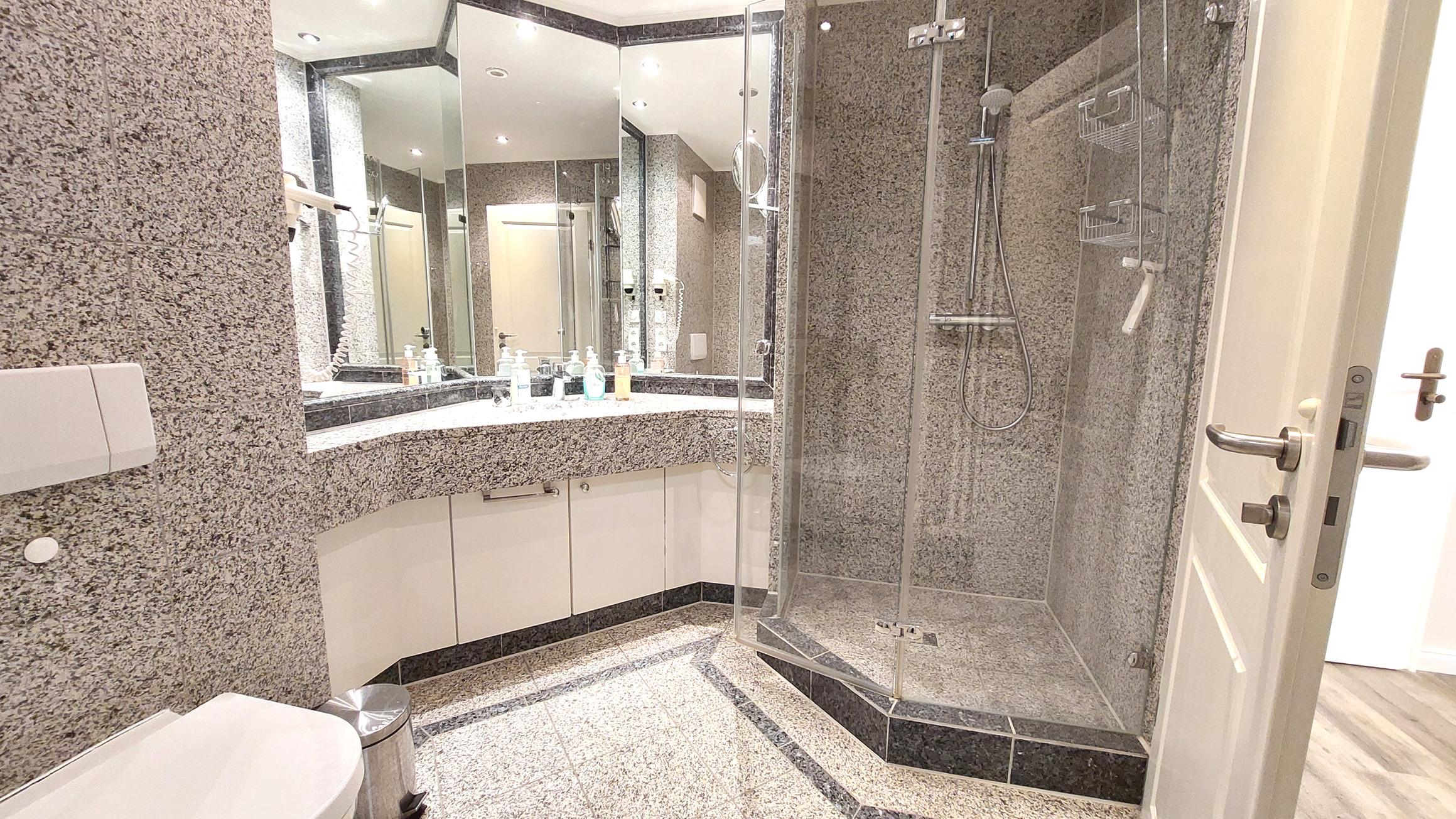 Das Badezimmer im Mamoroptik verfügt über einen großen Waschtisch, WC und eine Dusche.