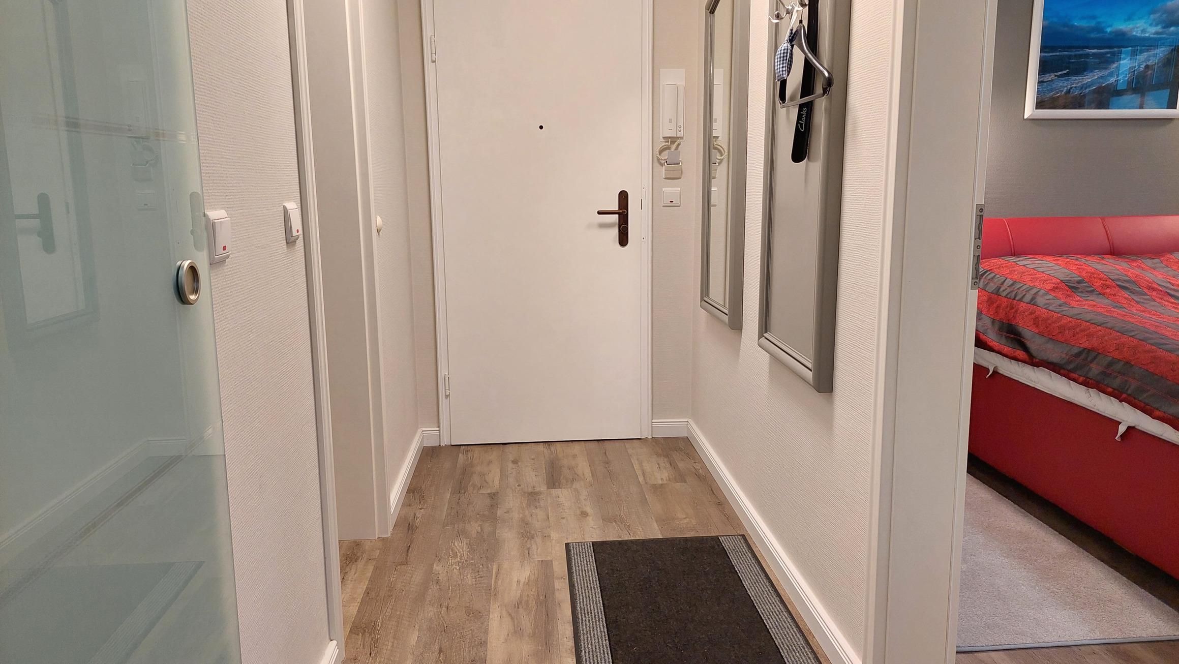 Der Flurbereich mit Garderobe bietet Zugang zu Bad, Schlafzimmer, Ankleidezimmer und Wohnbereich.