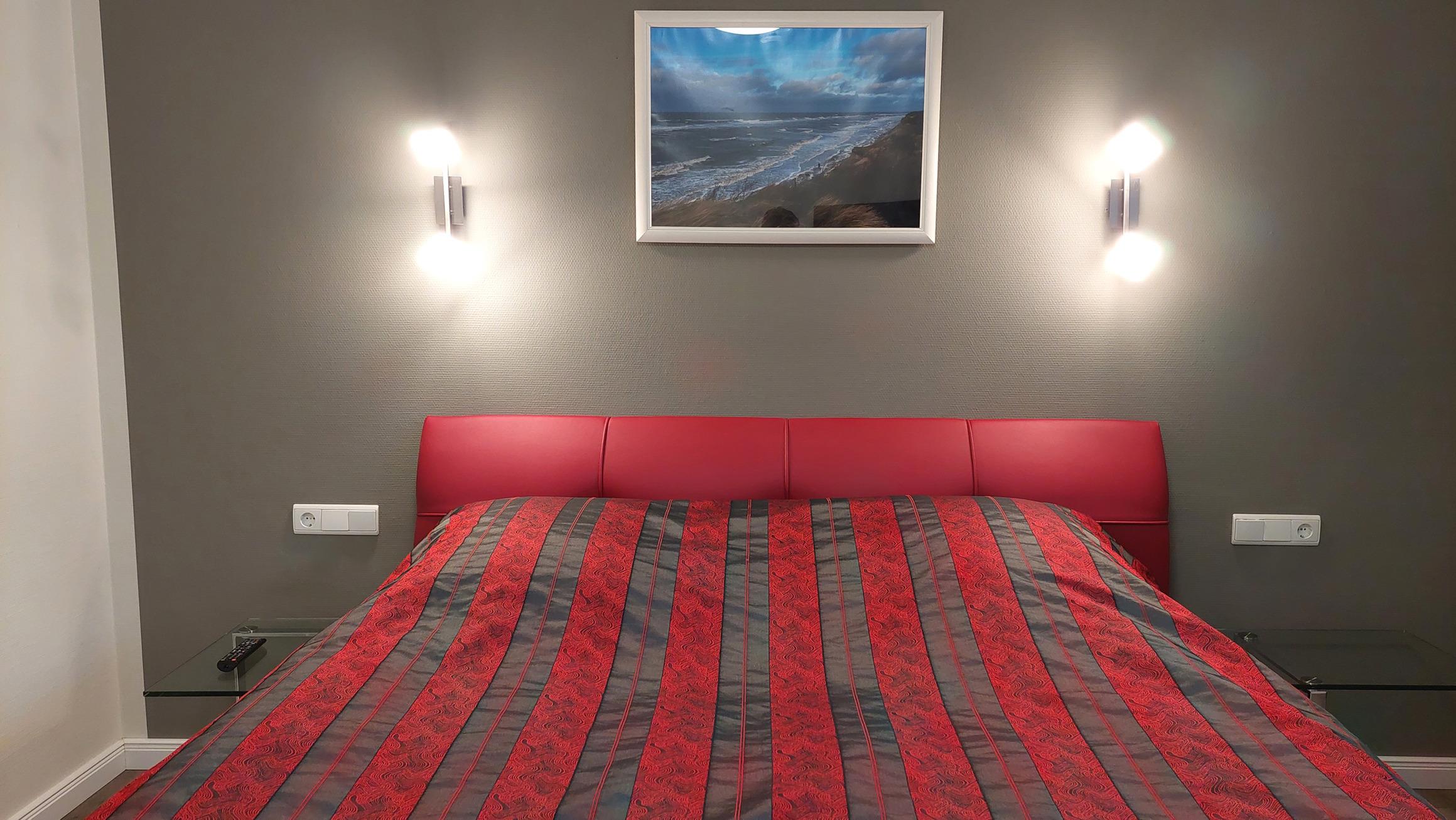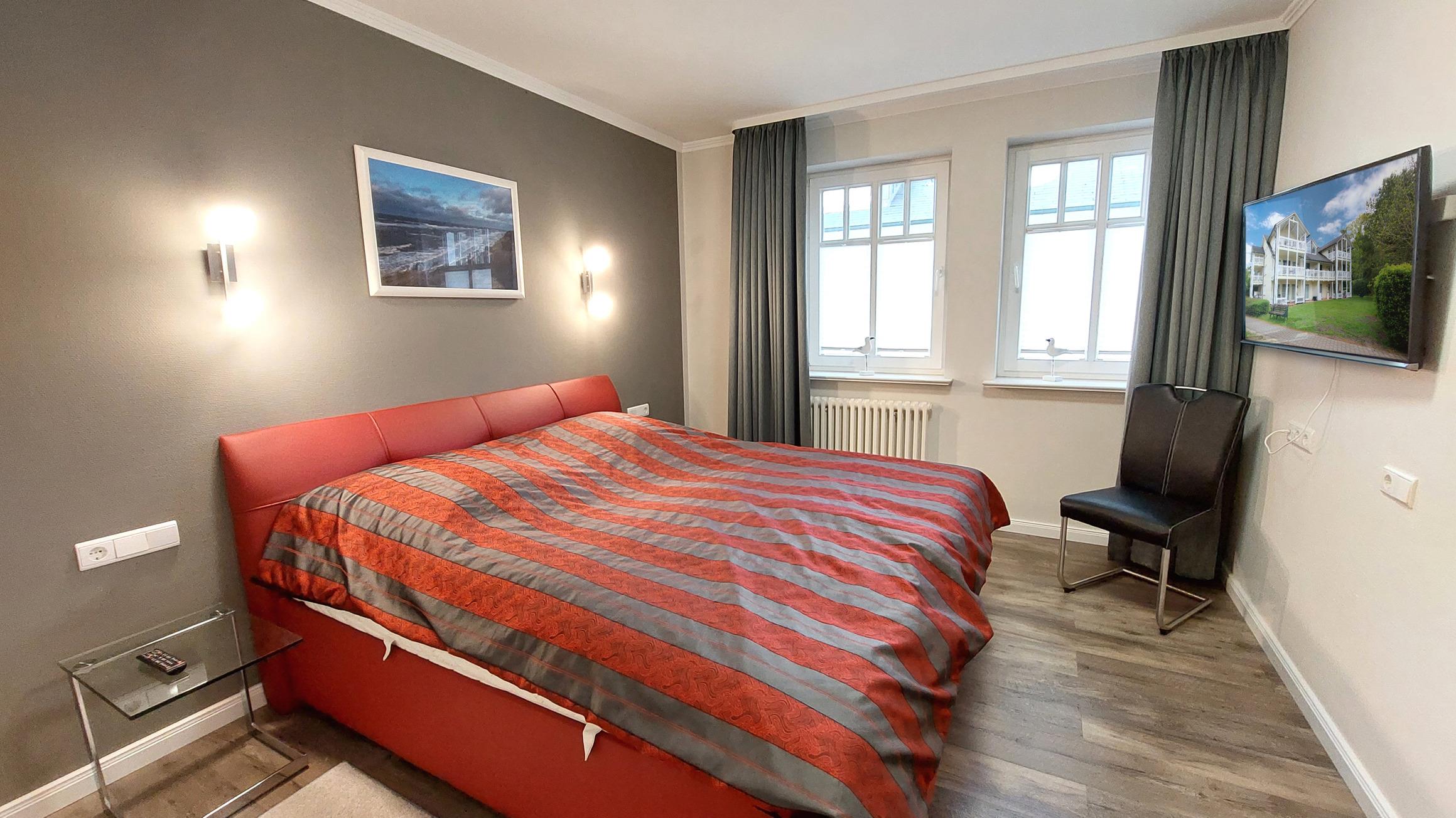 Das Schlafzimmer verfügt über ein Doppelbett mit Nachttischen sowie einen Smart-TV.