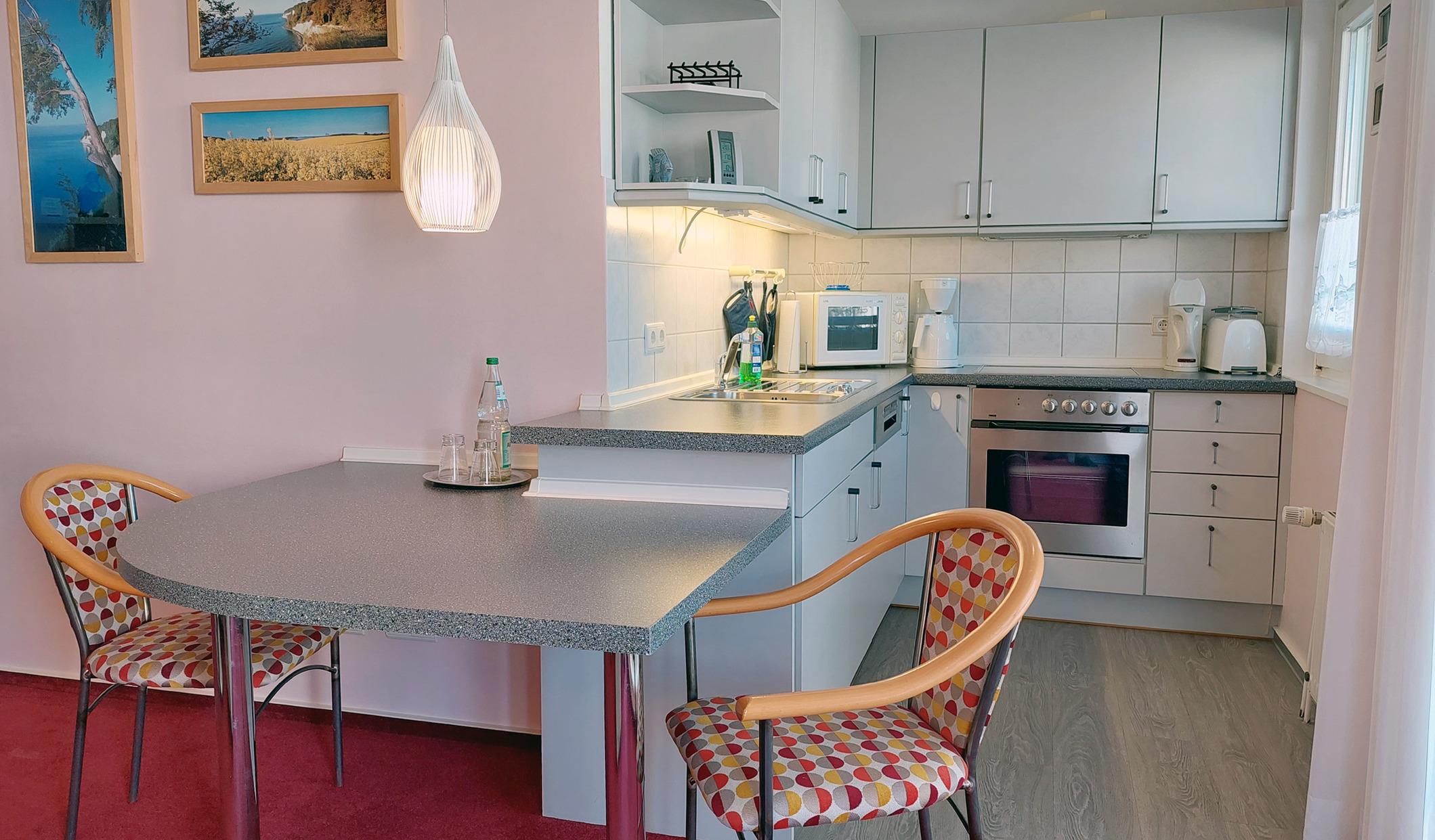 Die schöne 2–Raum Wohnung hat eine Größe von ca. 48 qm und ist für 2 Personen eingerichtet. Neben dem Wohnraum gibt es ein separates Schlafzimmer, eine komplett ausgestattete Küchenzeile, Flur und ein Badezimmer mit Waschtisch, Dusche, Haartrockner und WC. Im Schlafzimmer befindet sich ein Doppelbett, ein zusätzlicher TV und ein großer Kleiderschrank. Im gemütlichen Wohnraum finden Sie neben der Sitzecke mit Sofa einen separaten Essplatz. Zur technischen Ausstattung gehört ein Fernsehgerät sowie ein Blu-ray-Player. Die Küche ist mit Geschirrspüler, Mikrowelle, Cerankochfeld, Backofen und diversen Kleingeräten komplett ausgestattet. Ab sofort können unsere Gäste einen kostenfreien Internetzugang nutzen.