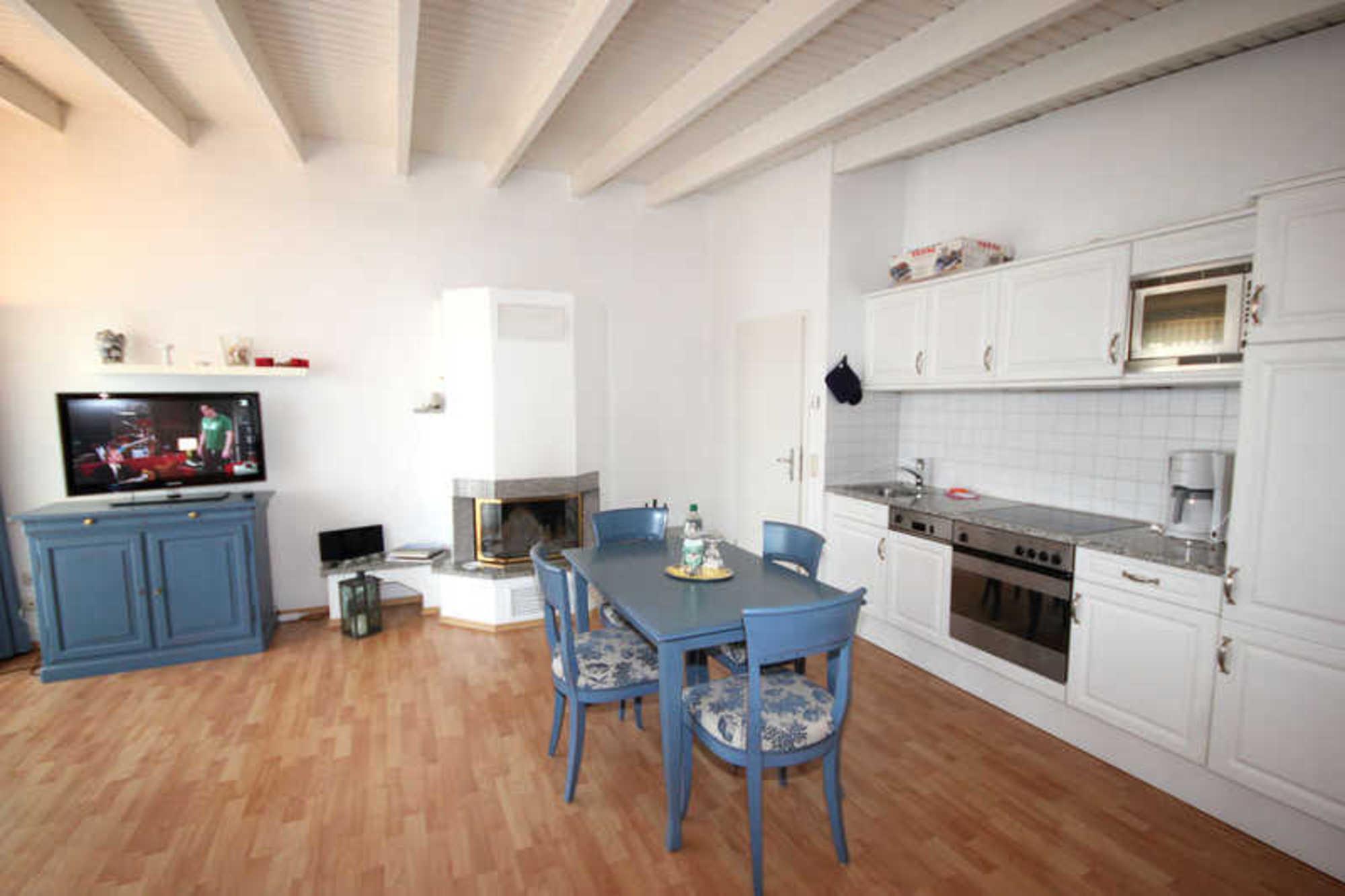 Das Wohnzimmer ist mit einem Essplatz und einer Sitzgruppe, die auch zwei Schlafgelegenheiten auf dem Sofa bietet, möbliert. Die technische Ausstattung beinhaltet ein Flachbildfernseher und ein Radio. Die Küche ist mit Kühlschrank, Backofen, Ceranfeld, Geschirrspüler, Mikrowelle und weiteren Elektrogeräten komplett ausgestattet. Beide Schlafzimmer verfügen über ein Doppelbett und einen Kleiderschrank. Ein PKW-Stellplatz steht Ihnen auf dem Parkplatz „Zentrum“ ( ca. 400 m vom Objekt entfernt ) zur Verfügung.