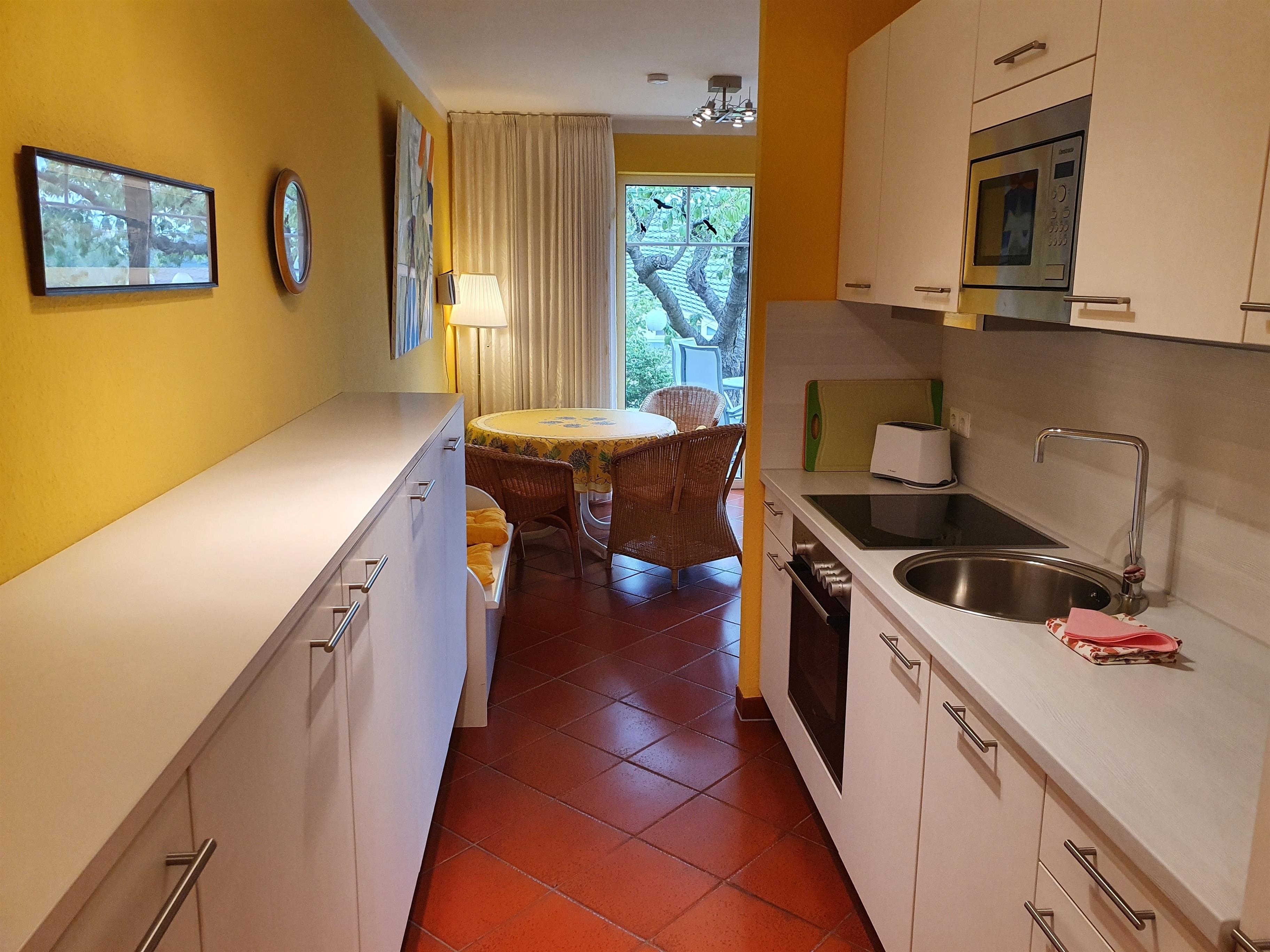 Ihre Wohnung ist aufgeteilt in einen Wohnraum mit Zugang zur Terrasse, eine offene Küche, ein separates Schlafzimmer und ein Bad mit Waschtisch und Glasdusche und WC. Das Wohnzimmer ist mit einem Essplatz und einer Sitzgruppe möbliert. Die technische Ausstattung beinhaltet ein Flachbild-TV, WLAN und Radio. Die Küche ist mit Kühlschrank, Cerankochfeld, Geschirrspüler, Gefrierschrank, Backofen, Mikrowelle, Kaffeemaschine, Wasserkocher und Toaster komplett ausgestattet. Das Schlafzimmer verfügt über Doppelbett und Verdunklungsmöglichkeiten.