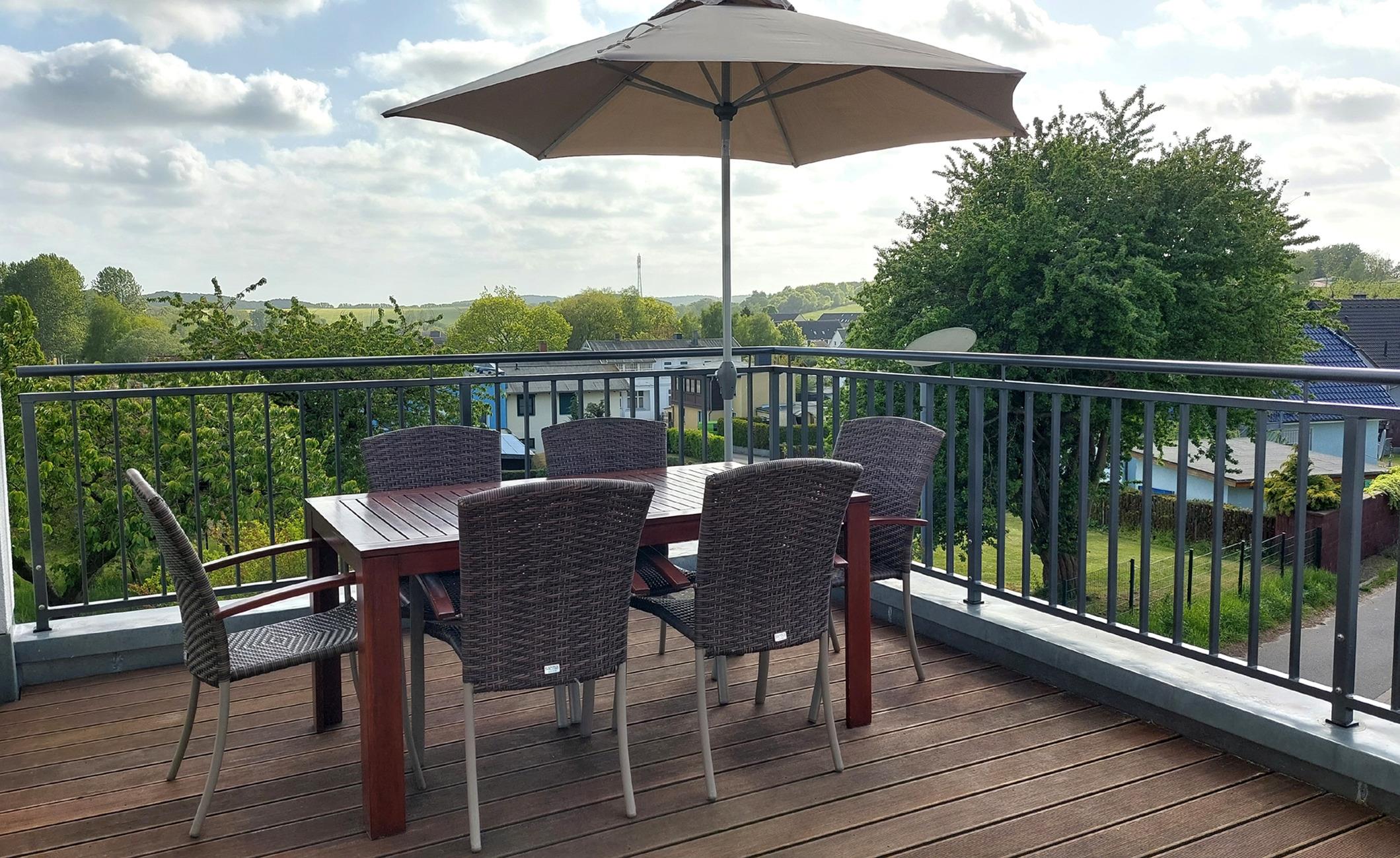 Über eine Treppe gelangen Sie in das Obergeschoss in den hochwertig ausgestatteten Wohnraum mit integrierter und moderner Wohnküche samt großem Esstisch und Zugang zur großen möblierten Dachterrasse. Hier genießen Sie einen weiten Blick über die Dächer von Binz.