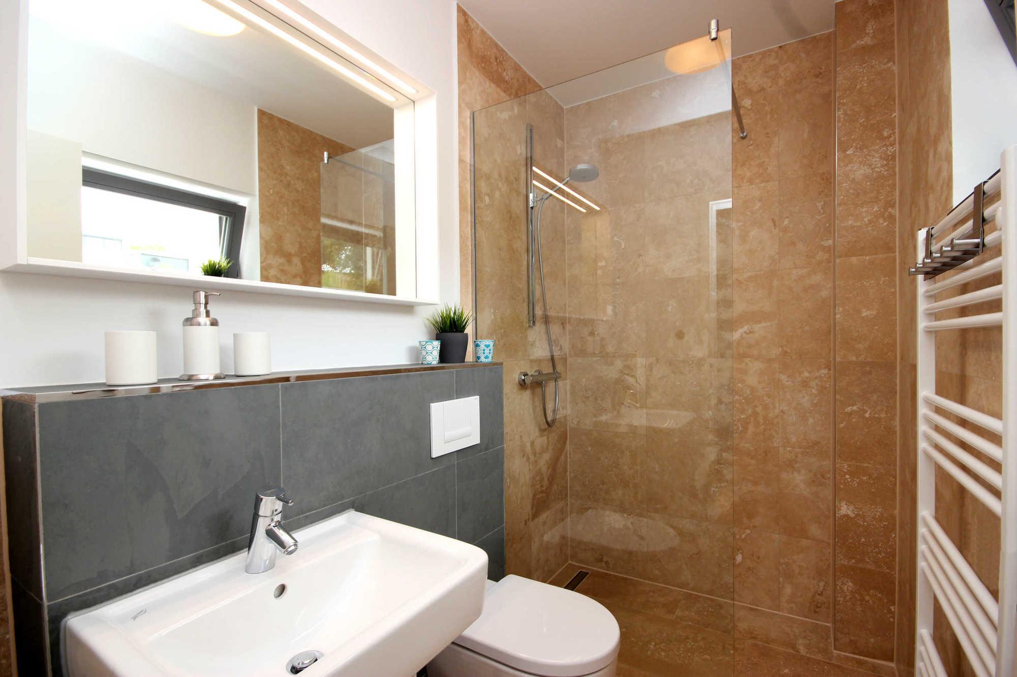 Das erste Bad verfügt über eine Badewanne, Handtuchtrockner, WC und Waschtisch. Im zweiten Bad erwartet Sie eine ebenerdige, großzügige Dusche, Handtuchtrockner, Waschtisch und WC.