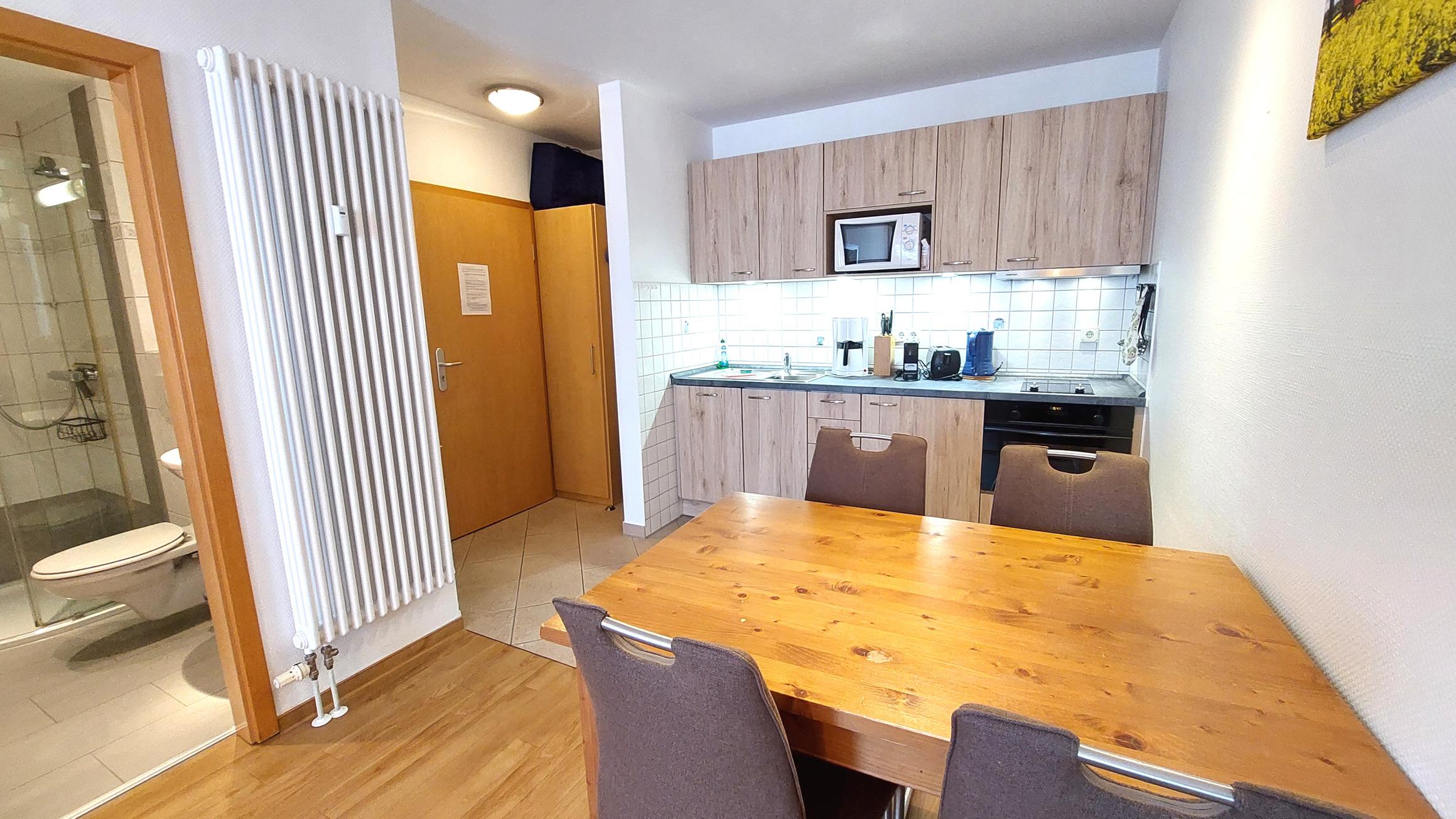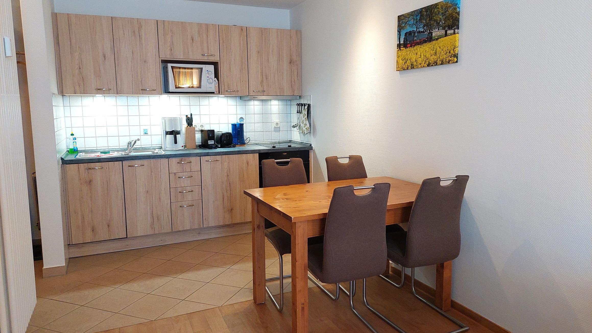 Im gemütlichen Wohnbereich befindet sich eine offene Küchenzeile samt Essbereich.