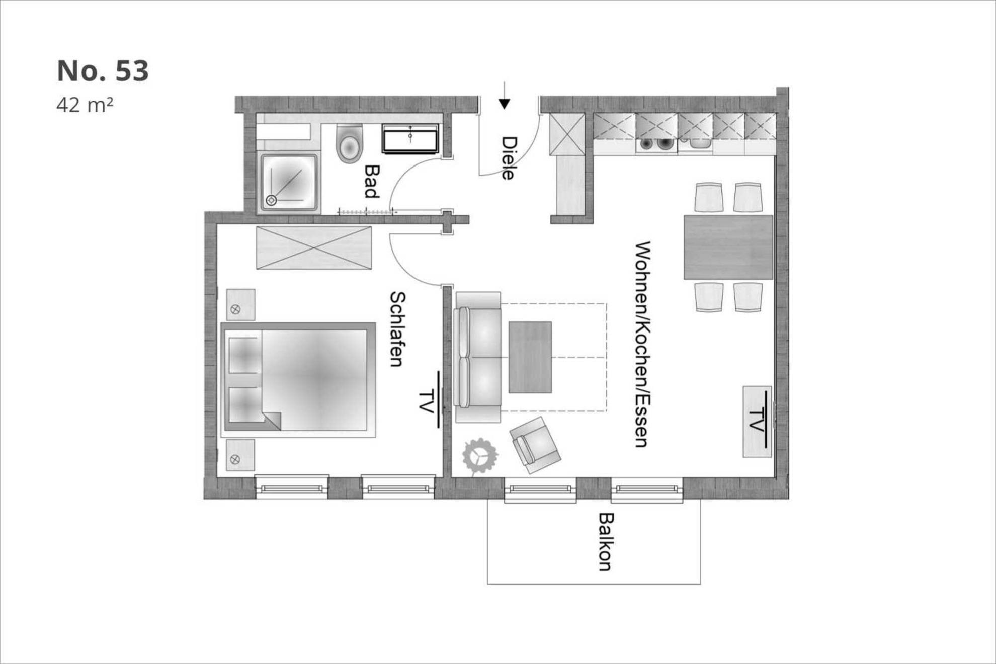 Neben dem Wohnraum mit offener Küche gibt es einen Schlafraum, sowie ein Badezimmer mit Waschtisch, Dusche und WC. Der Schlafraum ist mit einem Doppelbett, TV und einem großen Kleiderschrank ausgestattet. Außerdem finden Sie im komfortablen Wohnbereich neben der Sitzecke mit Schlafsofa für die 3. und 4. Person einen separaten Essplatz, TV mit integriertem Radio und den kostenlosen Internetzugang. Die moderne Küche ist mit Geschirrspülmaschine, Mikrowelle, Cerankochfeld, Kühlschrank und diversen Kleingeräten ausgestattet.
