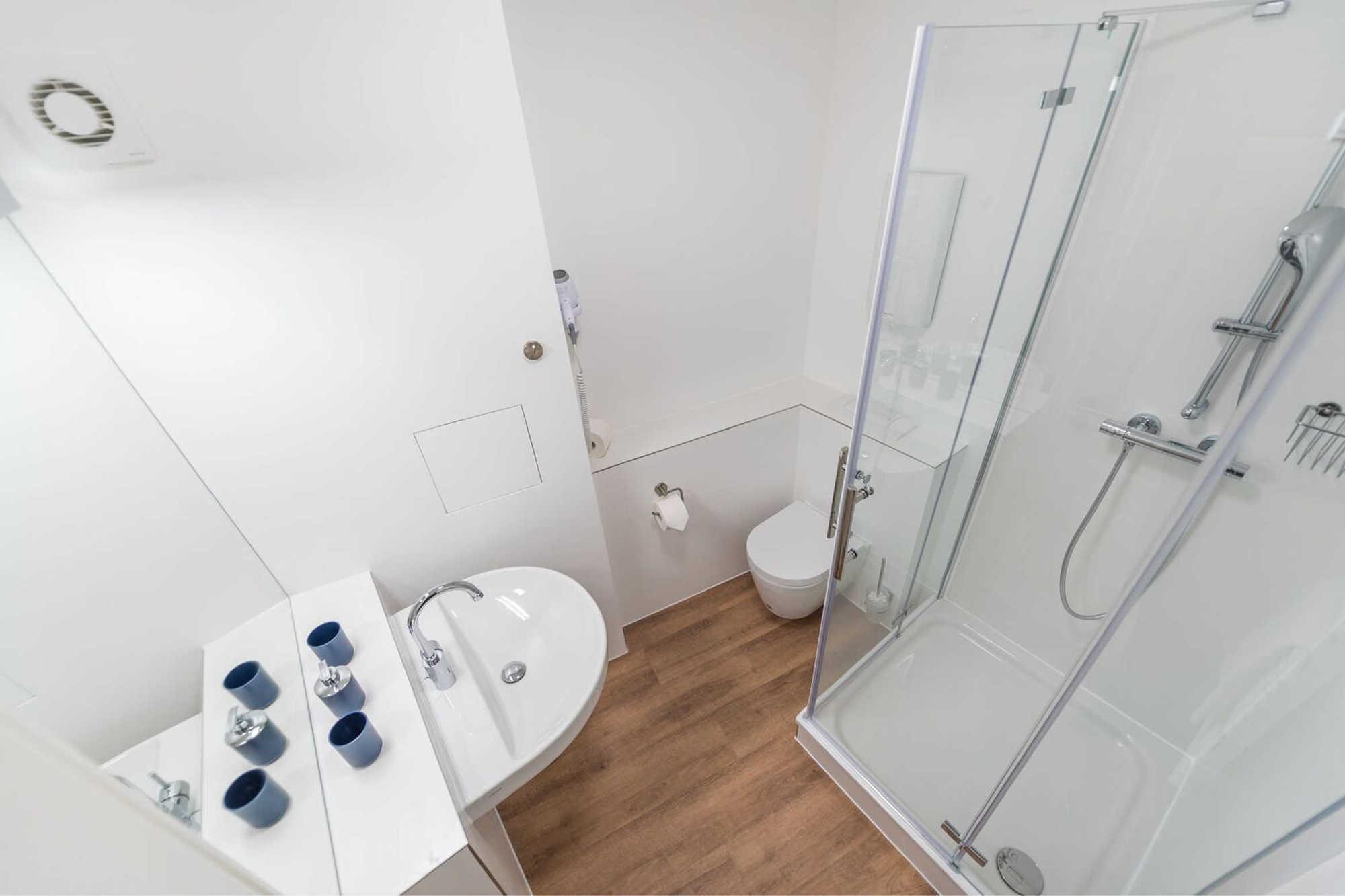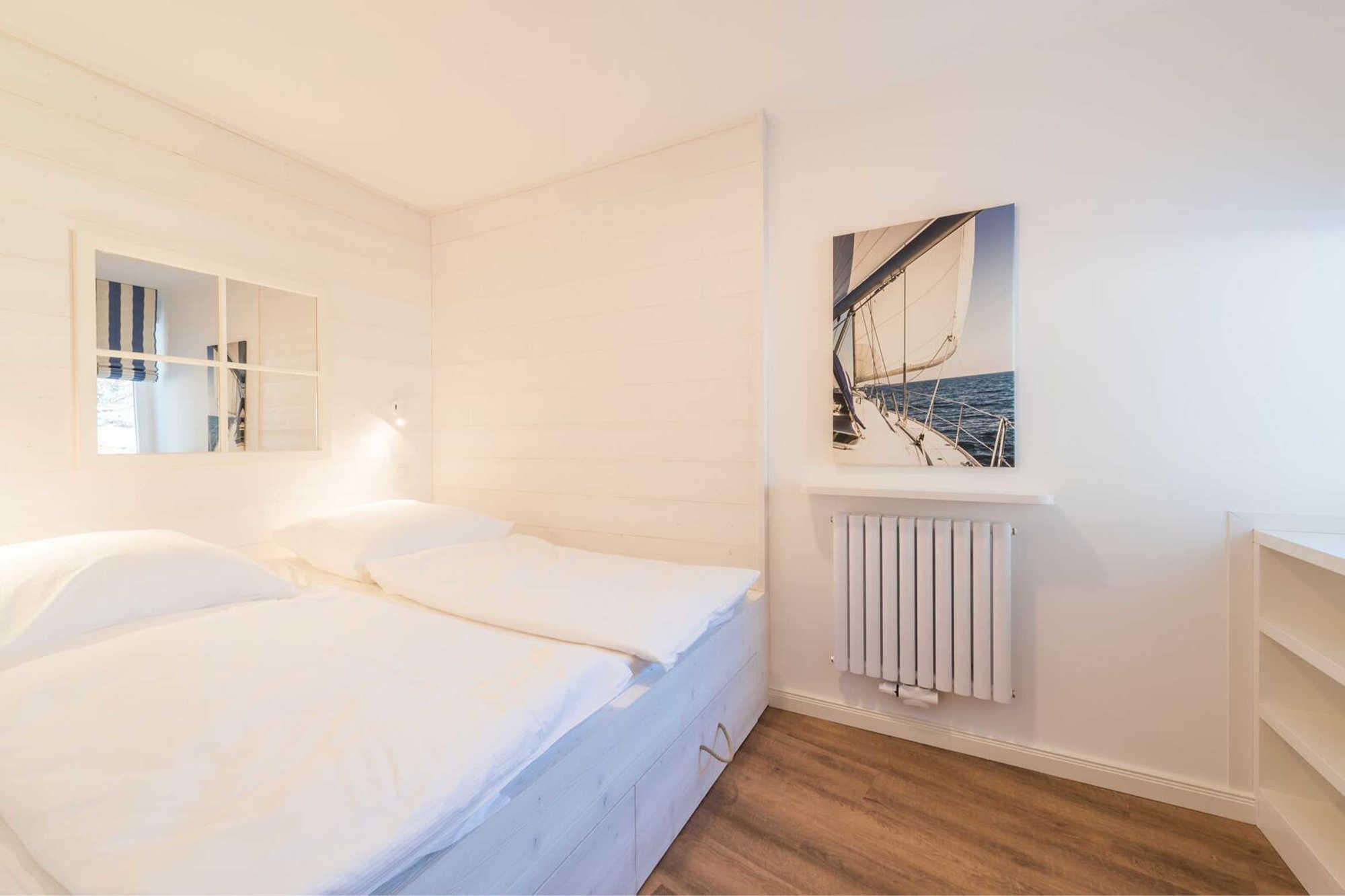 Neben dem Wohnraum mit offener Küche gibt es einen Schlafraum, sowie ein Badezimmer mit Waschtisch, Dusche und WC. Der Schlafraum ist mit einem Doppelbett und einem großen Kleiderschrank ausgestattet. Außerdem finden Sie im komfortablen Wohnbereich neben der Sitzecke mit Schlafsofa für die 3. und 4. Person einen separaten Essplatz, TV mit integriertem Radio und kostenlosem Internetzuganag. Die moderne Küche ist mit Geschirrspülmaschine, Mikrowelle, Cerankochfeld, Kühlschrank und diversen Kleingeräten ausgestattet.