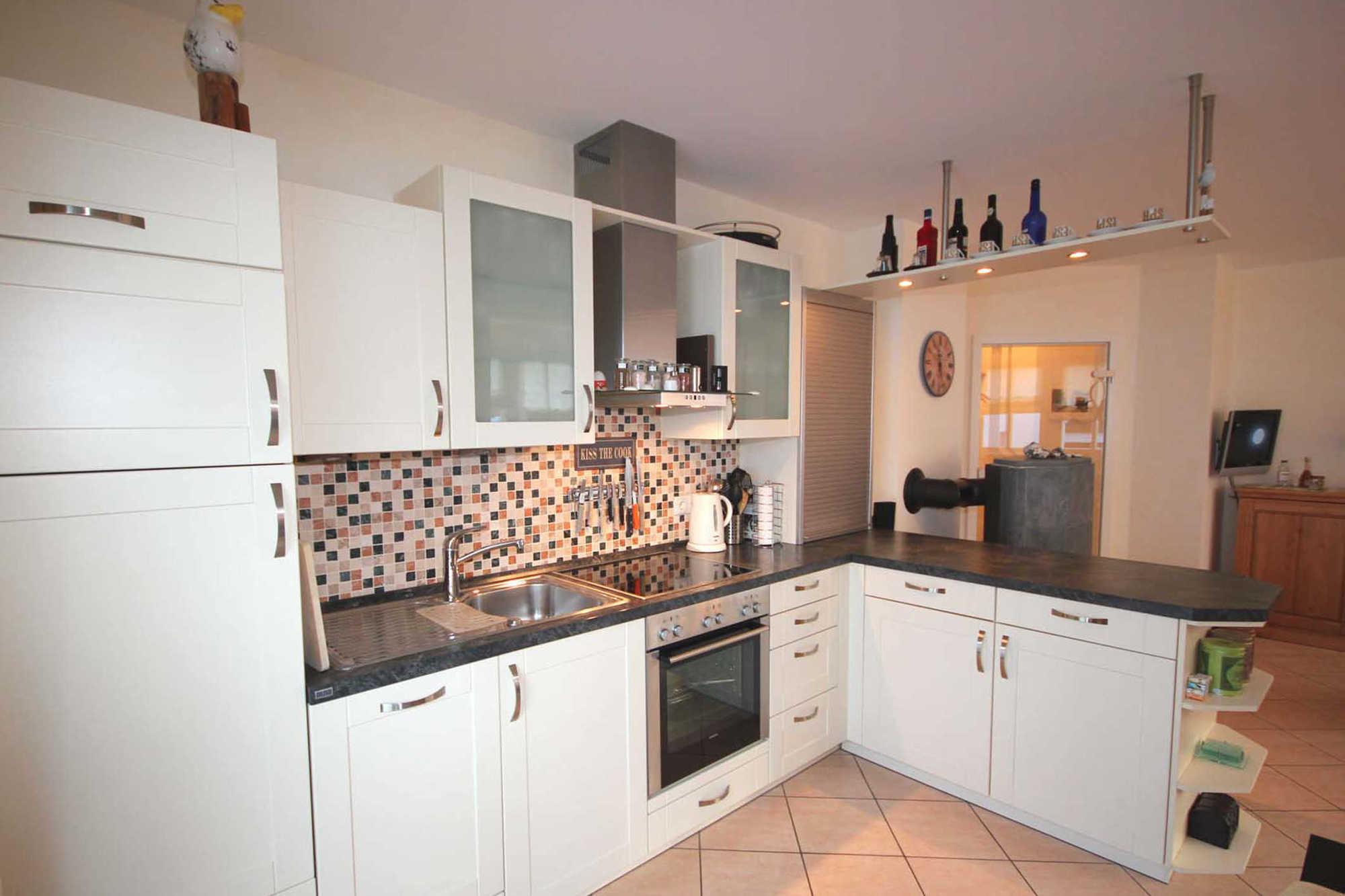 Die hochwertig ausgestattete Küchenzeile mit Essplatz verfügt über einen Backofen, Ceranfeld, Geschirrspüler, Kaffeemaschine, Toaster, Wasserkocher sowie weitere diverse Küchenhelfer. Das Hauptschlafzimmer ist mit einem Doppelbett, Kleiderschrank sowie einer Kommode ausgestattet.