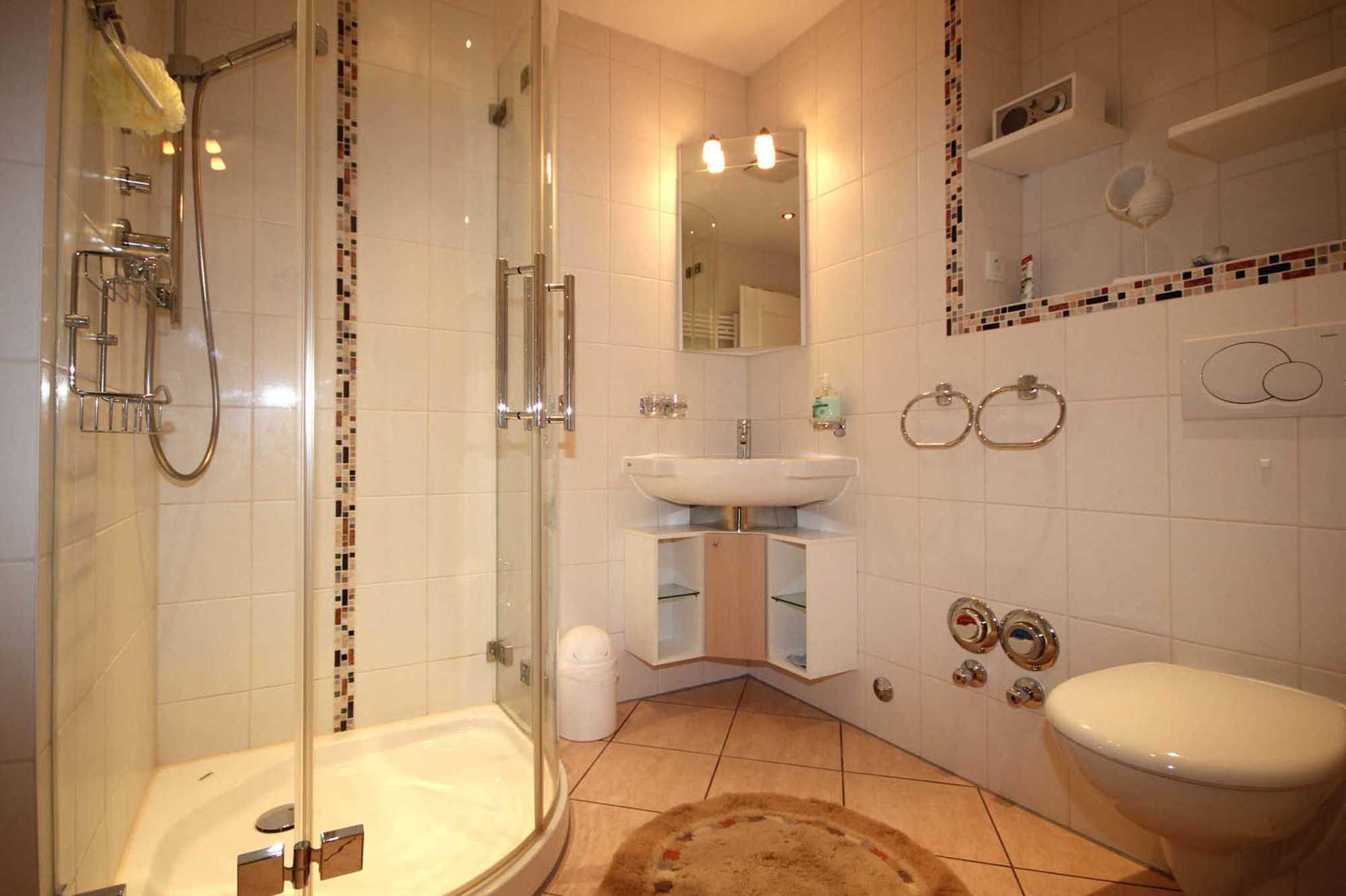 Im hellen Badezimmer finden Sie eine Glasdusche, Waschtisch, WC und Radio vor.