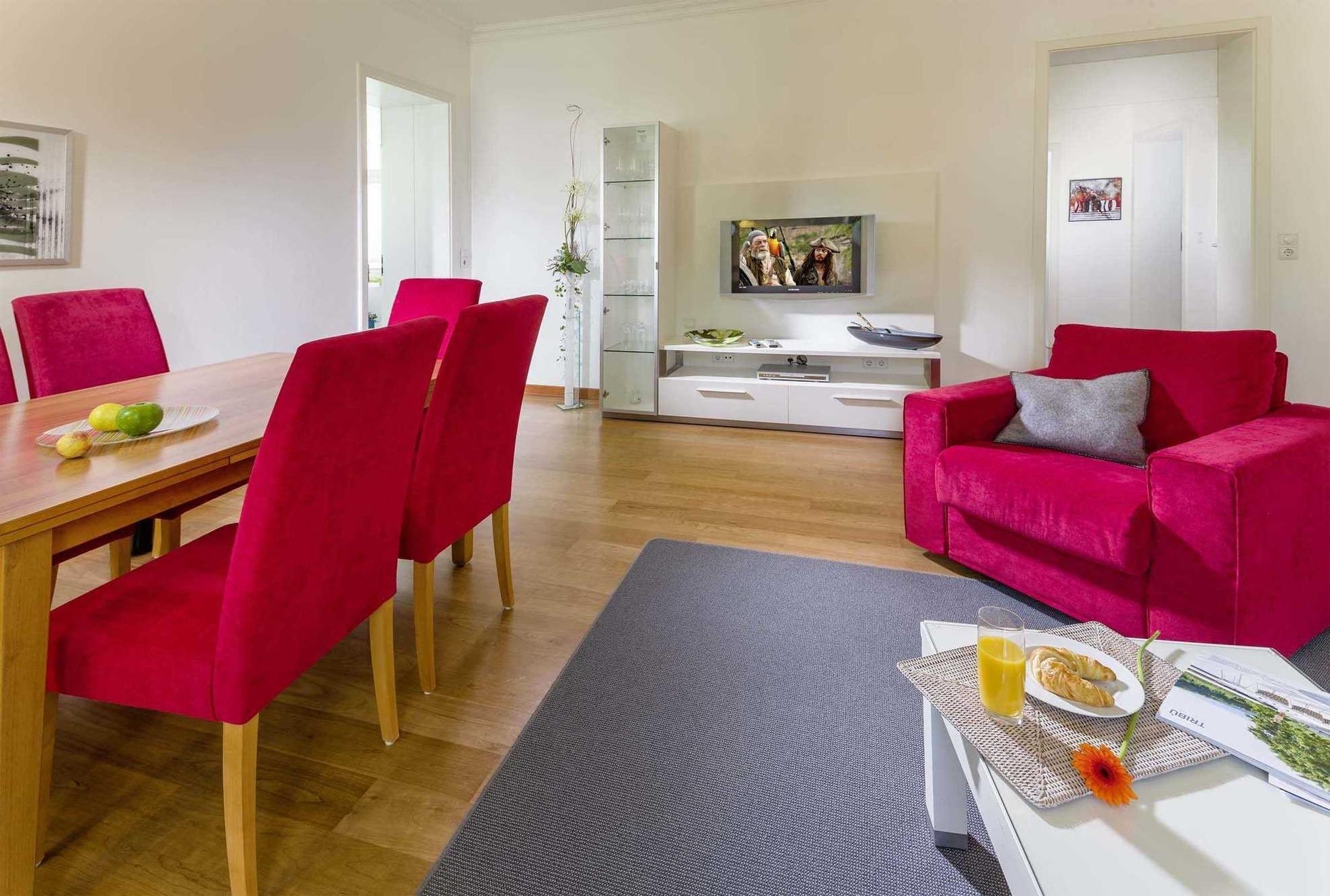 Neben dem schön eingerichteten Wohnraum gibt es eine separate Küche, zwei großzügige separate Schlafräume und zwei Badezimmer mit Waschtisch, Dusche und WC. In beiden Schlafräumen befindet sich jeweils ein Doppelbett und ein Kleiderschrank. Im Wohnraum können auf dem Schlafsofa zwei Personen schlafen. Sie finden dort auch ein Telefon und TV mit Plasmabildschirm und DVD-Player. Die Küche ist mit Geschirrspülmaschine, Ceranfeld, Backofen, Mikrowelle, Kühlschrank und diversen Kleingeräten komplett ausgestattet. Ein PKW-Stellplatz steht Ihnen direkt am Haus zur Verfügung.