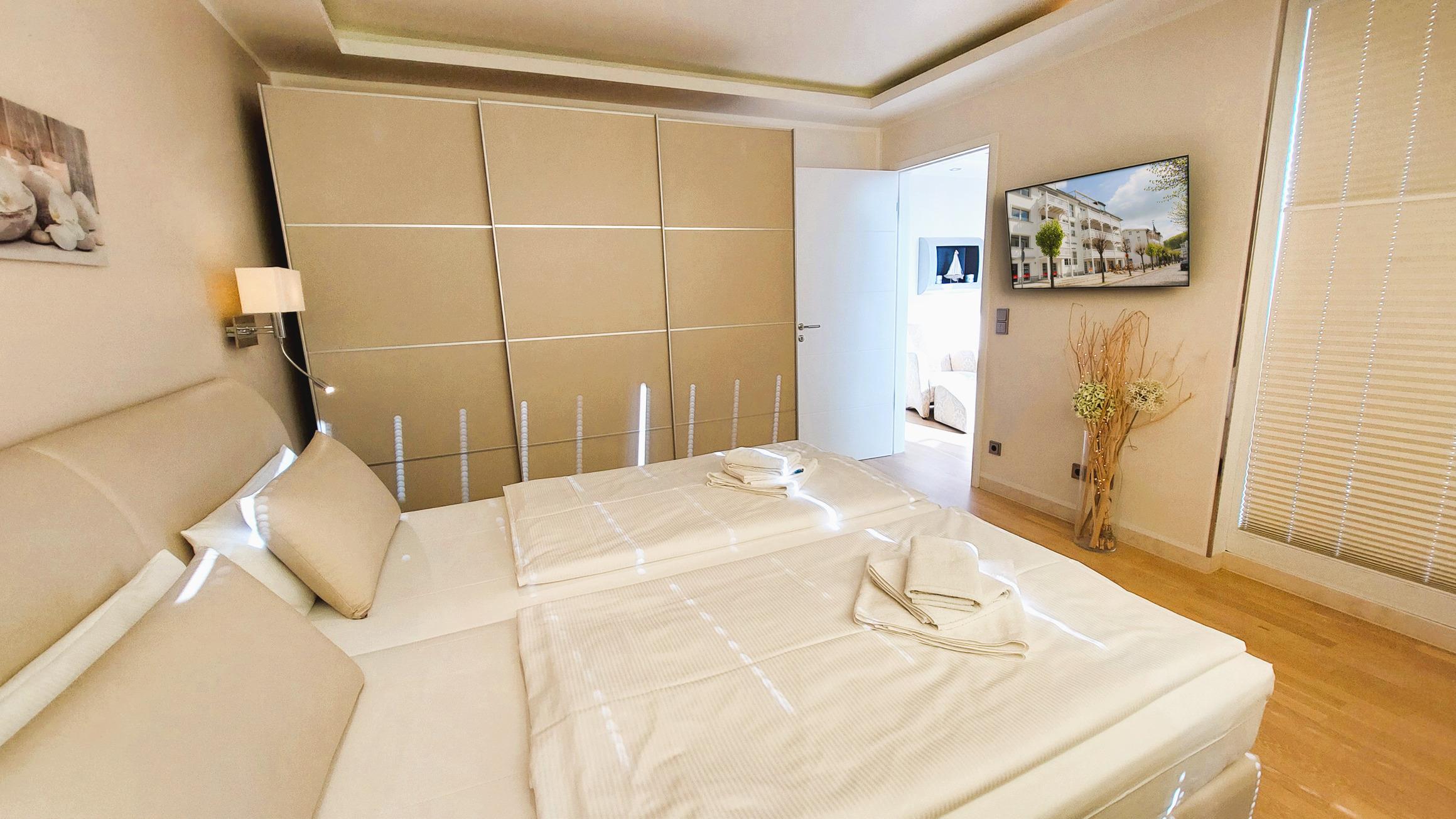 Das großzügige Schlafzimmer bietet ein hochwertiges Boxspringbett, einen Schiebetürenschrank und einen weiteren Flachbild-TV.