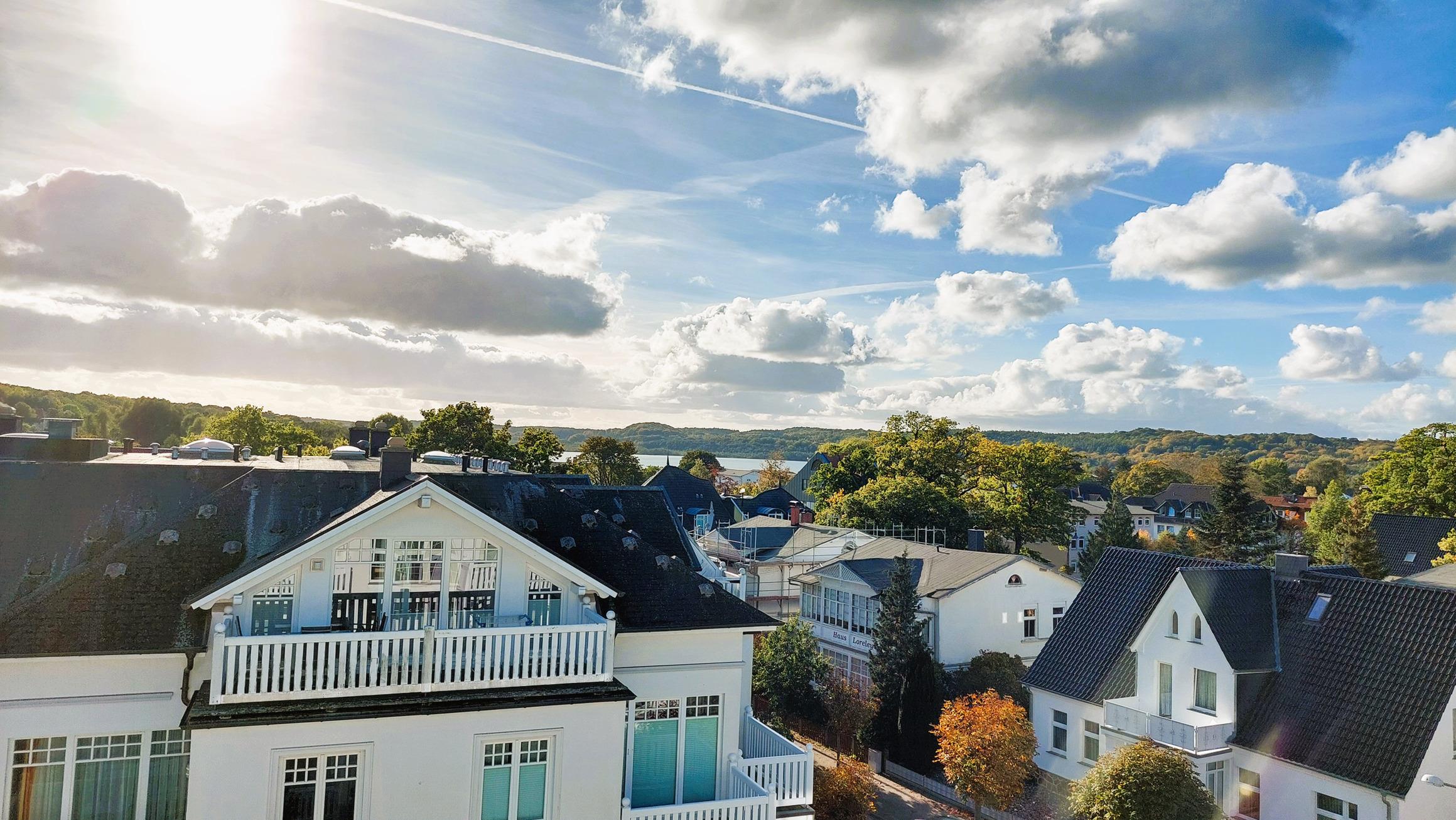 Das moderne Fenstersystem liefert diverse Möglichkeiten zum Öffnen und Verdunkeln sowie einen wunderschönen Blick über die Dächer von Binz bis hin zum Schmachter See.