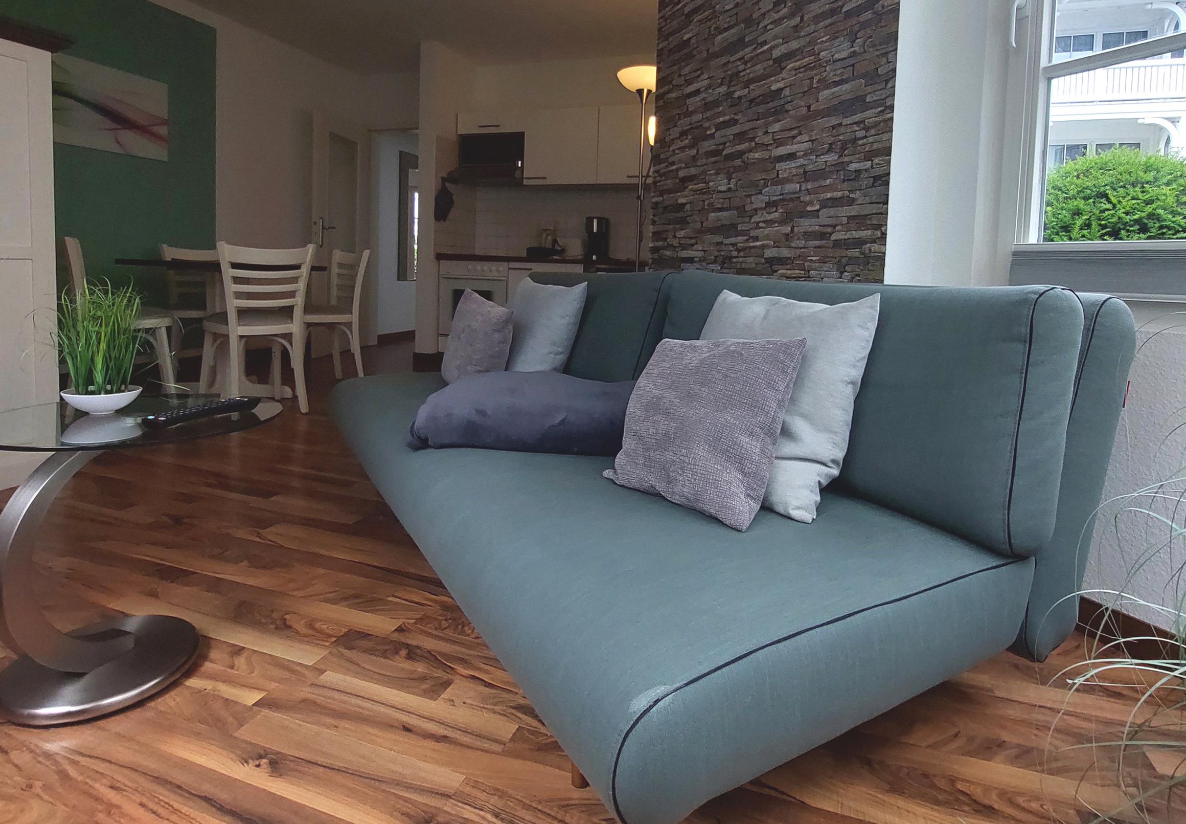 Ihre Ferienwohnung 12RB3 befindet sich im Erdgeschoss der Villa und ist für bis zu 4 Personen ausgestattet. Sie hat eine Größe von ca. 44 m² und verfügt über zwei Terrassen. Die Wohnung hat neben dem Wohnraum mit integrierter Kochzeile einen separaten Schlafraum, Flur und ein helles Tageslichtbad mit Waschtisch, Dusche und WC. Im Schlafraum befinden sich ein Doppelbett, Kleiderschrank, Zugang zur Terrasse sowie ein Flachbild-TV. Im Wohnraum finden Sie neben der Sitzecke mit Schlaffunktion einen separaten Essplatz, TV, Musikanlage mit CD-Player und WLAN. Vom Wohnbereich gelangen zu einer weiteren Terrasse. Die Küchenzeile ist mit Geschirrspülmaschine, Backofen, Kühlschrank, Mikrowelle, Kaffeemaschine, Toaster, Wasserkocher und diversen Kleingeräten komplett ausgestattet. Ein wohnungseigener Stellplatz steht für Sie direkt in der Tiefgarage zur Verfügung. Ebenso befindet sich ein abschließbarer Fahrradraum im Keller des Hauses.
