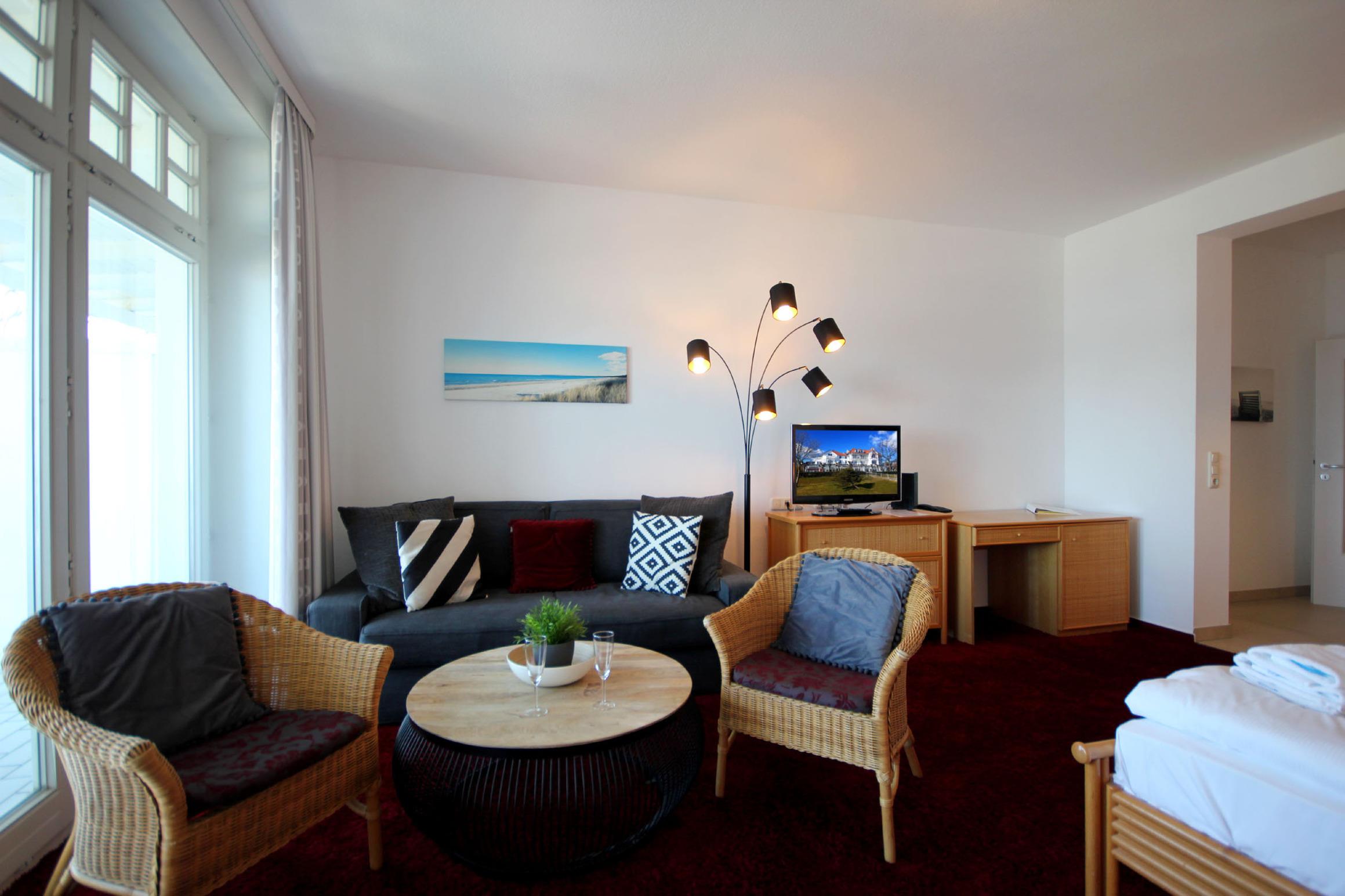 Ihre 1-Zimmer Ferienwohnung 225RB22 befindet sich im 2. Obergeschoss, ist ca. 45 qm groß und für bis zu 4 Personen gut geeignet. Neben dem kombinierten Wohn- und Schlafraum mit Doppelbett sowie Schlafsofa, auf dem die 3. und 4. Person gut schlafen können, gehört ein Essbereich, Flachbild TV sowie WLAN zur Nichtraucherwohnung. Vom überdachten Balkon haben Sie einen wundervollen Meerblick. Ebenfalls können Sie eine voll ausgestattete integrierte Küchenzeile mit Geschirrspüler, Nespresso-Maschine, Backofen, Mikrowelle, Wasserkocher, Toaster und Kaffeemaschine nutzen. Das Badezimmer erwartet Sie mit Waschtisch, WC und Dusche. Haustiere sind herzlich willkommen. Ein PKW-Stellplatz für Ihren PKW ist direkt am Haus vorhanden.