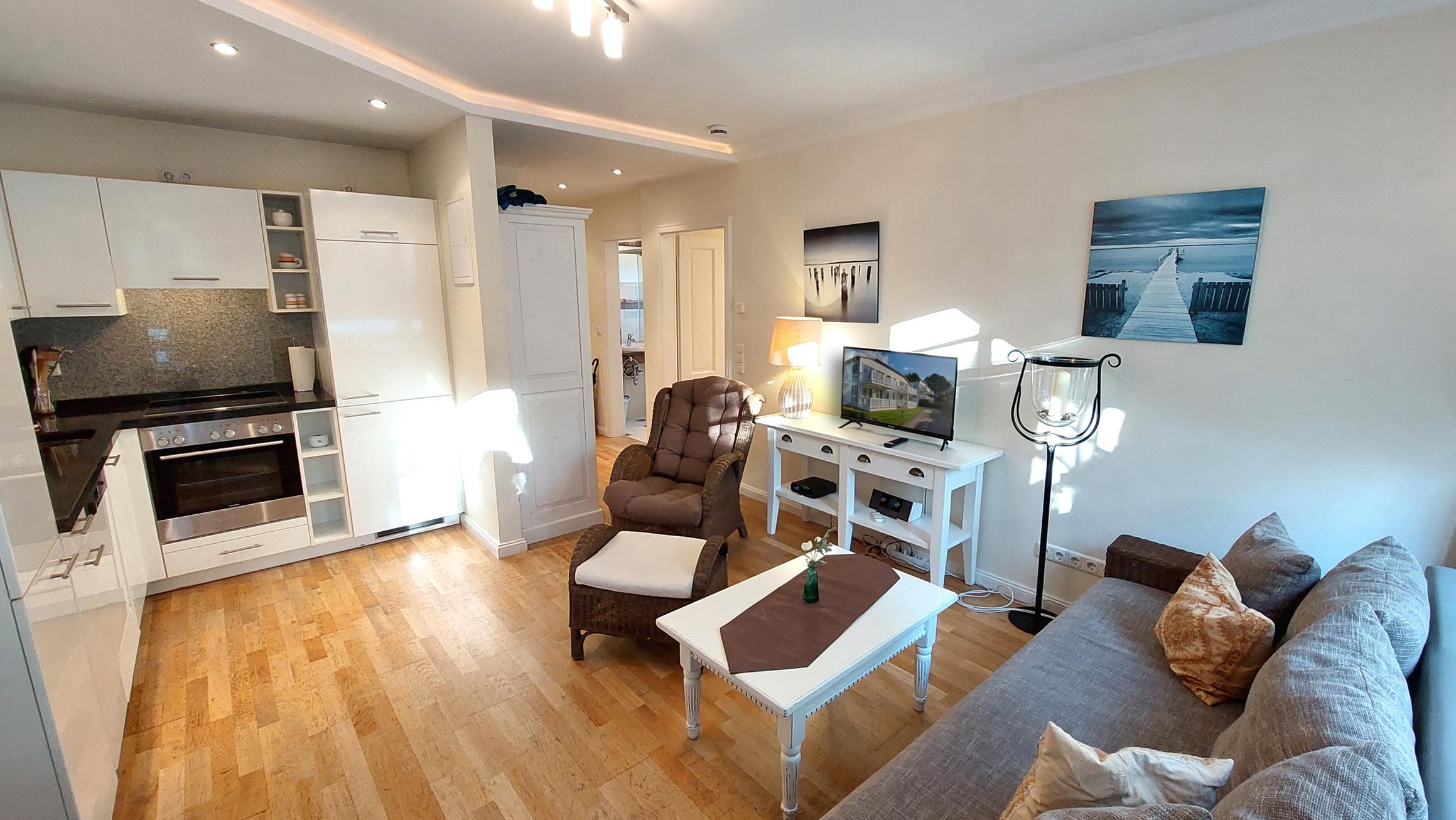 Die Ferienwohnung ist aufgeteilt in einen gemütlichen Wohnraum, eine offene moderne Markeneinbauküche mit Granitarbeitsplatte, ein Schlafzimmer und ein Duschbad mit Waschtisch und WC. Das Wohnzimmer ist mit einem Essplatz und einer Sitzgruppe, die auch eine Schlafgelegenheit für die 3. Person bietet, möbliert. Die technische Ausstattung beinhaltet ein Fernsehgerät. Die Küche ist mit Kühlschrank, Backofen, Ceranfeld, Geschirrspüler und weiteren Elektrogeräten komplett ausgestattet. Das Schlafzimmer verfügt über ein Doppelbett und einen Kleiderschrank. Ab sofort können all unsere Gäste einen kostenfreien WLAN-Zugang nutzen.