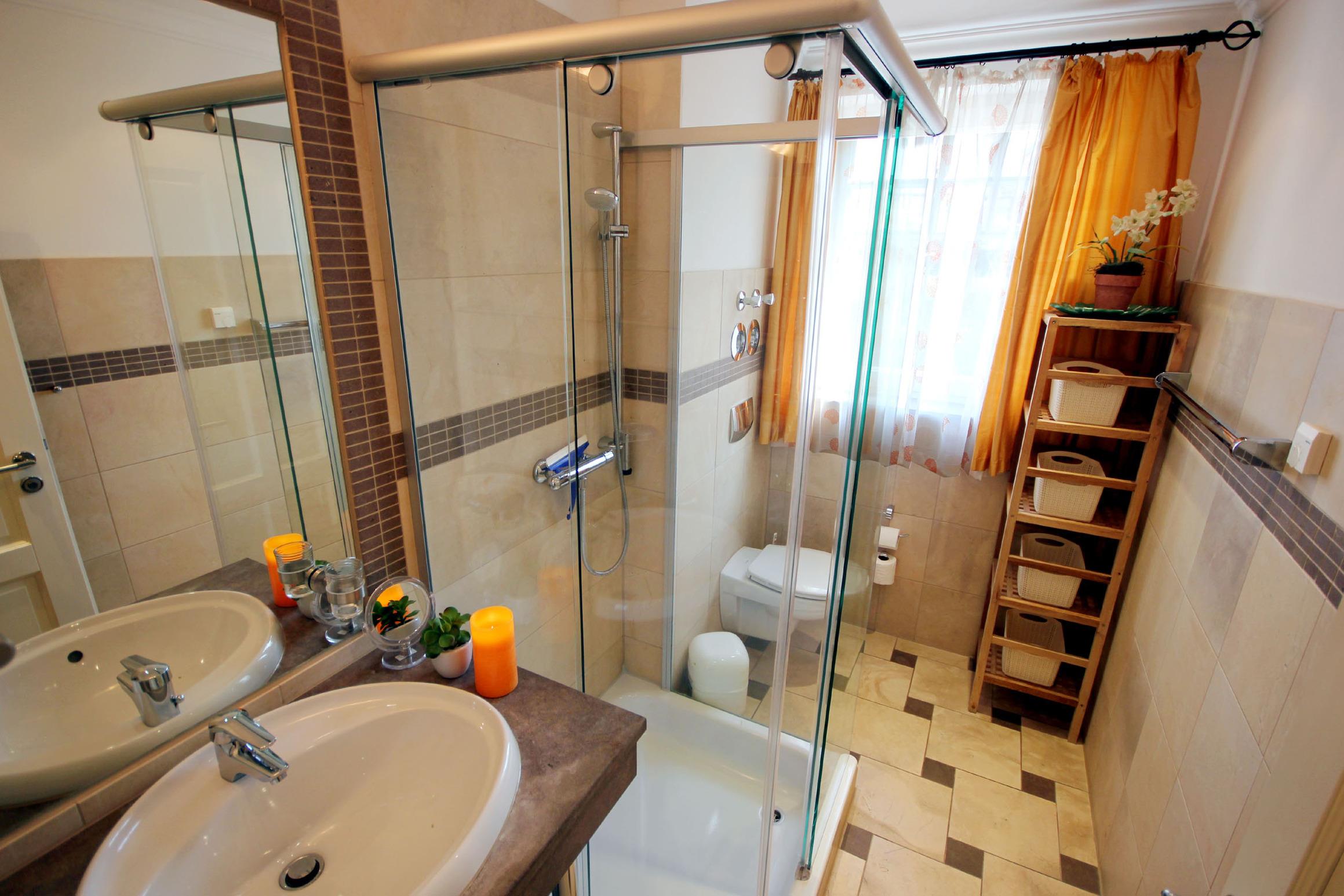 Die Ferienwohnung ist aufgeteilt in einen gemütlichen Wohnraum, eine offene moderne Markeneinbauküche mit Granitarbeitsplatte, ein Schlafzimmer und ein Tageslichtbad mit Glasdusche, Waschtisch und WC.