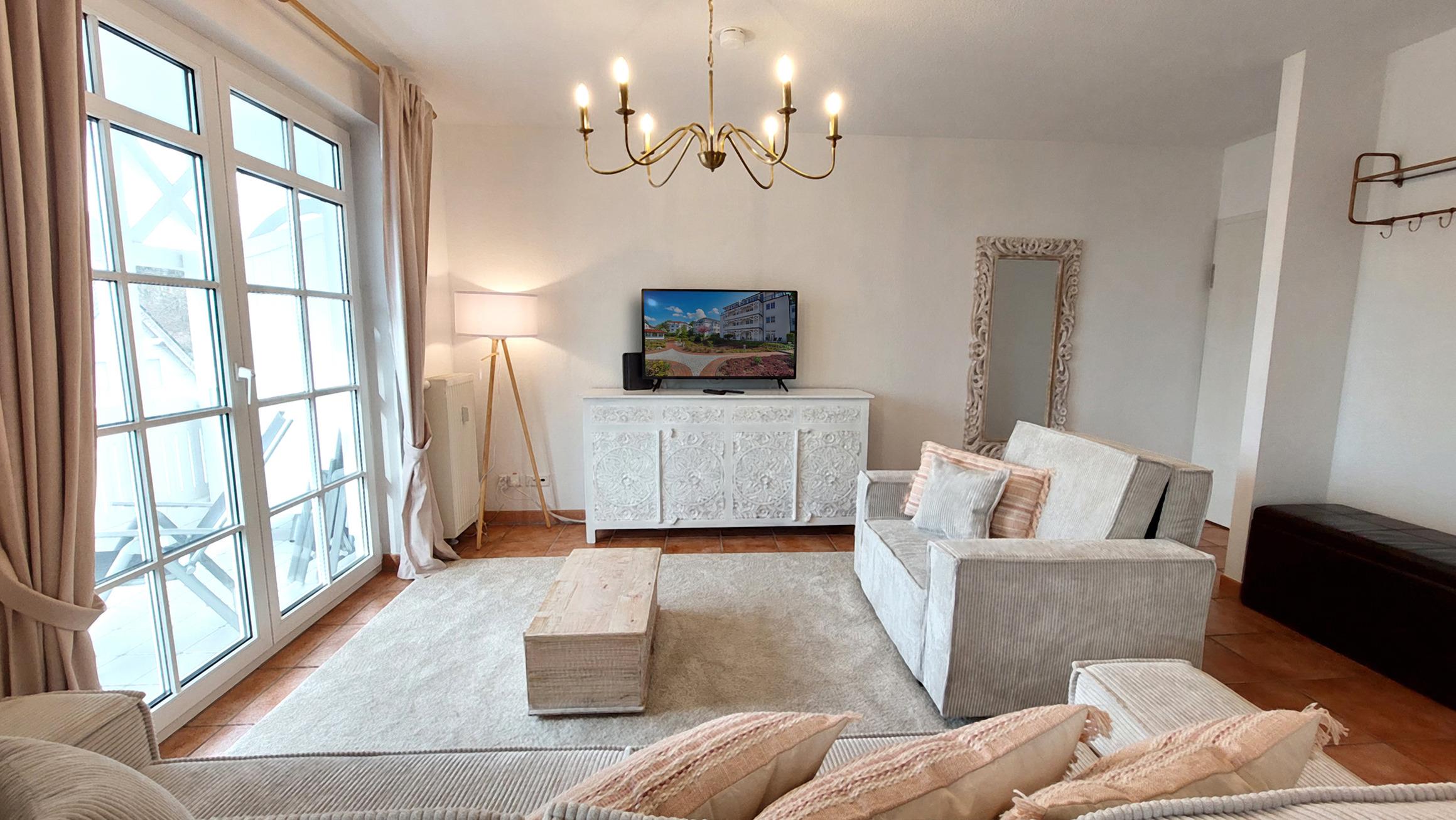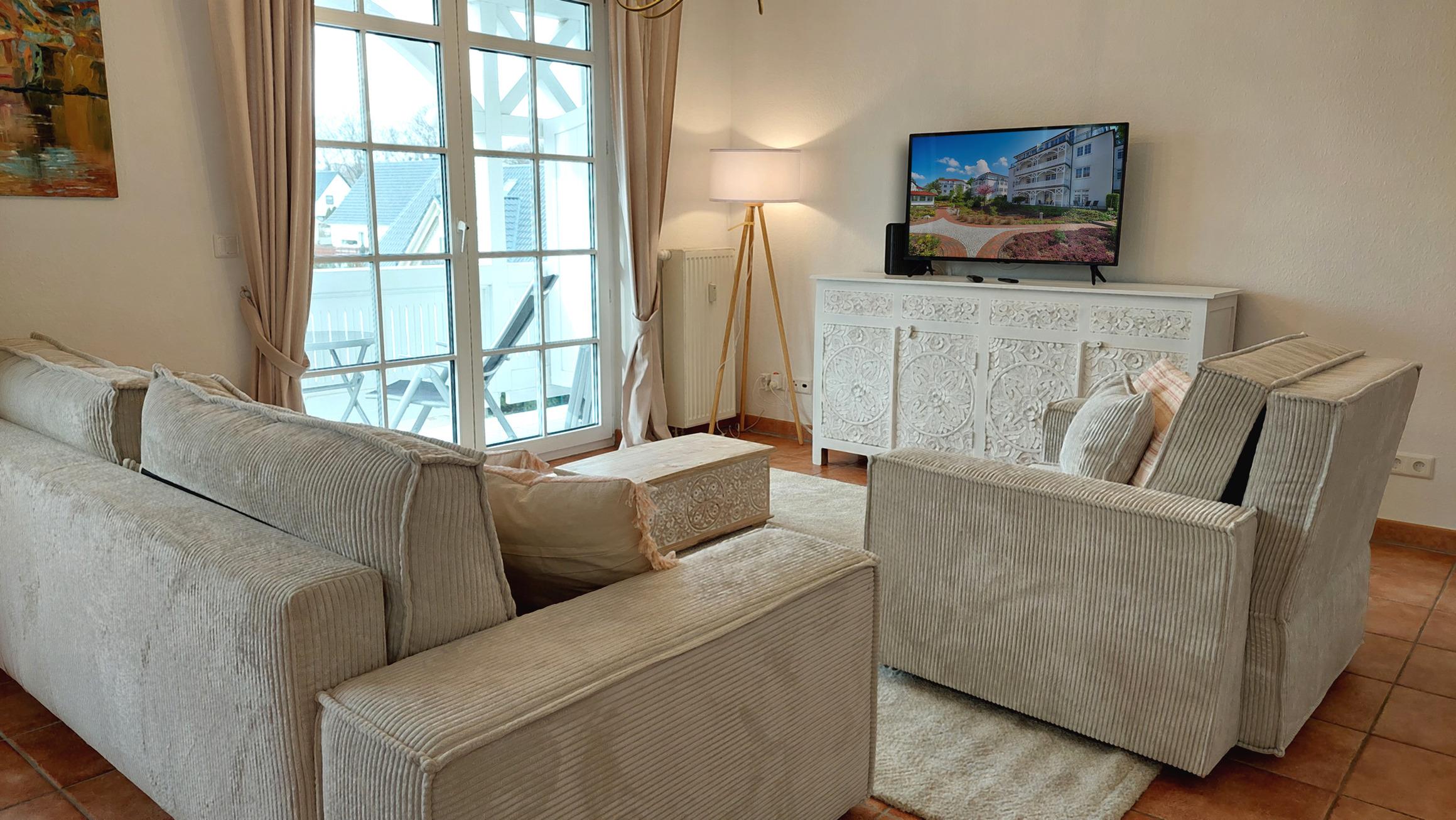 Der helle Wohnbereich verfügt über eine einen Smart-TV sowie eine bequeme Sitzlandschaft, welche bei Bedarf weitere Schlafgelegenheiten bietet.