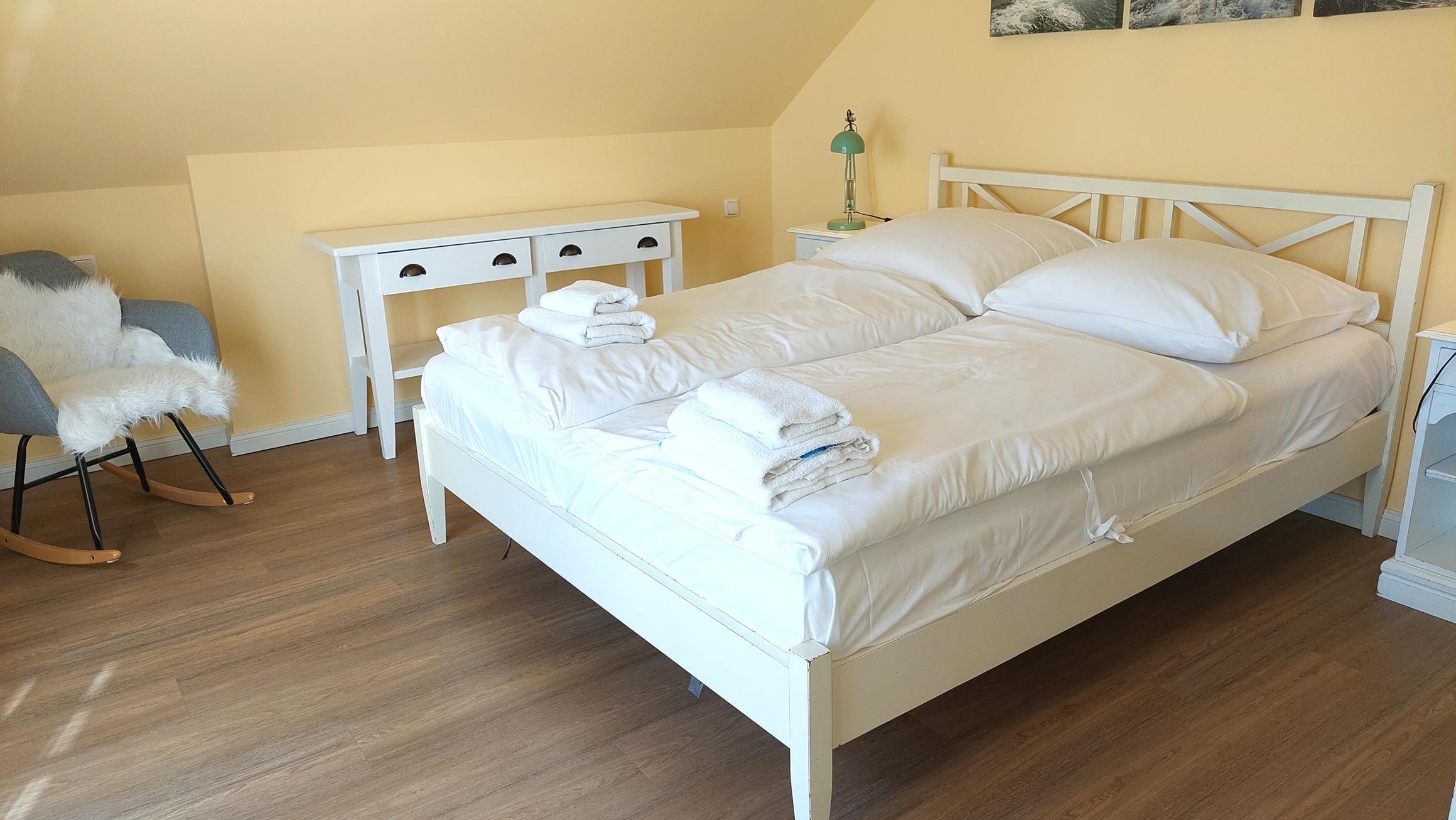 Im Wohnraum können auf dem großen Schlafsofa zwei weitere Personen schlafen. Die gesamte Wohnung ist mit hochwertigen Möbeln aus weiß gebürsteter Pinie im Villagestil eingerichtet. Im Wohnraum befindet sich ein Smart-TV und Radio/CD-Spieler, Sitz- und Essplatz sowie die halboffene Küche mit Geschirrspülmaschine, Backofen, Herd, Kühlschrank und diversen Kleingeräten.