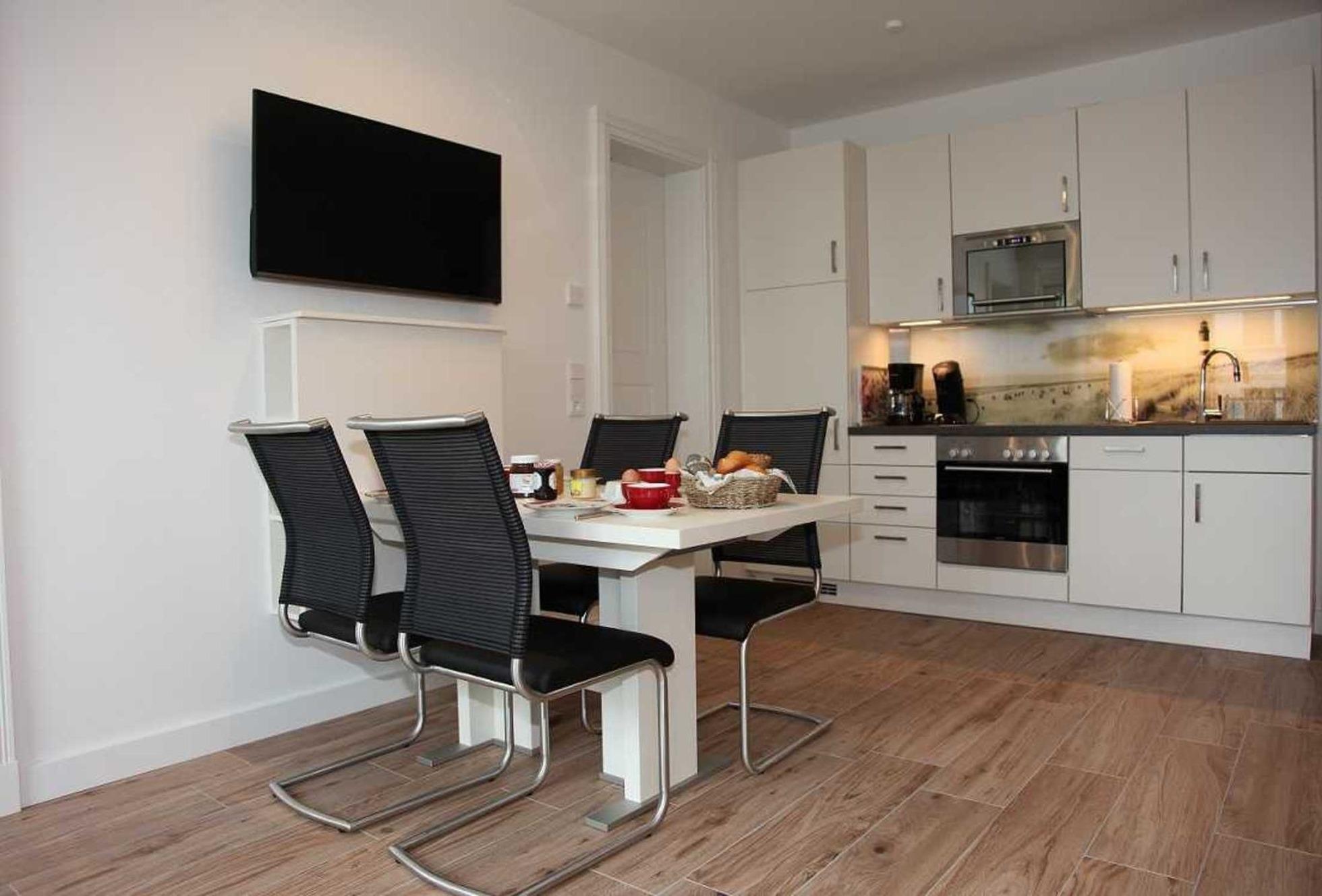 Ihre exklusive Wohnung mit Fußbodenheizung und Südbalkon verfügt über einen vorgelagerten Flur mit Garderobe, einen großzügigen Wohnbereich, zwei Schlafzimmer, eine Wohnküche und ein Bad. Im Wohnbereich erwartet Sie eine gemütliche Sitzgruppe sowie ein Essbereich. Die technische Einrichtung umfasst einen Flachbildfernseher, einen DVD-Player, Musikanlage, ein Telefon für kostenfreie Festnetztelefonie sowie einen gebührenfreien W-LAN-Zugang. Im Küchenbereich finden Sie einen Backofen, Cerankochfeld, Mikrowelle, Geschirrspüler, Kühlschrank mit Gefrierfach, Kaffeemaschine sowie Senseo Padmaschine und weitere Küchenhelfer wie Wasserkocher und Toaster vor. Beide Schlafzimmer verfügen über einen Flachbildfernseher sowie Kleiderschrank mit Kommode. Das Hauptschlafzimmer zeichnet sich durch ein Boxspringbett aus. Im zweiten Schlafbereich mit Verdunklungsmöglichkeit finden Sie zwei Einzelbetten vor. Das Bad ist mit einer Dusche, Waschtisch, WC und Fön ausgestattet.