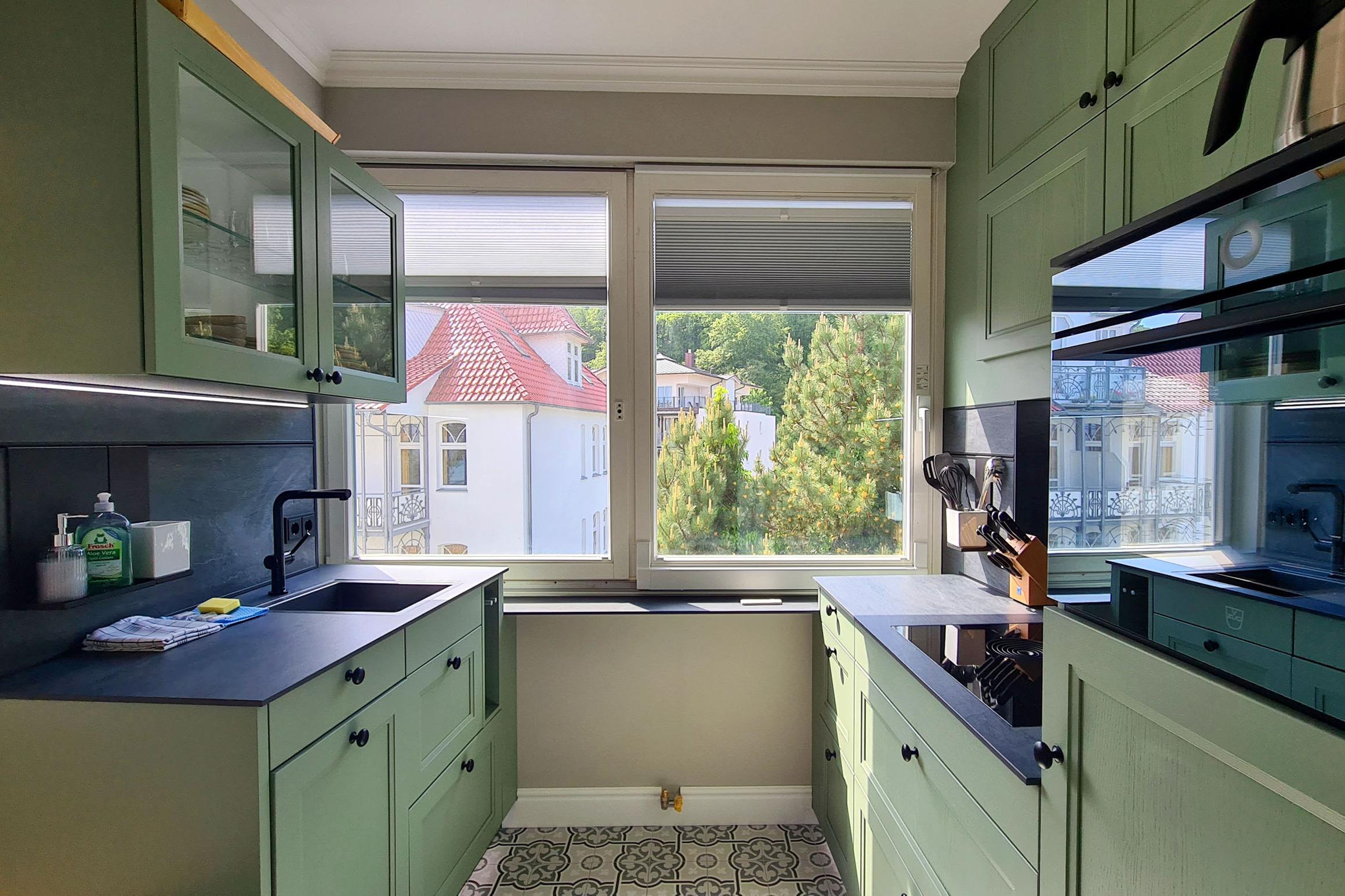 Ihre stilvoll eingerichtete 2,5 - Raum - Meerblickwohnung 40RB32 (Nichtraucher) mit einer Größe von ca. 75 qm liegt im 2. Obergeschoss der Villa und ist mit bis zu 4 Personen belegbar. Das hochwertig möblierte Appartement besticht durch seine hervorragende Lage. Der lichtdurchflutete, großzügige Wohnbereich bietet Ihnen eine gemütliche Sitzgruppe, Flachbild-TV, Sonos-Soundsystem, WLAN, einen separaten Essbereich und den direkten Zugang zum Balkon in Richtung Ostsee. An den Wohnbereich schließt die offene Wohnküche an, die mit Geschirrspüler, Kühl- / Gefrierkombination, Backofen, Cerankochfeld, Kaffeemaschine, Wasserkocher, Toaster und diversen anderen Küchenhelfern komplett ausgestattet ist. Im Hauptschlafraum befindet sich ein bequemes Boxspringbett (180x200) und ein großer Kleiderschrank mit genügend Stauraum. Der 2. Schlafraum im angrenzendem Wintergarten erwartet Sie mit einem Schlafsofa. Im modernen Badezimmer finden Sie neben Waschtisch, Dusche und WC auch einen Handtuchheiztrockner. Ein wohnungseigener Stellplatz (Doppelparker Einfahrtshöhe max.1,70m) steht Ihnen direkt an der Villa zur Verfügung. Rundum eine schön eingerichtete Wohnung, die zum Entschleunigen einlädt. Genießen Sie Ihren Urlaub und machen Sie diese Wohnung zu Ihrem zweiten Zuhause!