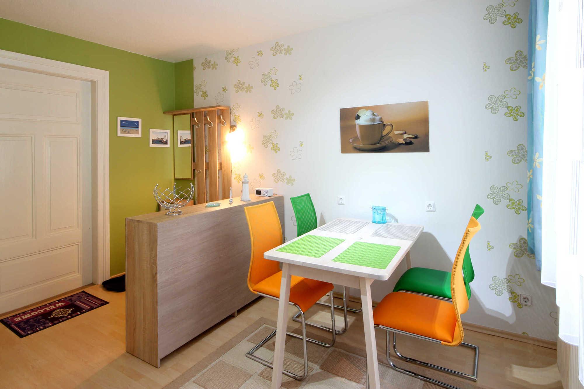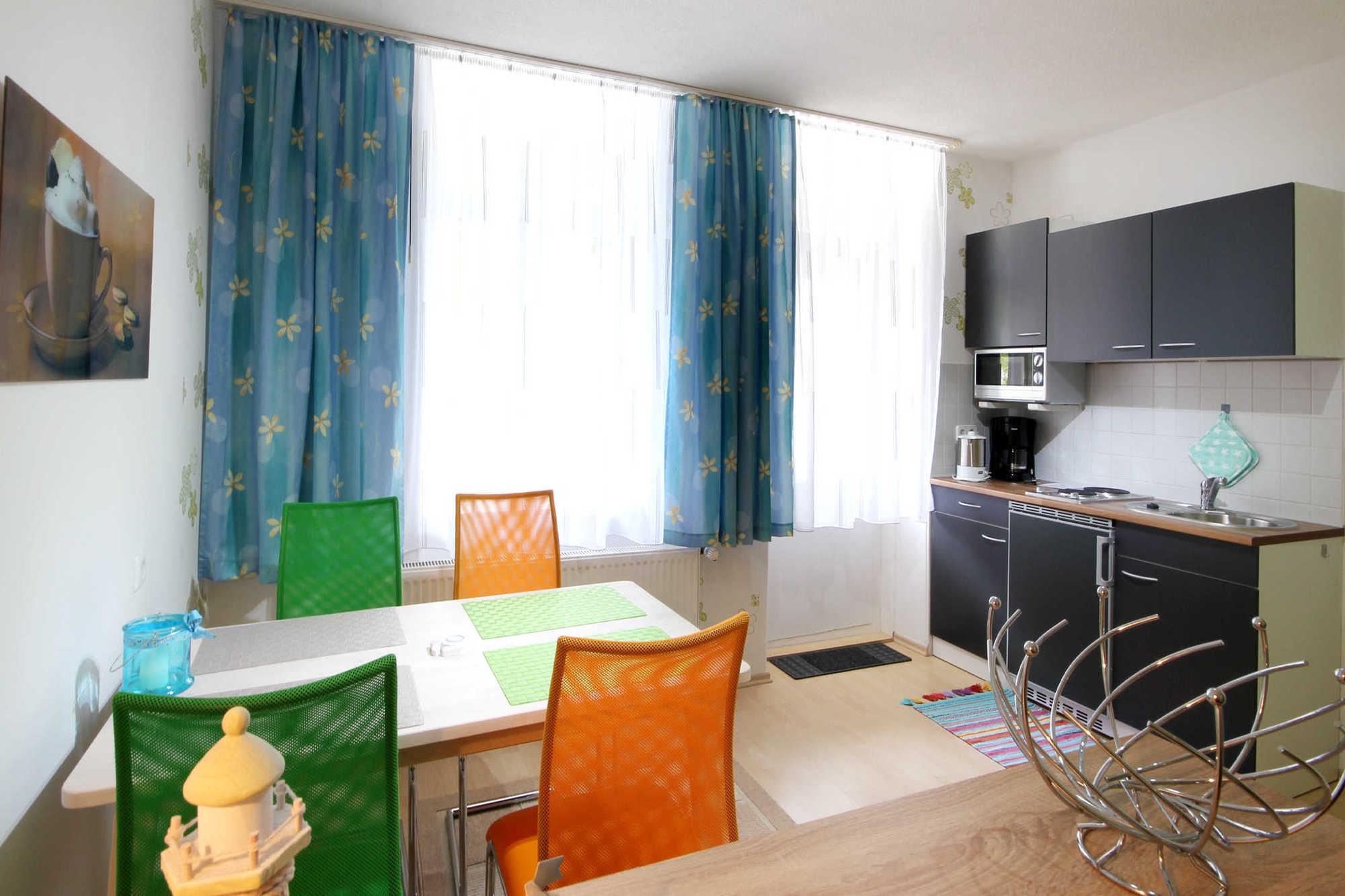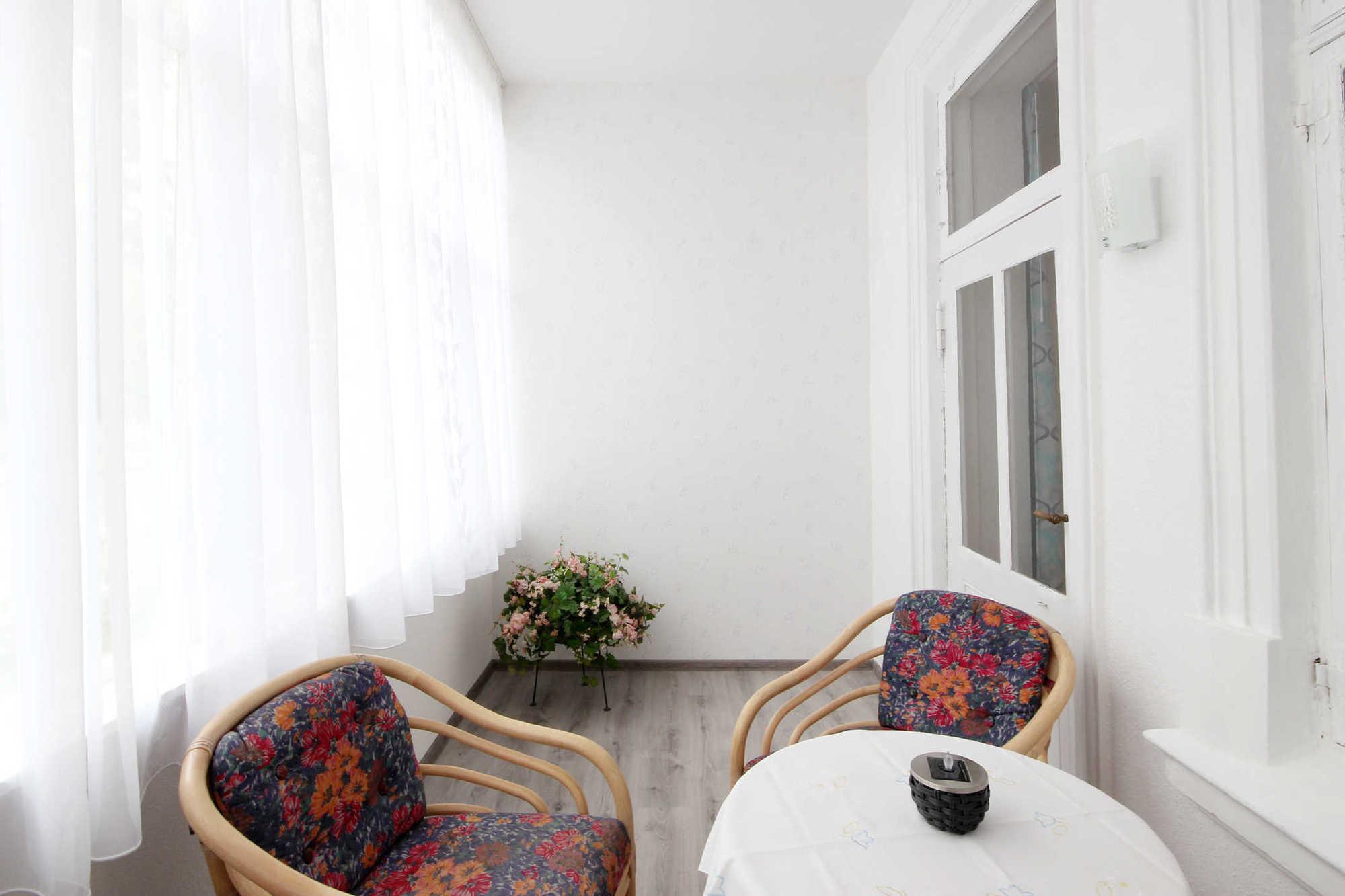 Ihre Ferienwohnung 218RB1 (Nichtraucher)befindet sich Hochparterre in der Villa Wilhelmshöhe. Die 2 - Zimmer - Wohnung hat eine Größe von ca. 44 qm und ist mit bis zu 3 Personen belegbar. Nicht nur der großzügige Balkon sondern auch der beheizbare Wintergarten in Richtung Osten laden zum Verweilen ein. Neben dem Wohnraum mit offener Küche und Essplatz, gibt es einen separaten Schlafraum, sowie ein Badezimmer mit Waschtisch, Dusche, Fön und WC. Der Schlafraum ist mit einem Doppelbett, einem Einzelbett für die 3. Person, einem Kleiderschrank mit Kommode und einem Flachbildfernseher ausgestattet und bietet den direkten Zugang zum Wintergarten. Die Küche verfügt im Detail über ein 2-Platten-Kochfeld, einen Kühlschrank mit Gefrierfach, Mikrowelle, Kaffeemaschine, Wasserkocher und diverse andere „Küchenhelfer". Von der Küche gelangen Sie auf den Balkon. Highlights: Ein kostenloser Internetzugang und ein wohnungseigener PKW-Stellplatz stehen Ihnen für die Zeit Ihres Aufenthaltes zur Verfügung. Im Garten befindet sich eine Wäschespinne, die Sie gern nutzen dürfen.