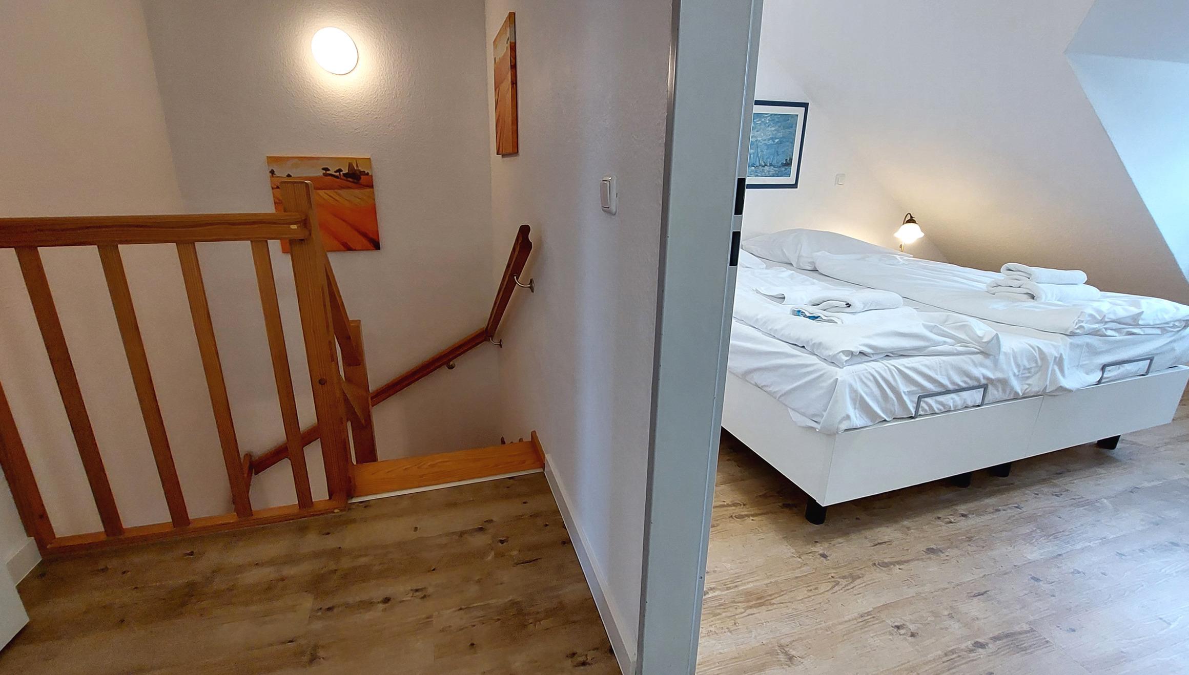 Die Maisonette-Wohnung teilt sich auf in einen freundlichen Flurbereich mit integrierter Wohnküche und Essbereich. Die Küchenzeile beinhaltet u.a. einen Geschirrspüler, Kochfeld, Mikrowelle, Kaffeemaschine, Wasserkocher und Toaster. Zudem erwartet Sie ein Tageslichtbad mit Dusche sowie der Wohnraum mit Balkonzugang. Im Wohnbereich finden Sie neben der Sitzgruppe mit Schlafsofa mit großem Smart-TV sowie WLAN. Über eine Wendeltreppe gelangen Sie in das 3. Obergeschoss, welches Sie mit einem zusätzlichen Duschbad und zwei separaten Schlafräumen begrüßt.