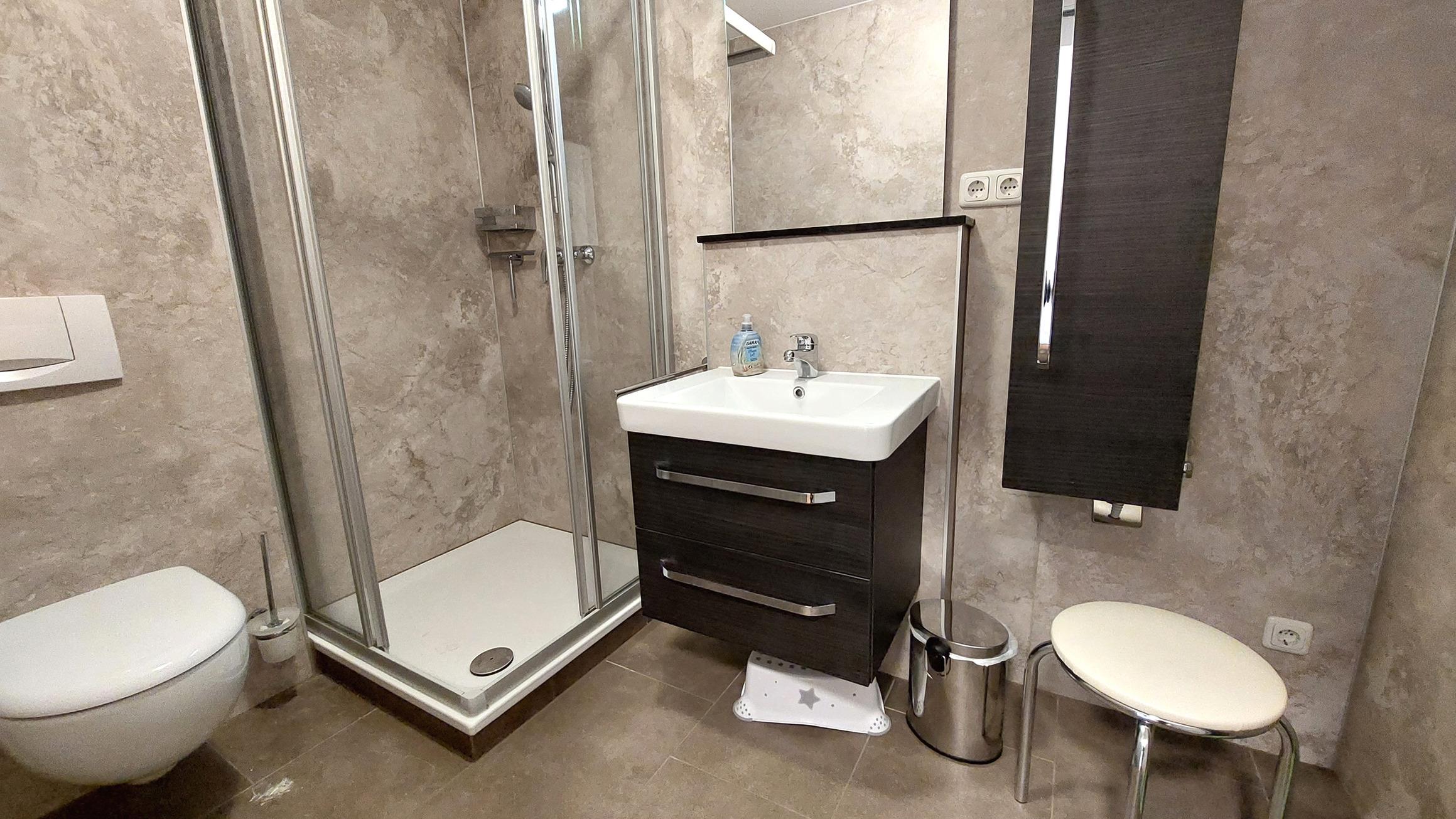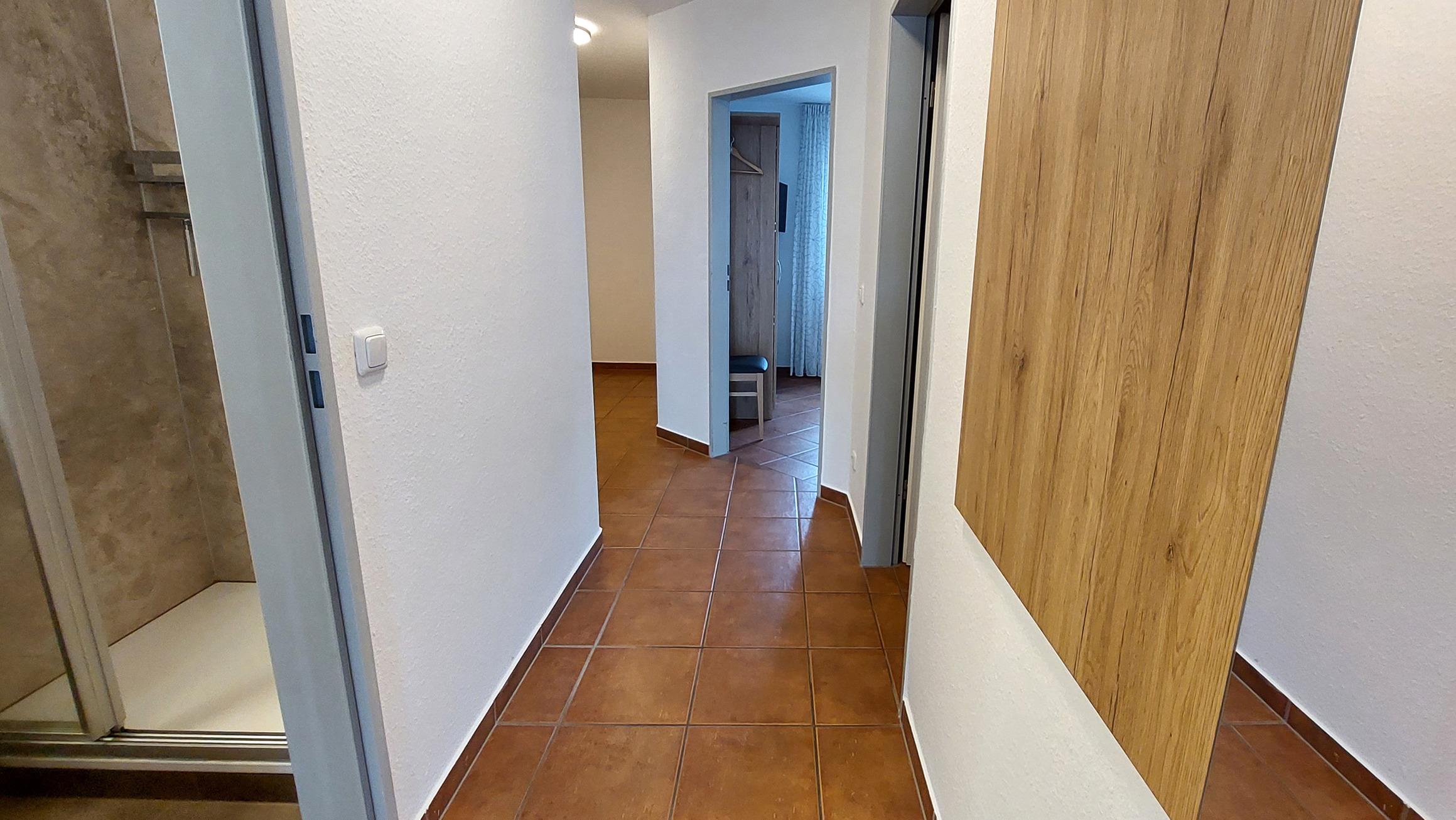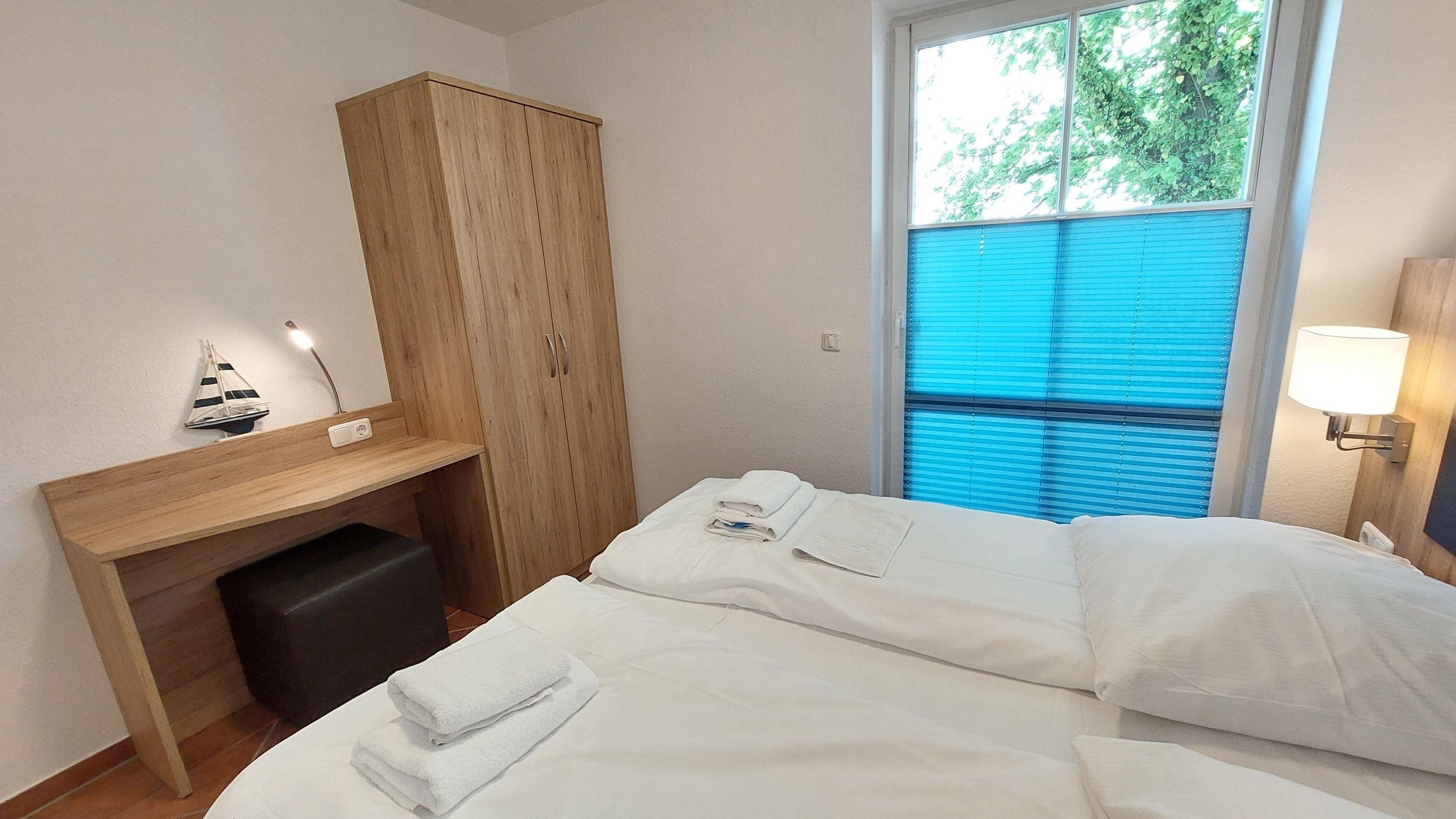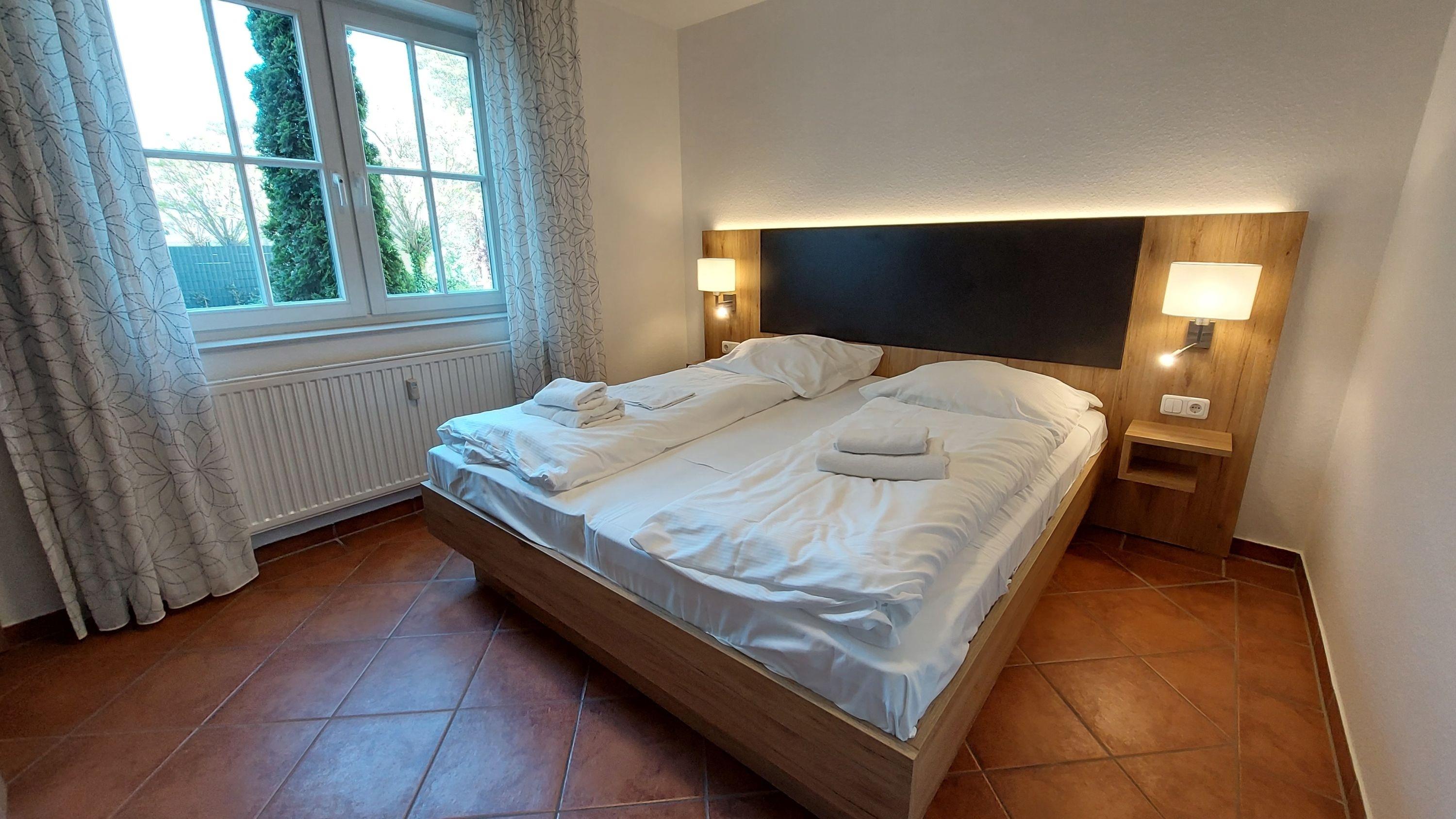 Die beiden Schlafräume sind jeweils mit einem Doppelbett und Kleiderschrank ausgestattet. Im Hauptschlafzimmer finden Sie einen zusätzlichem TV. Das kleinere Schlafzimmer verfügt über einen Schreibtisch und ein fusshohes großes Fenster ("franz. Balkon"). Beide Schlafzimmer sind durch die elektrischen Außenjalousien verdunkelbar. Die Badezimmer verfügen jeweils über Waschtisch, Dusche und WC. Die Küchenzeile beinhaltet u.a. einen Geschirrspüler, Kochfeld, Kaffeemaschine, Wasserkocher und Toaster.