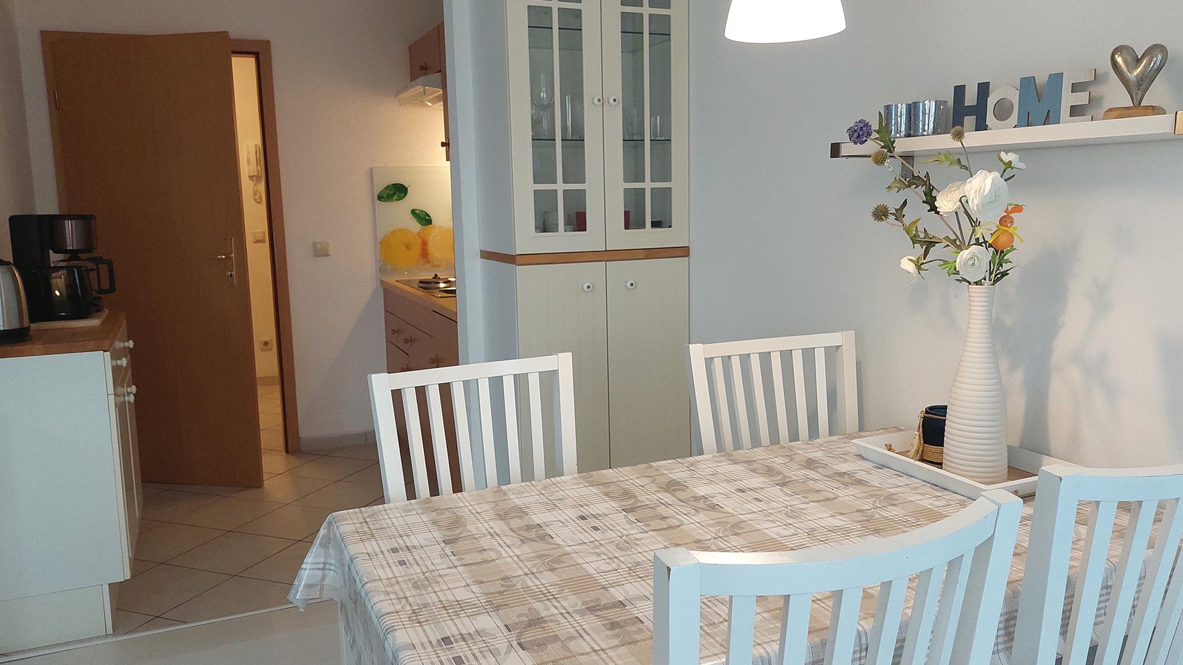 Ihre moderne 2-Zimmer-Nichtraucherwohnung 47RB2 hat eine Größe ca. 49 qm. Sie ist für bis zu 4 Personen eingerichtet und befindet sich im Erdgeschoss des Hauses. Von der Terrasse, in Richtung Südwest gelegen, genießen Sie abseits vom Straßenverkehr sonnige Momente. Die helle Wohnung teilt sich auf in einen Flur mit Garderobe, einen großzügigen Wohnraum mit Essbereich und integrierter Pantry-Küche, ein Tageslichtbad sowie ein Schlafzimmer. Im Wohnraum finden Sie neben der Wohnlandschaft mit Schlafsofa, welche die Schlafmöglichkeit für bis zu 2 weiteren Personen bietet, noch einen separaten Esstisch mit 4 Stühlen. Die Küchenzeile ist ausgestattet mit 2-Platten-Kocheld, Mikrowelle, Kühlschrank mit Gefrierfach, Kaffeemaschine, Wasserkocher und Toaster. Zur technischen Ausstattung gehören zwei Smart-TVs, stabiles WLAN und ein neues DAB+ - Radio mit CD-Laufwerk, Bluetooth, USB-Playback und Charging mit Fernbedienung vom Typ Digitradio 370 CD BT von TechniSat.
