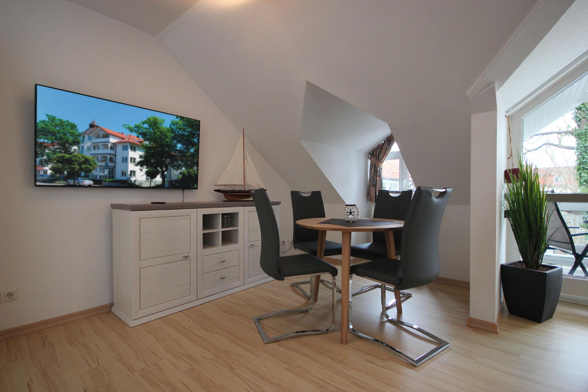 Ihre moderne 2-Zimmer-Nichtraucherwohnung 90804 Backbord hat eine Größe von ca. 40 qm und ist für bis zu 4 Personen eingerichtet. Sie befindet sich in der in der 2. Etage des Hauses und verfügt über einen überdachten Balkon nach Südwesten sowie einen Stellplatz im nahegelegenen Parkhaus Granitz. Die helle und gemütliche Wohnung teilt sich auf in einen Wohnraum mit direktem Zugang zum möblierten Balkon sowie eine komplette Küchenzeile, ein Badezimmer, ein Schlafraum und Flur mit Garderobe. Im Wohnraum finden Sie neben der Sitzgruppe mit Schlaffunktion noch einen separaten Essplatz. Ein Flachbildfernseher mit SMART-Funktion sowie WLAN gehören zur technischen Ausstattung. Der Schlafraum ist mit einem Doppelbett und einem großzügigen Kleiderschrank ausgestattet. Das Badezimmer erwartet Sie mit einem Waschbecken, Dusche, Haartrockner und WC. Die Küchenzeile beinhaltet u.a. ein Cerankochfeld, Kühlschrank mit kleinem Gefrierfach, Backofen, Geschirrspüler, Kaffeemaschine, Wasserkocher, Toaster sowie umfangreiches Kücheninventar. Ein Kinderhochstuhl ist auf Anfrage und je nach Verfügbarkeit bereitstellbar.
