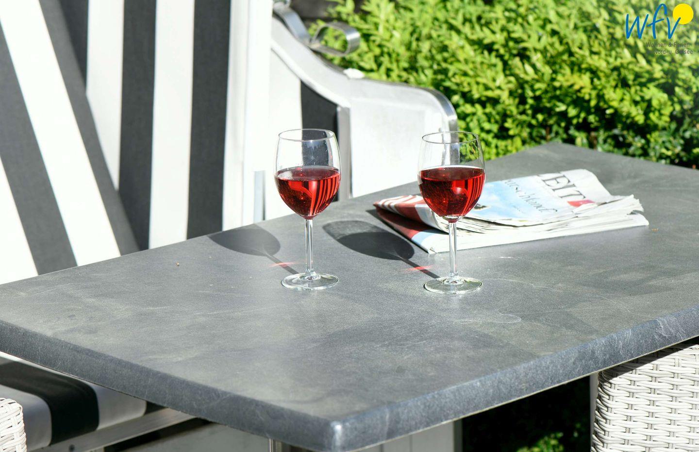 Vom Wohnbereich aus haben Sie Zugang zu Ihrer eigenen kleinen Terrasse. Durch ihre Ausrichtung nach Süden können Sie hier im Strandkorb ein herrliches Sonnenbad genießen - oder am Gartentisch eine Mahlzeit im Freien!