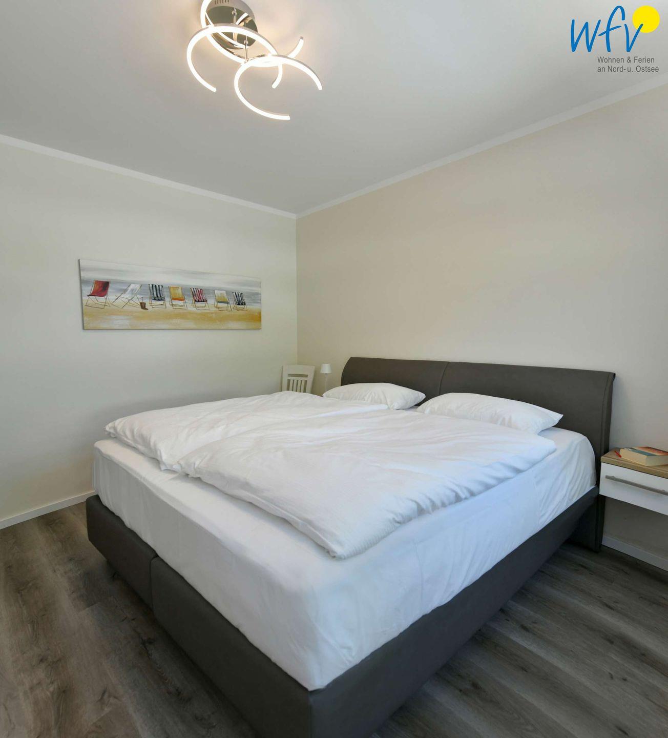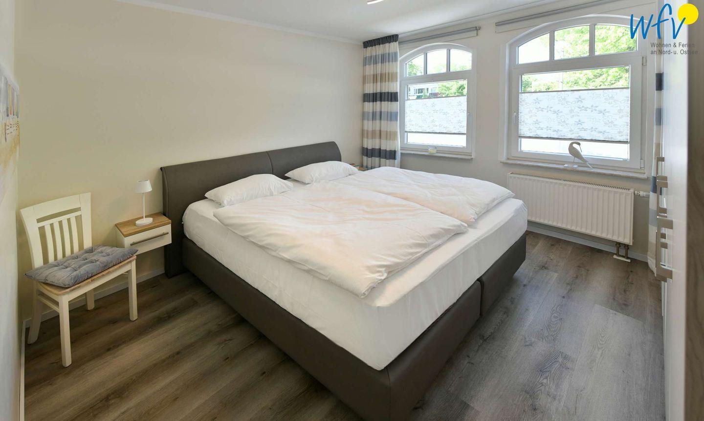 Das separate Elternschlafzimmer ist mit einem komfortablen Doppelbett ausgestattet. In dem anderen Zimmer befinden sich zwei Einzelbetten. In beiden Zimmern sind moderne Vinylböden in Holzoptik verlegt.