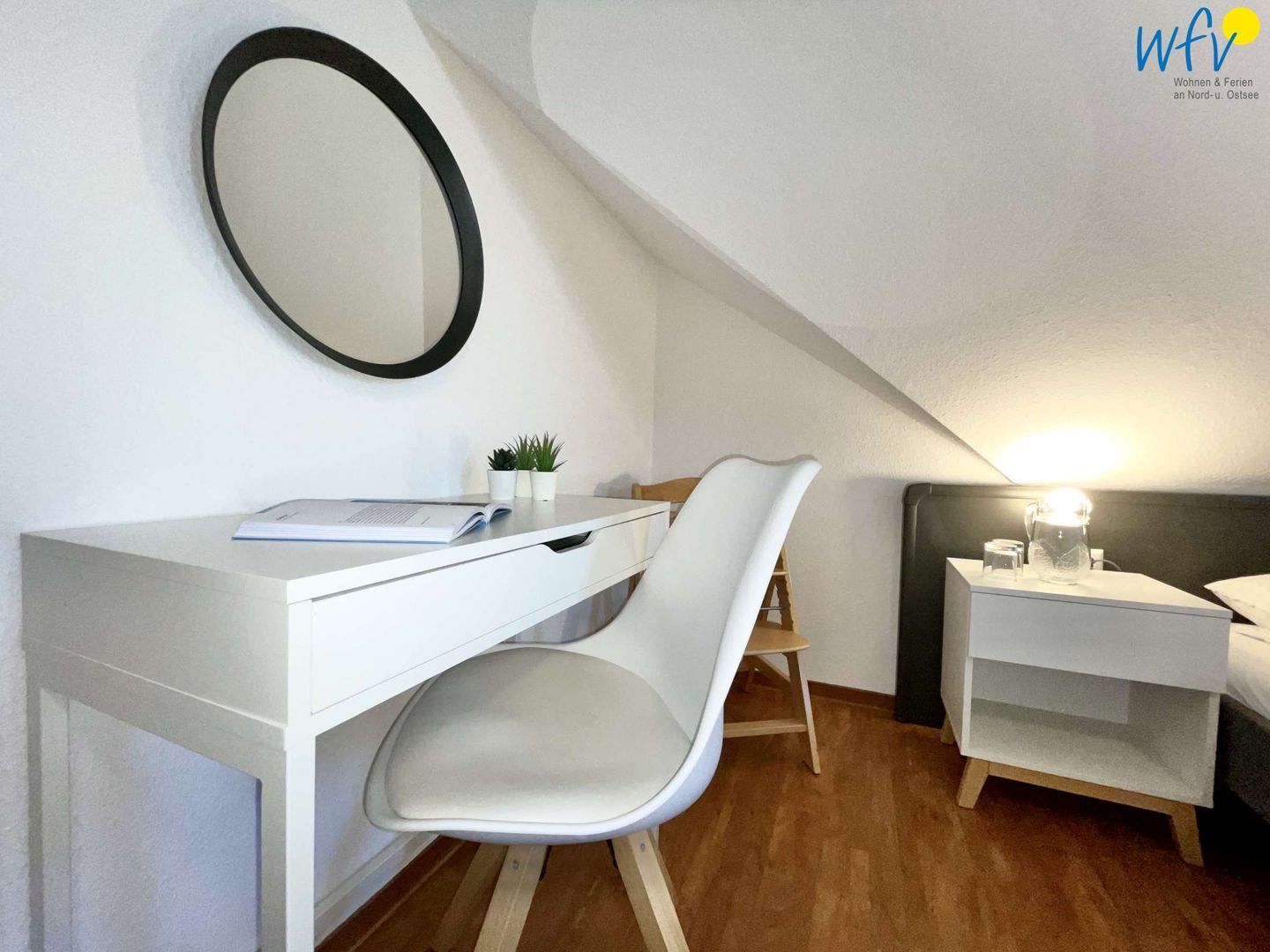 Wenn auf Rügen die Sonne untergeht, wartet in dem separaten Schlafzimmer ein komfortables Doppelbett auf Sie (2 m x 1,80 m). Für eine angenehme Nachtruhe bestehen selbstverständlich Verdunkelungsmöglichkeiten.
