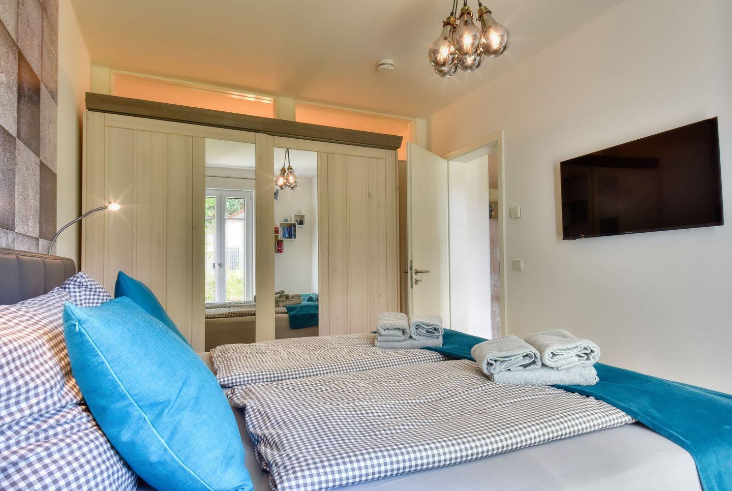 Ein besonders gemütliches Urlaubsdomizil erwartet Rügenurlauber im Erdgeschoss der Villa Sofie Binz im Appartement Nr. 2 „StrandGut“. Via Fahrstuhl geht es von der hauseigenen Tiefgarage hinein ins Urlaubsglück. In diesem 55 m² großen Urlaubsappartement finden bis zu vier Personen Platz. Kommen Sie erst einmal an und holen Sie tief Luft - denn Strand und Ostseewellen sind nur wenige Gehminuten entfernt. Zum Ausspannen bestens geeignet lädt die 10 m² große Terrasse mit Gartenmöbeln und Sonnenschirm ein. Ob beim Frühstück unter freiem Himmel, beim Entspannen im Garten oder beim Sonnenbaden – hier fängt die Erholung bereits direkt nach Anreise an. Das geräumige Wohnzimmer bietet reichlich Platz zum Entspannen auf dem Sofa oder zum Essen am Holztisch. Die Wohnung ist im elegant-maritimen Stil eingerichtet. Das Mobiliar geht hier eine gelungene Kombination mit Naturmaterialien aus Holz ein. Ein großer Flat-TV mit Smart-Funktion sorgt für abendliche Unterhaltung. Kostenfreies WLAN steht zur Verfügung. Die offene Wohnküche ist mit hochwertigen Küchengeräten voll ausgestattet. Das Schlafzimmer lädt mit bequemen Boxspringdoppelbett zum Träumen ein. Hier gibt es einen Flachbild TV, Nachtschränke mit angenehmen Lämpchen zum Lesen und einen Einbauschrank mit viel Ablagefläche. Das zweite Schlafzimmer ist ein Alkoven-Schlafzimmer mit 140x200 großem Doppelbett. Das moderne Bad verfügt über Dusche, WC, Handtuchheizung und Waschtisch. Im Haus gibt es eine finnische Holzsauna, eine Waschmaschine und einen Trockner (alles Münzgeräte) zur gemeinschaftlichen Nutzung. Bei der Anreise sind die Betten bereits bezogen und Handtücher und Badetücher liegen bereit. Ein eigener Stellplatz in der Tiefgarage ist für Sie reserviert.