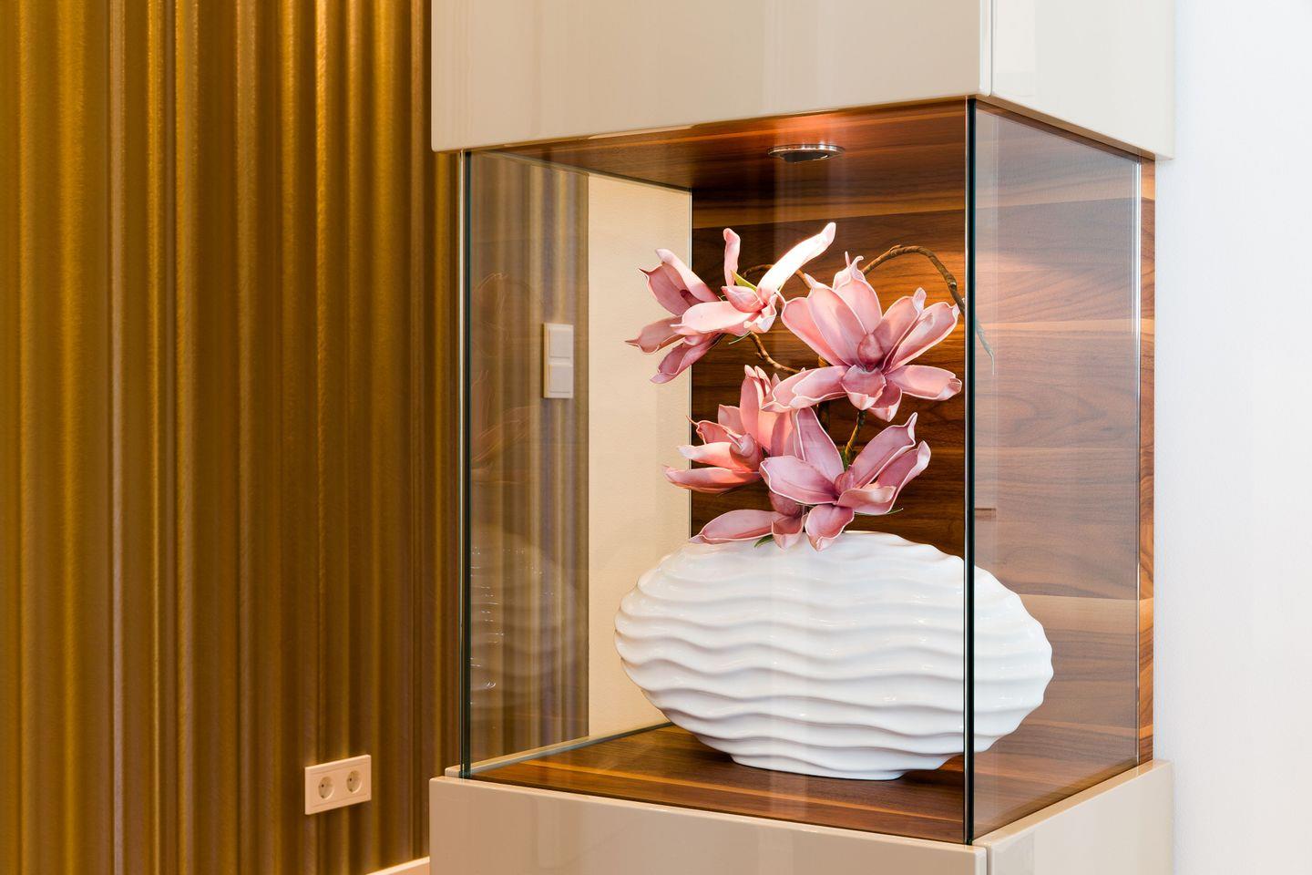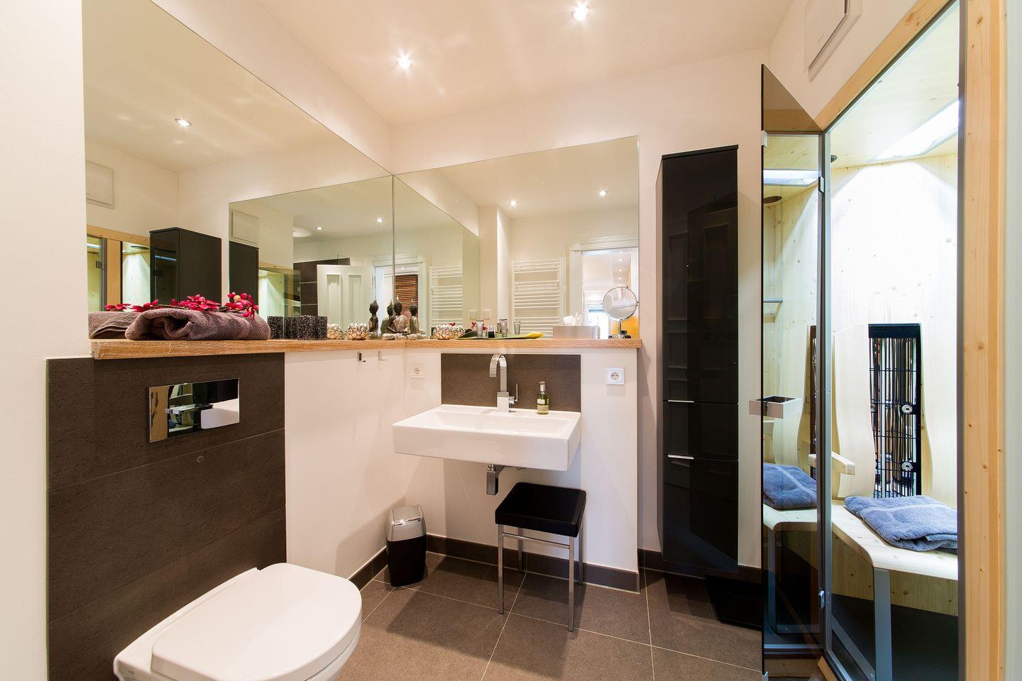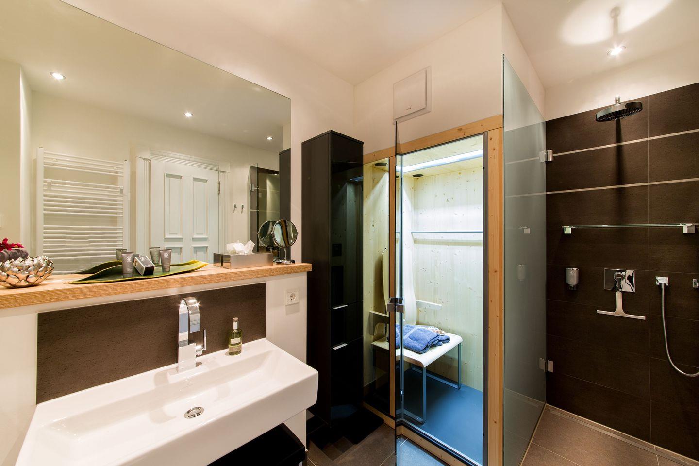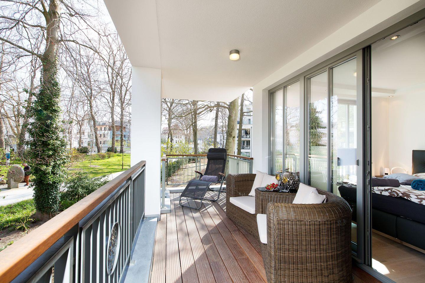 Die lichtdurchflutete Wellness-Suite beeindruckt mit 120m² Wohnfläche, eigener Sauna und Infrarotkabine. Das Appartement hat bodentiefe Balkonfenster in allen Räumen und man kann von den beiden Schlafzimmern und vom Wohnraum aus auf die zur Wohnung gehörenden Balkone gehen. Die Ferienwohnung "Meine Auszeit" ist mit edlen Möbeln von beispielsweise Rolf Benz, Joop!, Leicht und Hülsta ausgestattet. Die Badarmaturen sind von der Marke Dornbracht. Der Eingangsbereich ist mit Garderobenschrank und Schuhschrank ausgestattet und bietet einen ersten Blick in den offenen und stylisch eingerichteten Wohn- und Essbereich. Die Küche ist voll ausgestattet, auch ein Weinkühlschrank mit zwei Kühlzonen steht unseren Gästen zur Verfügung. Eine große Kücheninsel ist ideal, um einen geselligen Kochabend zu veranstalten. WLAN ist in allen Räumen kostenfrei verfügbar.