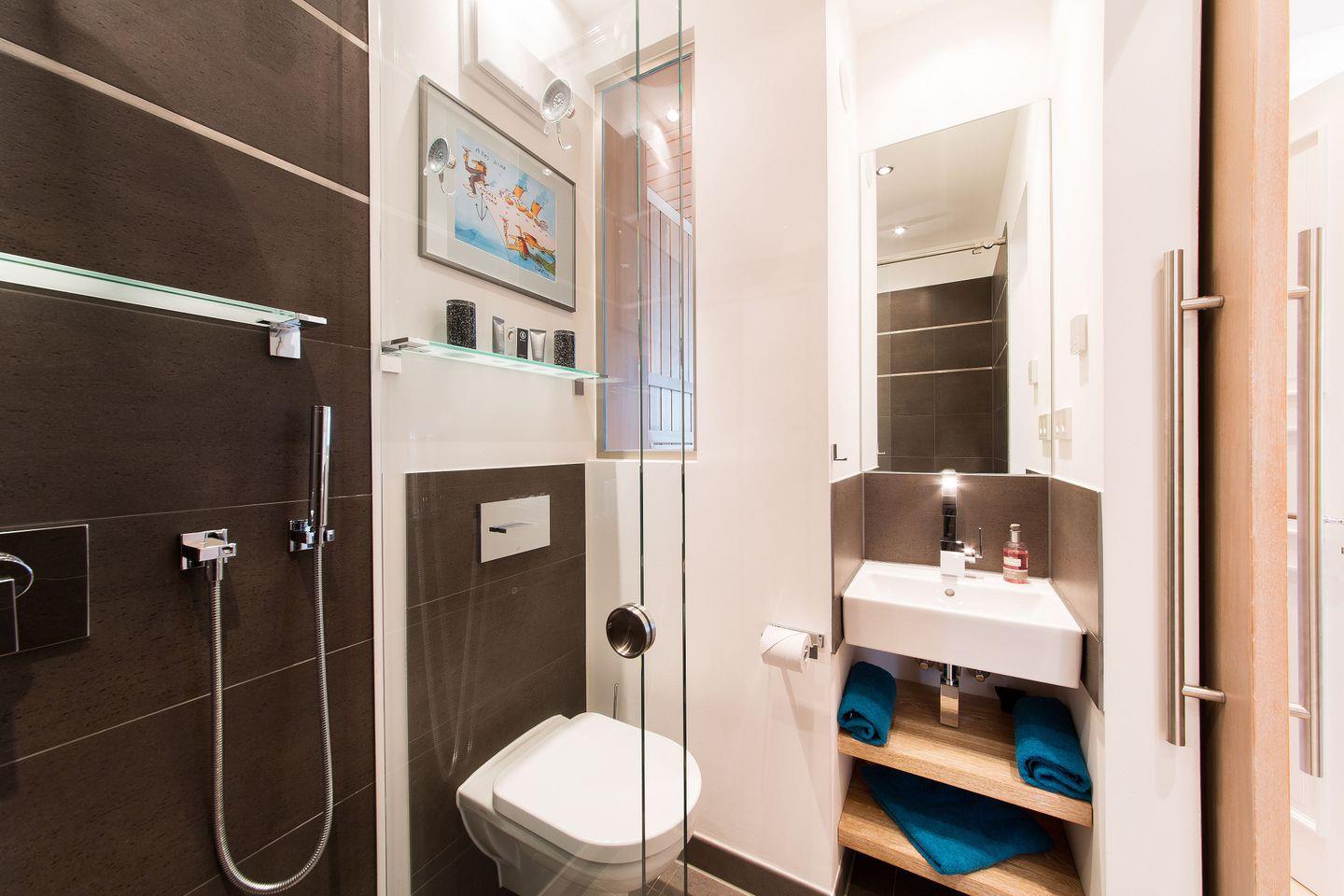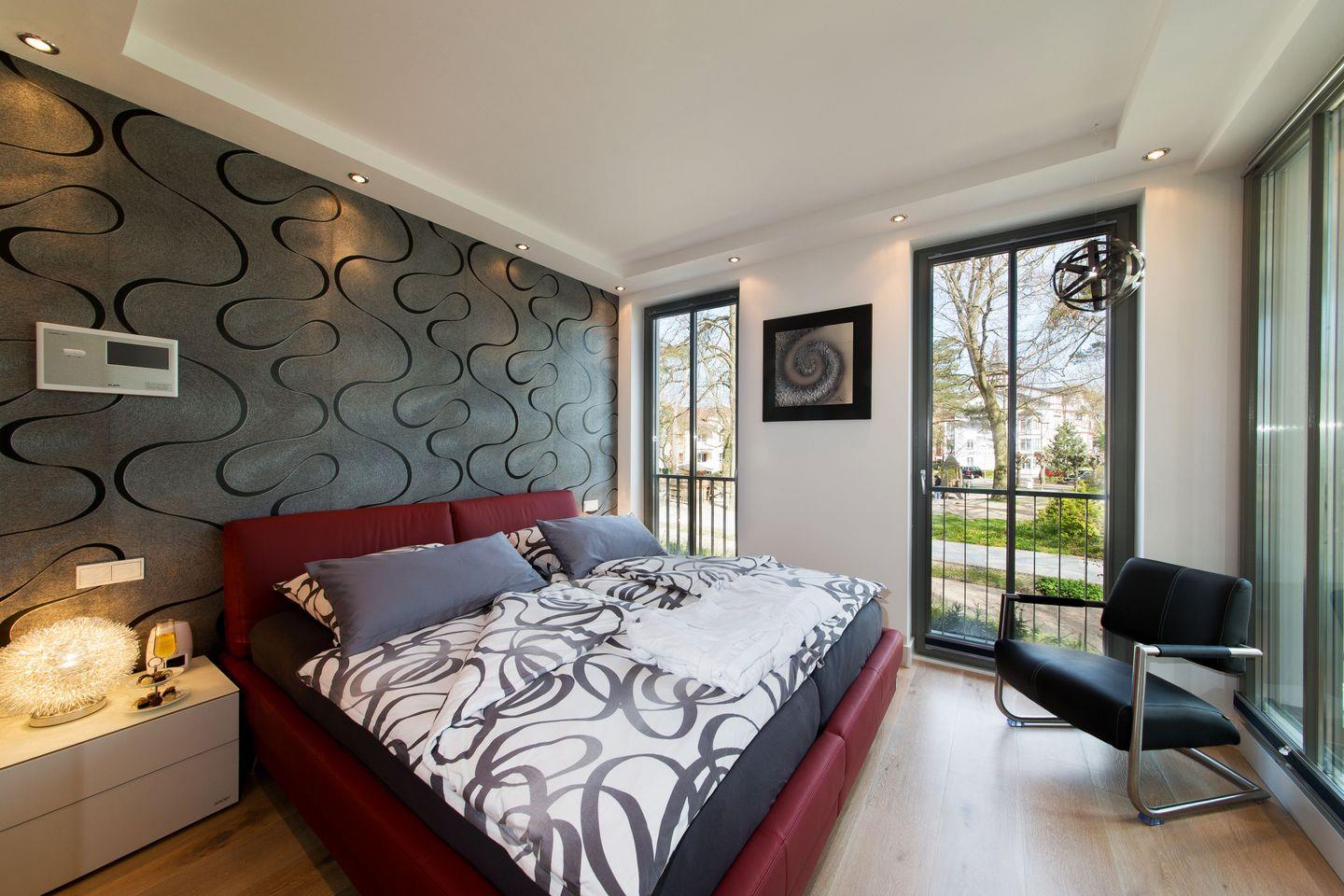 Beide Schlafzimmer haben Zugang zum Balkon und verfügen über ein bequemes Doppelboxspringbett mit hohem Schlafkomfort. Ein Sessel, Smart-TV und Ablagemöglichkeiten für Kleidung sind in beiden Räumen vorhanden. Beide Schlafzimmer sind verdunkelbar. Es gibt 2 Badezimmer mit ebenerdiger Regendusche, Waschtisch und WC. Die Sauna ist in das Masterschlafzimmer mit großer Glasfläche integriert. Die Intrarotkabine befindet sich in dem größeren Badezimmer.