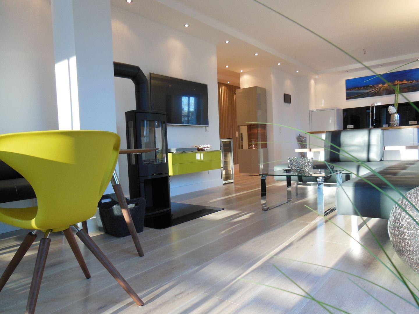 Der Kamin im Wohnraum sorgt besonders in der Nebensaison für schöne Stunden nach wundervollen Strandspaziergängen.