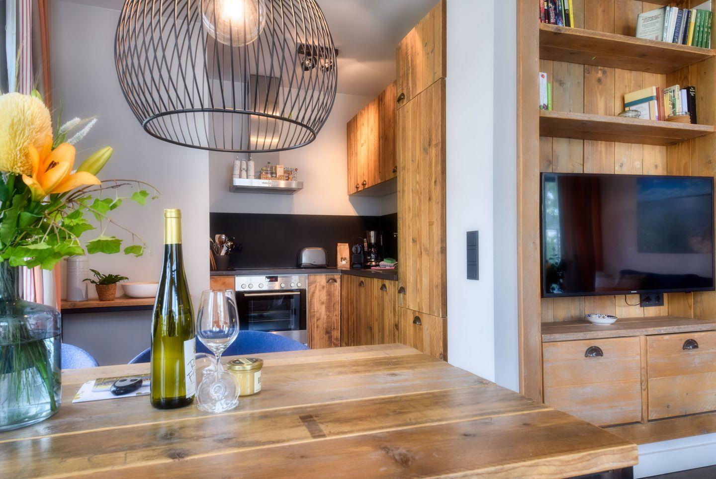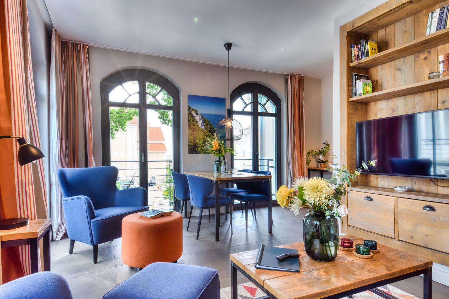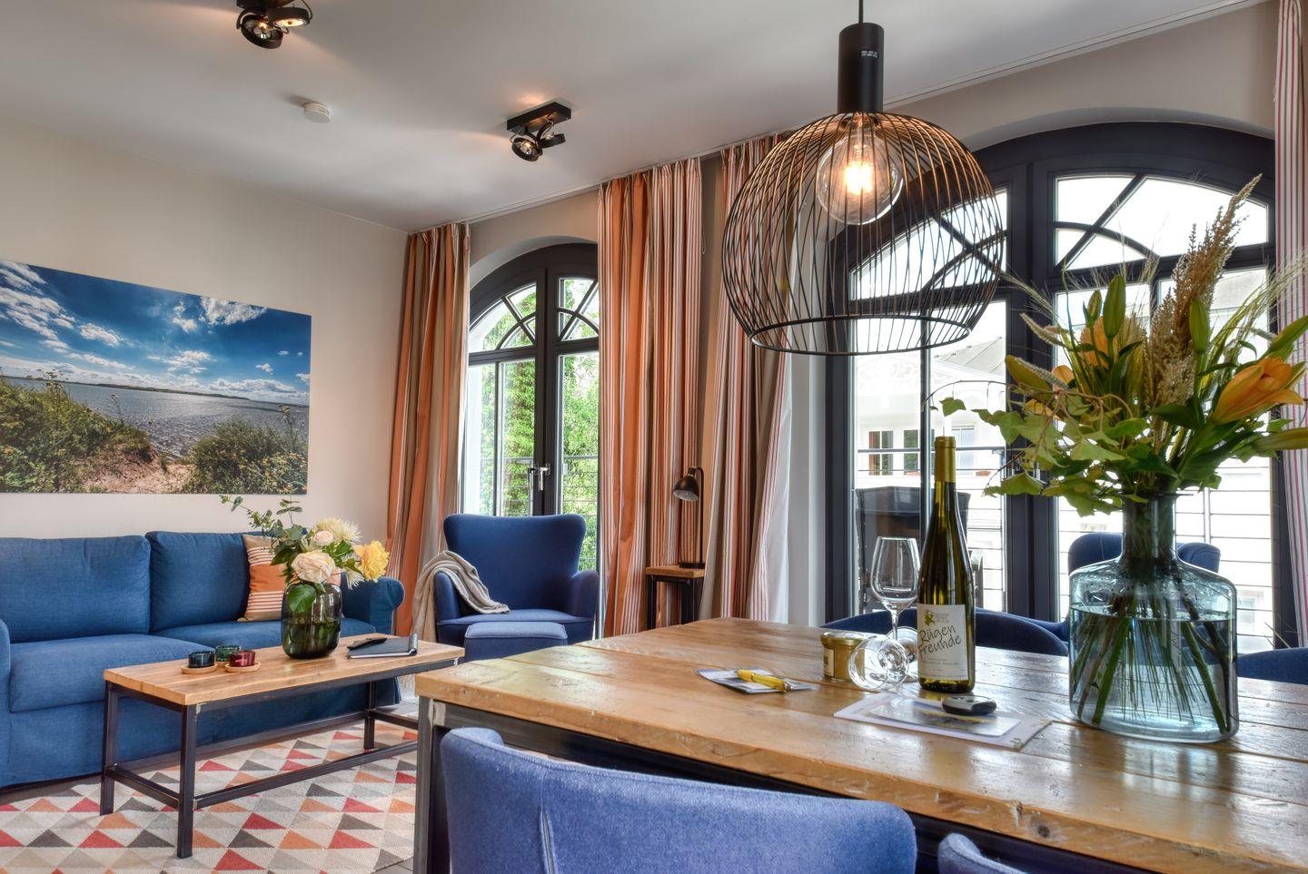 Rustikal-maritime Möblierung mit Geschmack und Stil erwartet Sie in der Ferienwohnung Treibholz im 2. Obergeschoss der Villa Martha in Binz. Die 50 m² große Seeblick-Ferienwohnung ist für 1-2 Personen geeignet. In allen Räumen lassen sich ausgesuchte Details entdecken, die den Urlaub hier zu einem unvergesslichen Erlebnis werden lassen. Genießen Sie entspannte Stunden im gemütlichen Wohnraum mit Couch, Ohrensessel und Smart-TV inklusive kostenfrei nutzbaren SKY Sendern. Die Küche ist mit Nespresso-Kaffeemaschine, Filterkaffeemaschine, Wasserkocher, Toaster, Mixer, Geschirrspüler, Backofen, Kühlschrank, Gefrierfach und Kochfeld ausgestattet und bietet die Grundlage für einen geselligen Kochabend oder ein ausgedehntes Urlaubsfrühstück.