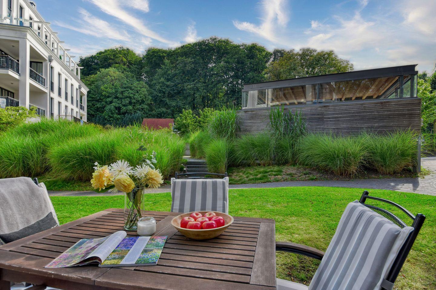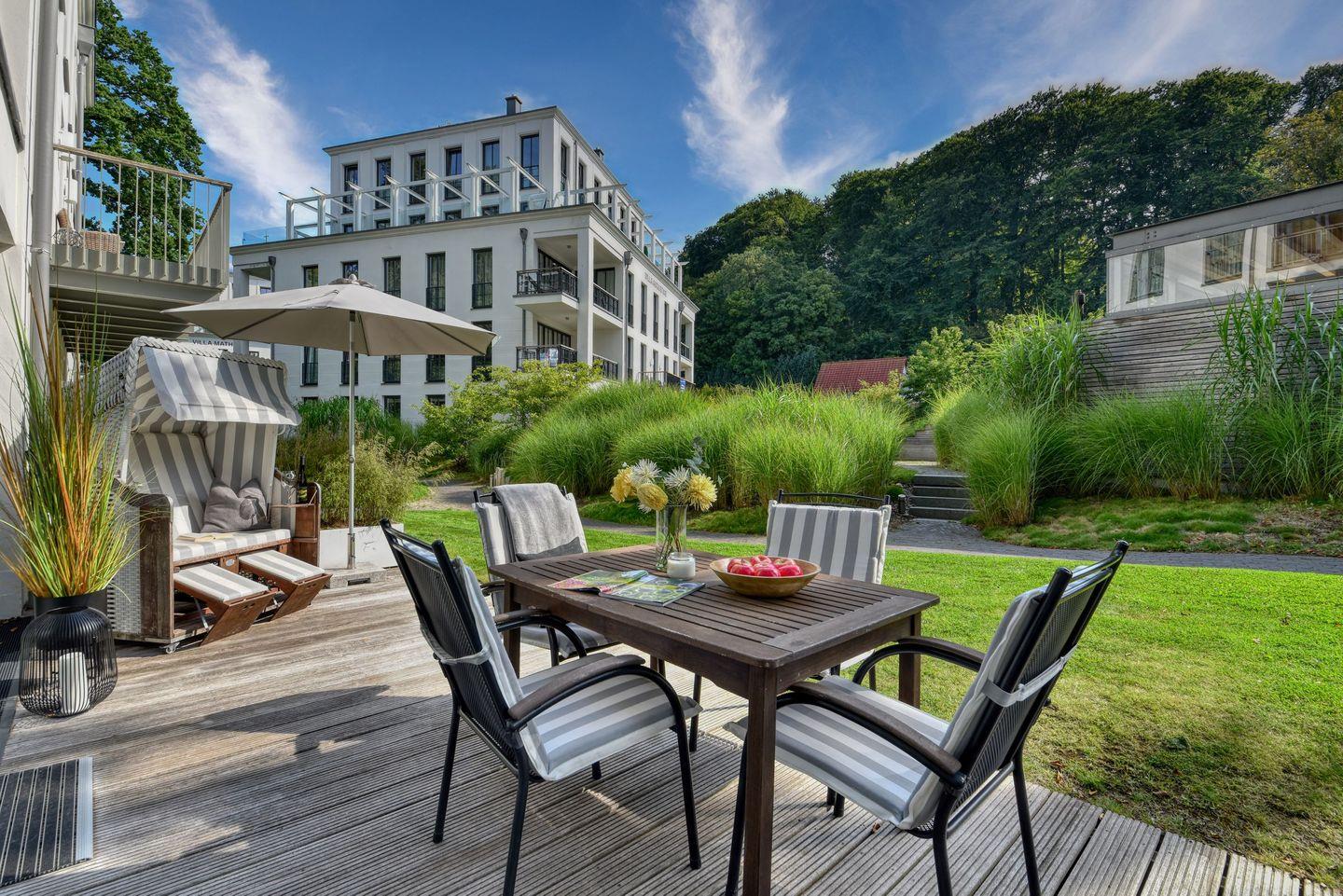 Das Herzstück dieser Wohnung ist zweifellos der hauseigene Pool (saisonal nutzbar, nicht beheizt), der sich mitten in der über 6000 m² großen Parkanlage befindet. Umgeben von edlen Gärten und hundertjährigen Buchen bietet er die perfekte Möglichkeit, sich zu entspannen und die Seele baumeln zu lassen. Die große Terrasse der Wohnung lädt ebenfalls zum Verweilen ein und bietet einen herrlichen Blick auf den Poolbereich. Ein wohnungseigener Strandkorb (Mai bis September) am Strand lädt dazu ein, gemütliche Stunden im Freien zu verbringen und die frische Ostseeluft zu genießen.