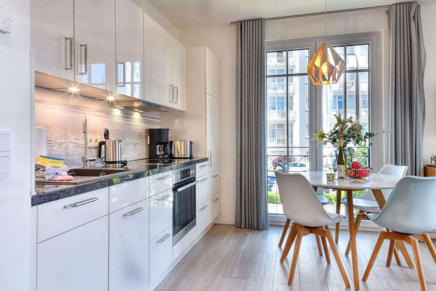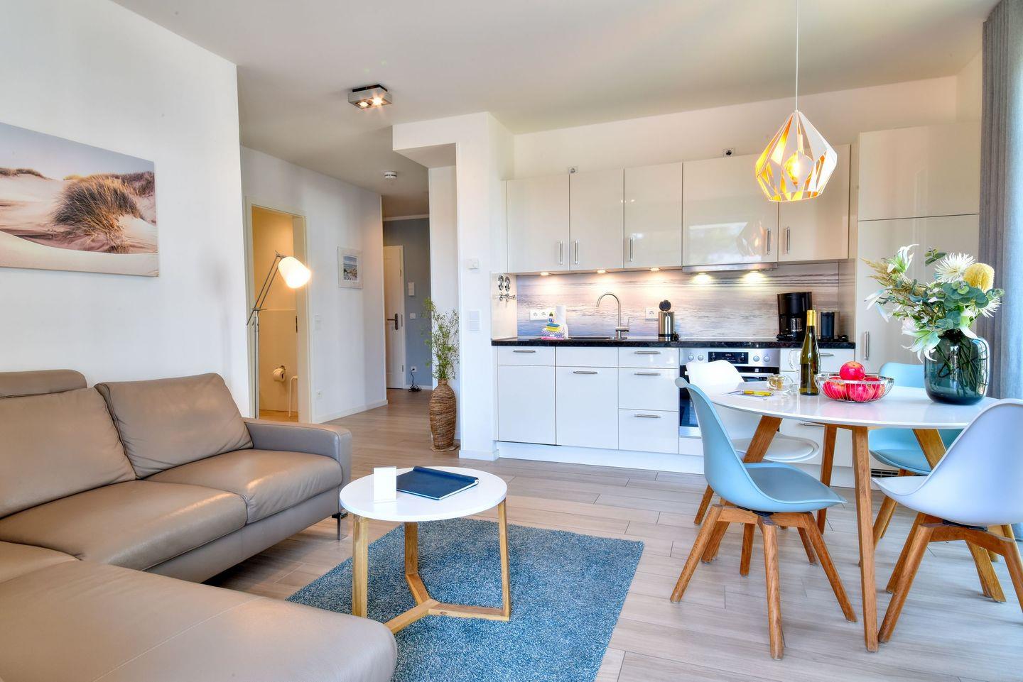 Ein besonders sonniges Urlaubsdomizil erwartet Binz-Liebhaber im 1. Obergeschoss der Villa Sofie Binz im Appartement Nr. 6 „Wellenreiter“. Via Fahrstuhl geht es von der hauseigenen Tiefgarage hinein ins Urlaubsglück. In diesem 58 m² großen Ferienappartement finden bis zu vier Personen Platz. Kommen Sie erst einmal an und holen Sie tief Luft - denn Sandstrand und Ostseewellen sind nur wenige Gehminuten entfernt. Zum Ausspannen bestens geeignet lädt der 8 m² große Balkon mit Gartenmöbeln ein. Ob beim Frühstück unter freiem Himmel, beim Entspannen auf dem wohnungseigenen Balkon – hier fängt die Erholung bereits direkt nach Anreise an. Das geräumige Wohnzimmer bietet reichlich Platz zum Entspannen auf dem Ledersofa oder zum Essen am Esstisch. Die Wohnung ist im eleganten Stil eingerichtet. Ein großer Flat-TV mit Smart-Funktion sorgt für abendliche Unterhaltung. Kostenfreies WLAN steht zur Verfügung. Die offene Wohnküche ist mit hochwertigen Küchengeräten voll ausgestattet. Die zwei Schlafzimmer laden mit bequemen Boxspringdoppelbetten zum Träumen ein. Hier gibt es einen Flachbild TV, Nachtschränke mit angenehmen Lämpchen zum Lesen und einen Schrank mit viel Ablagefläche. In einem Schlafzimmer ist das Doppelboxspringbett auch komplett im Anbauschrank verstaubar, sodass man das Zimmer zu einem zweiten kleinen Wohnzimmer mit gemütlicher Couch umfunktionieren kann. Das moderne Bad verfügt über Dusche, WC, Handtuchheizung und Waschtisch. Im Haus gibt es eine finnische Holzsauna, eine Waschmaschine und einen Trockner (alles Münzgeräte) zur gemeinschaftlichen Nutzung. Bei der Anreise sind die Betten bereits bezogen und Handtücher und Badetücher liegen bereit. Ein eigener Stellplatz in der Tiefgarage ist für Sie reserviert.