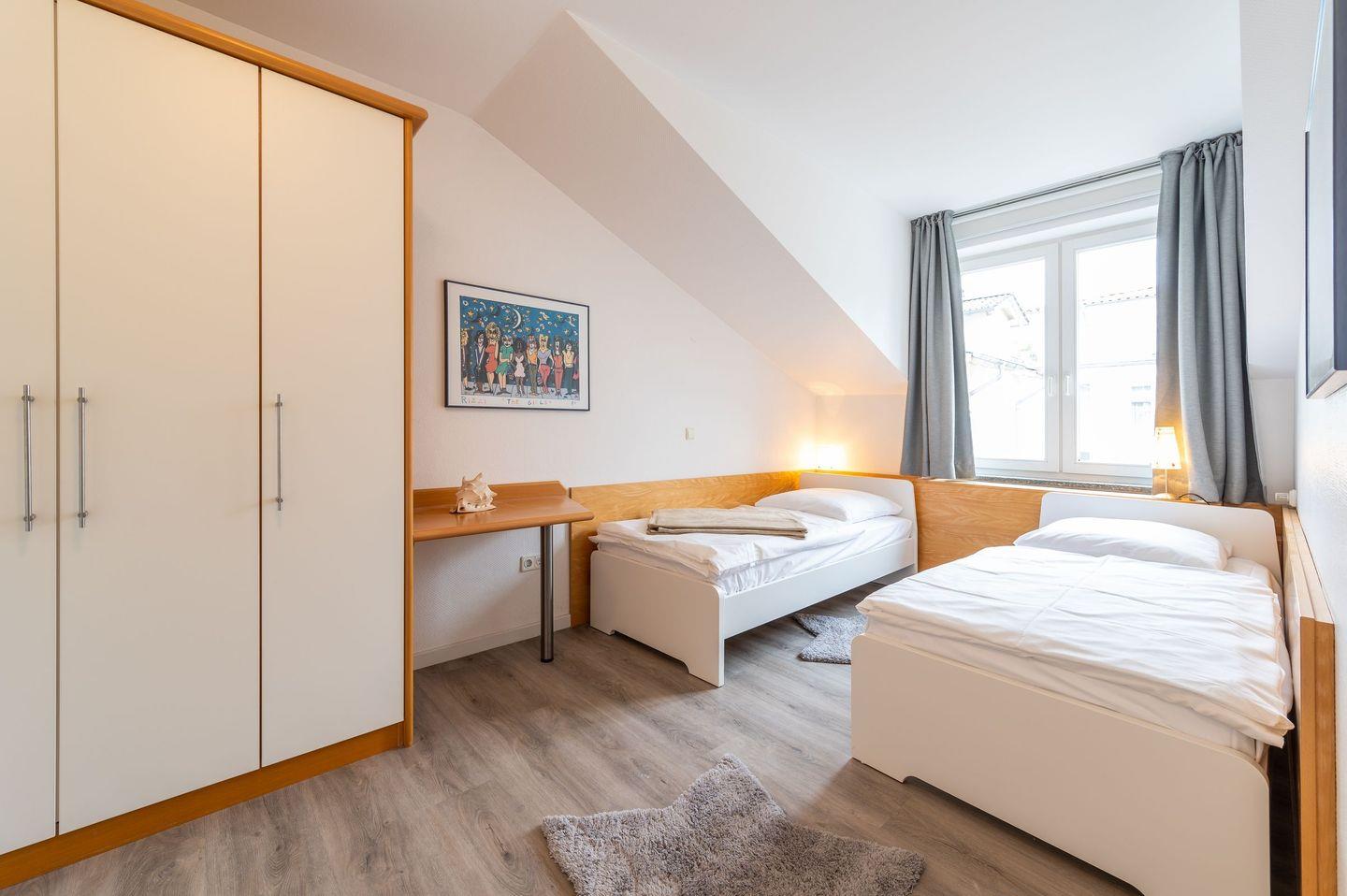 Beide Schlafzimmer liegen ruhig zum Innenhof, das Hauptschlafzimmer ist mit einem komfortablen Doppelbett und Smart-TV, das zweite Schlafzimmer mit 2 Einzelbetten (perfekt für Kinder) ausgestattet. Das zweite Schlafzimmer hat zudem einen seitlichen Ausblick auf die Ostsee.