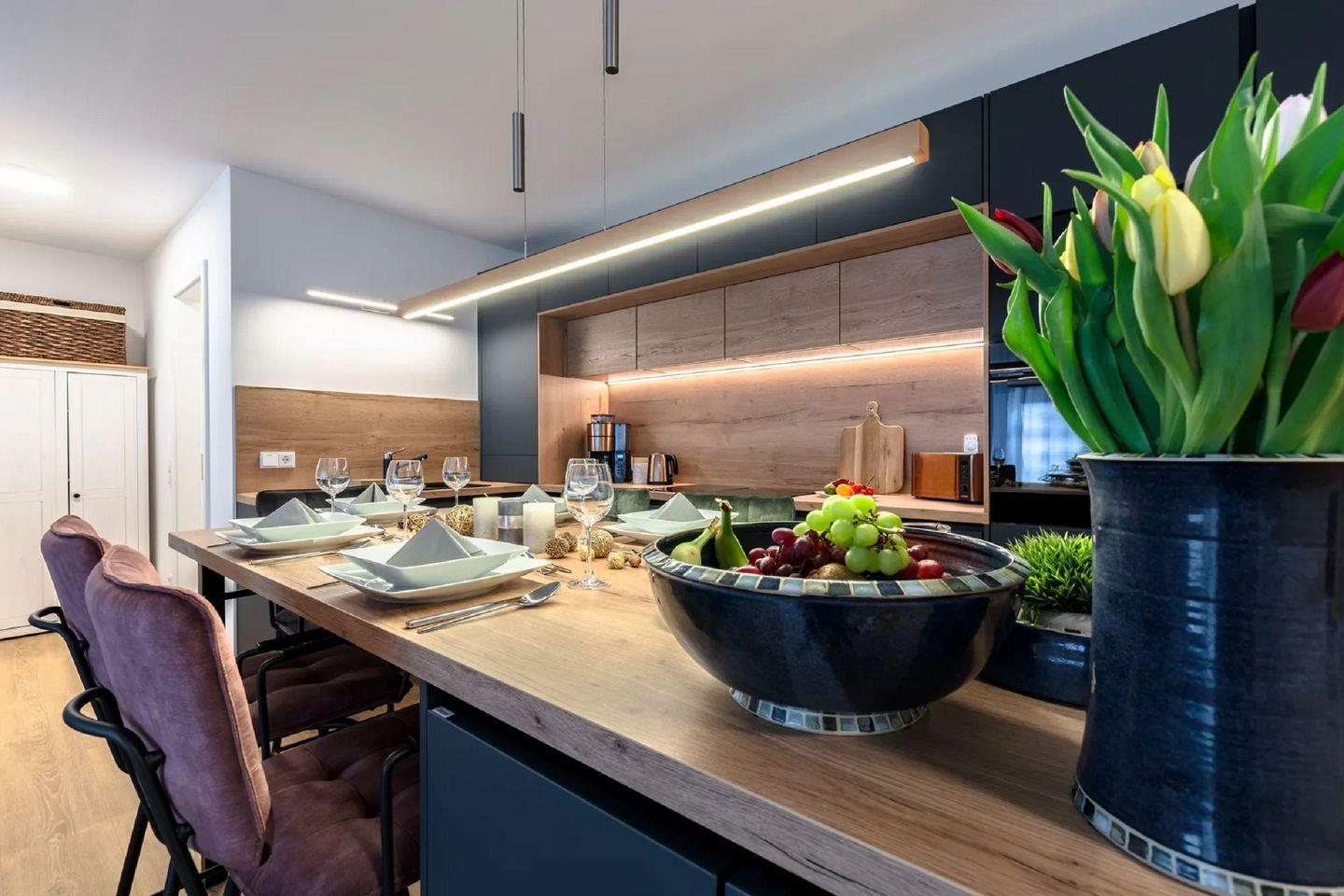 Die offene Premium-Küche ist nahtlos in den Wohnbereich integriert und lässt keine Wünsche offen: Induktionsherd mit integriertem Dunstabzug, Backofen, Mikrowelle, Kühl- und Gefrierkombination, Geschirrspüler, Toaster, Wasserkocher und eine Filterkaffeemaschine mit Mahlwerk. Perfekt für gemeinsame Kochabende – vom ausgiebigen Frühstück bis zum Gourmet-Dinner.