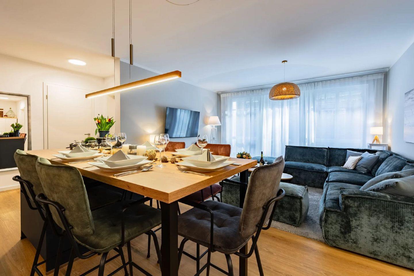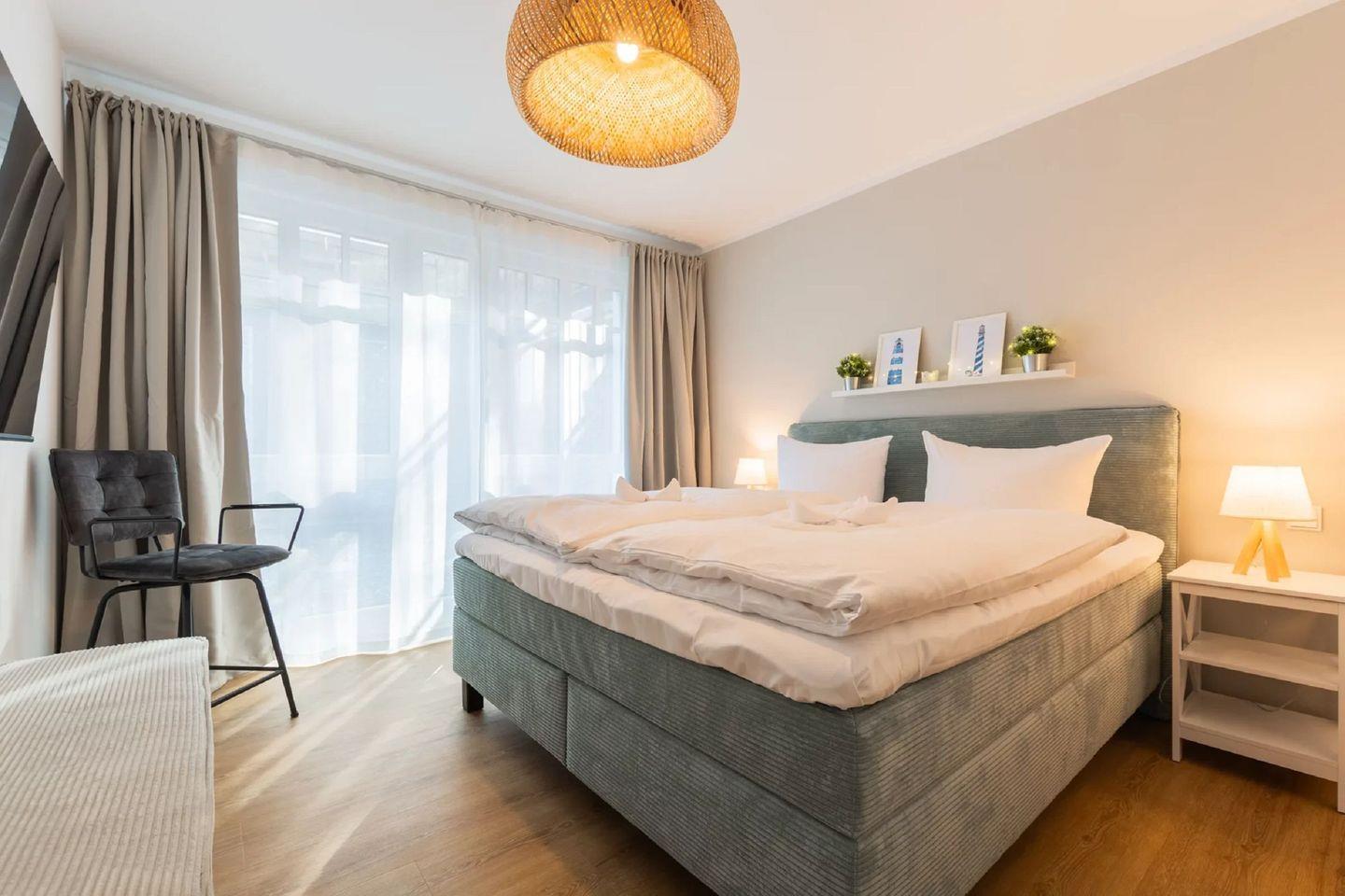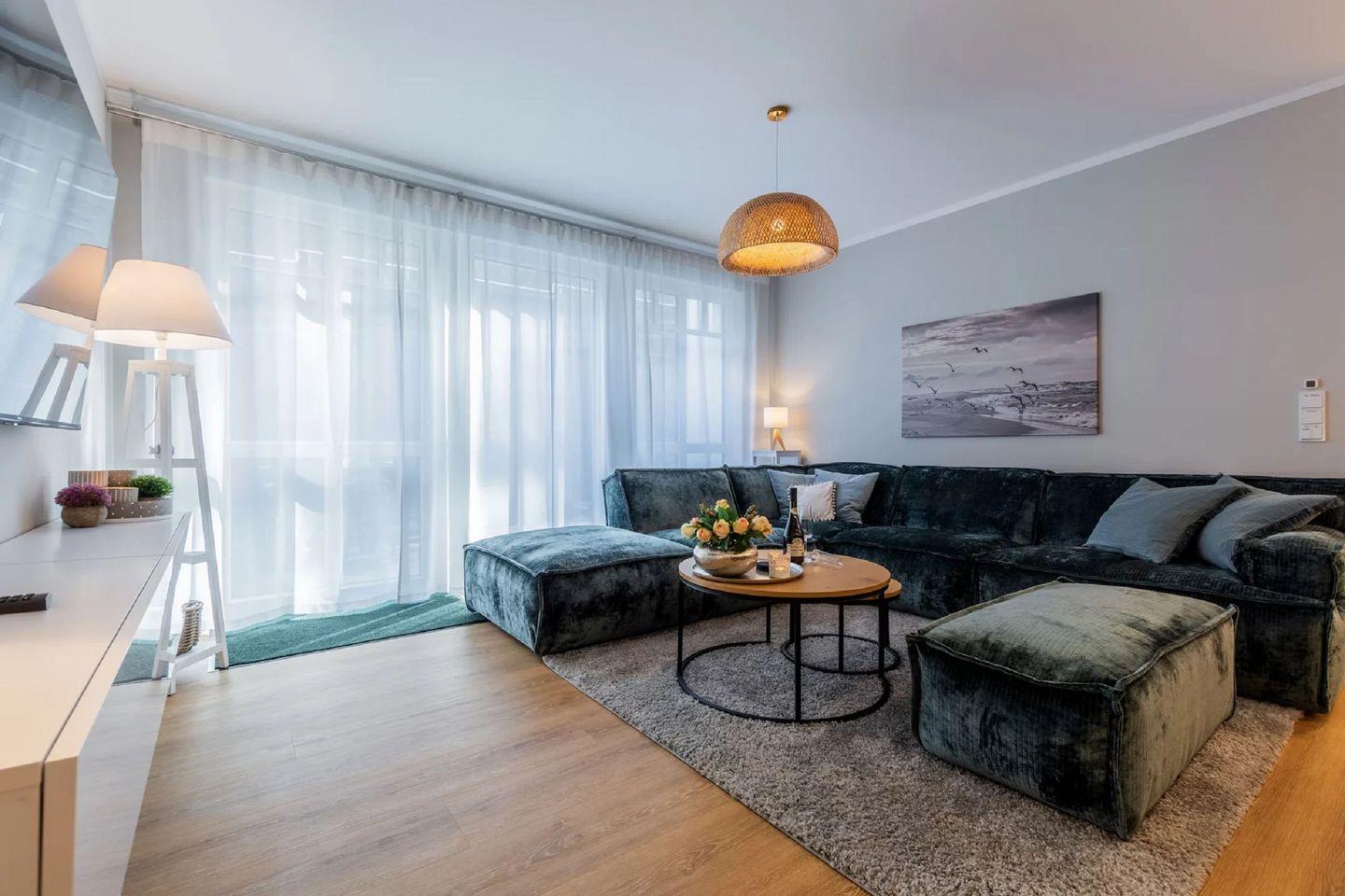 Die Ferienwohnung „Strandmuschel“ (Wohnung 5) befindet sich im Erdgeschoss und begeistert mit einem lichtdurchfluteten Wohnkonzept dank bodentiefer Fenster. Auf 85 m² erwarten Sie stilvolles Interieur, eine hochwertige Ausstattung und ein durchdachtes Raumdesign.