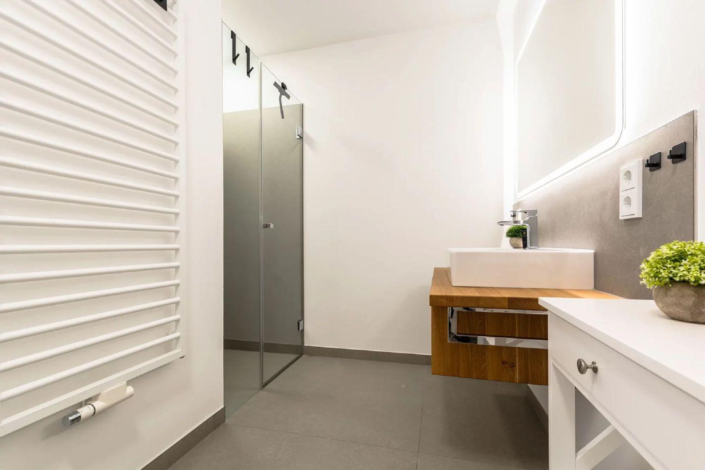 Die beiden großzügigen Badezimmer sind jeweils ausgestattet mit ebenerdiger Regendusche, großem beleuchteten Spiegel, Handtuchwärmer und edlen Armaturen.