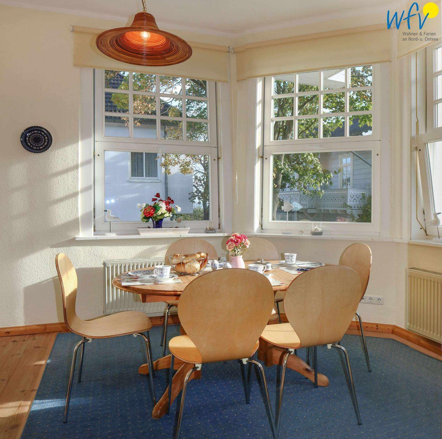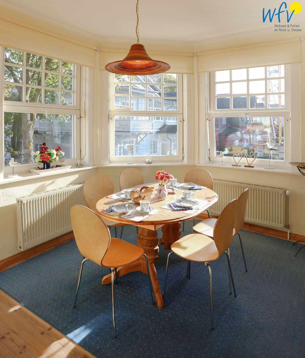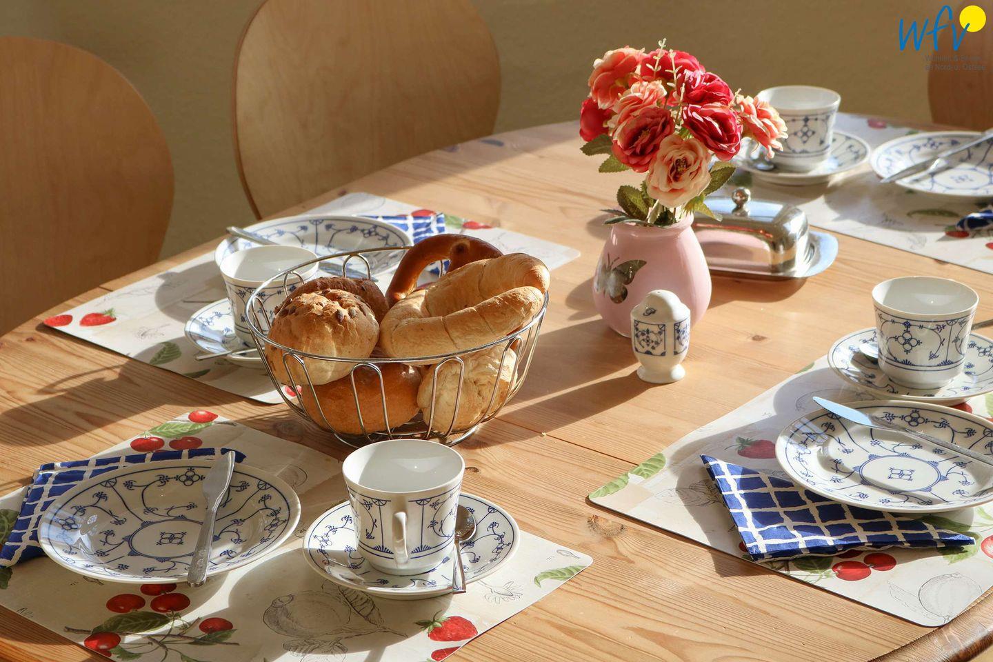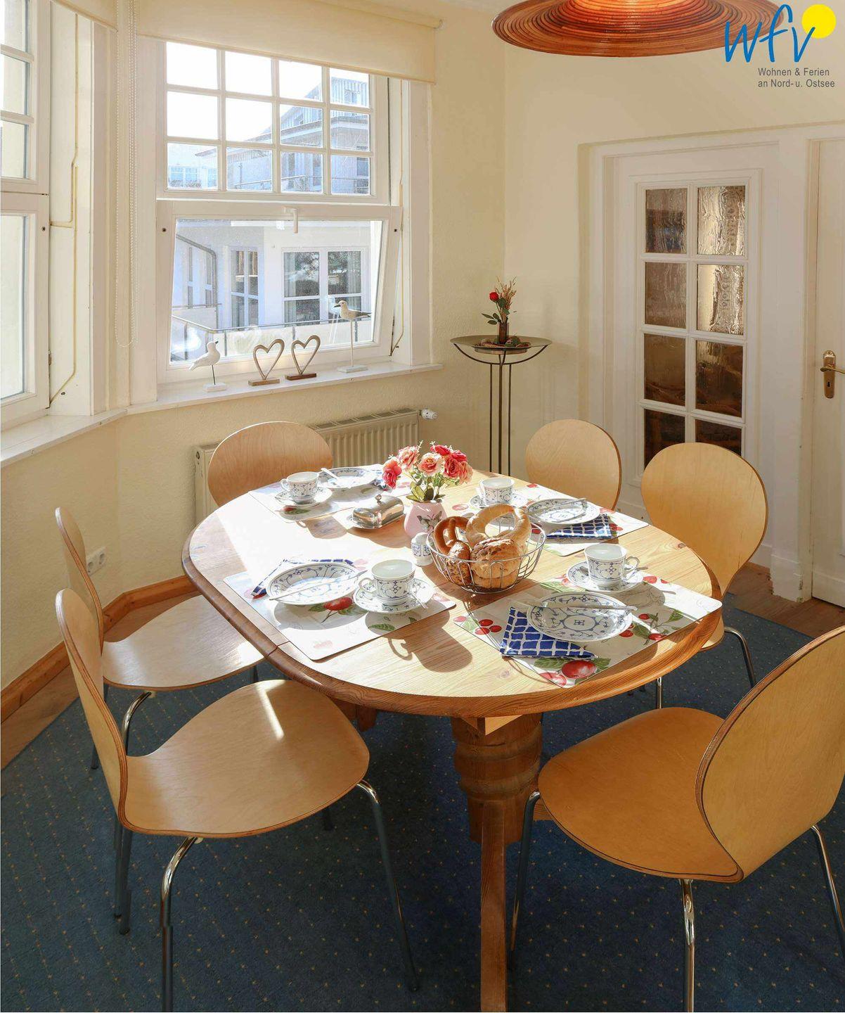 Bereits beim Frühstück können Sie an dem schönen Esstisch mit Blick nach draußen die entspannte Stimmung genießen! Dabei lässt sich wunderbar der Urlaubstag planen - mit einer Fahrradtour durch die malerische Landschaft, einem ausgiebigen Bummel im Ort oder einem Badetag am weißen Sandstrand...