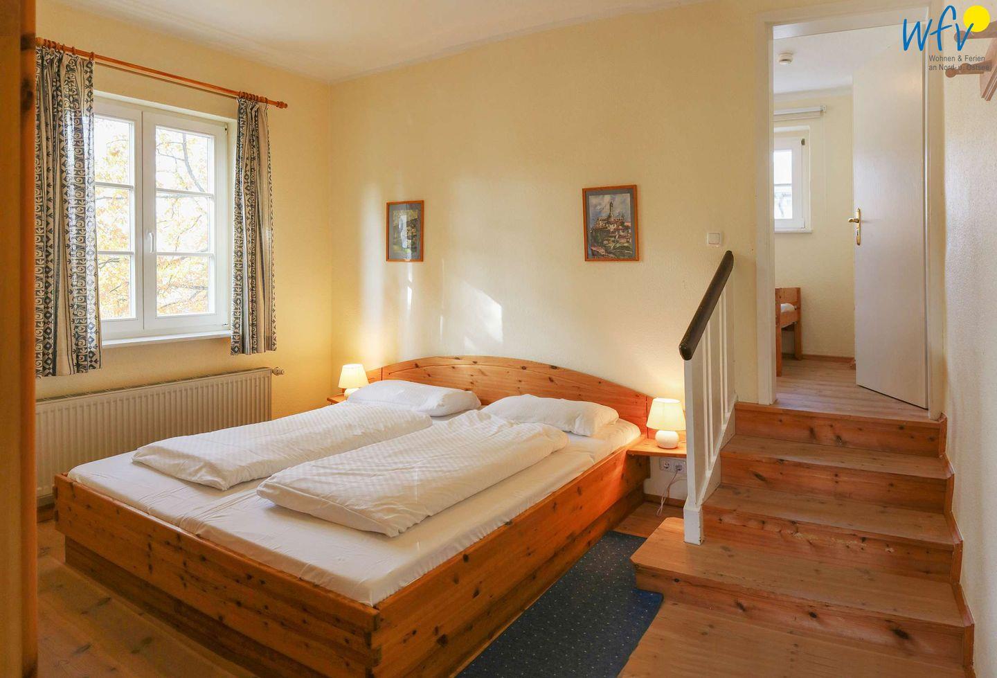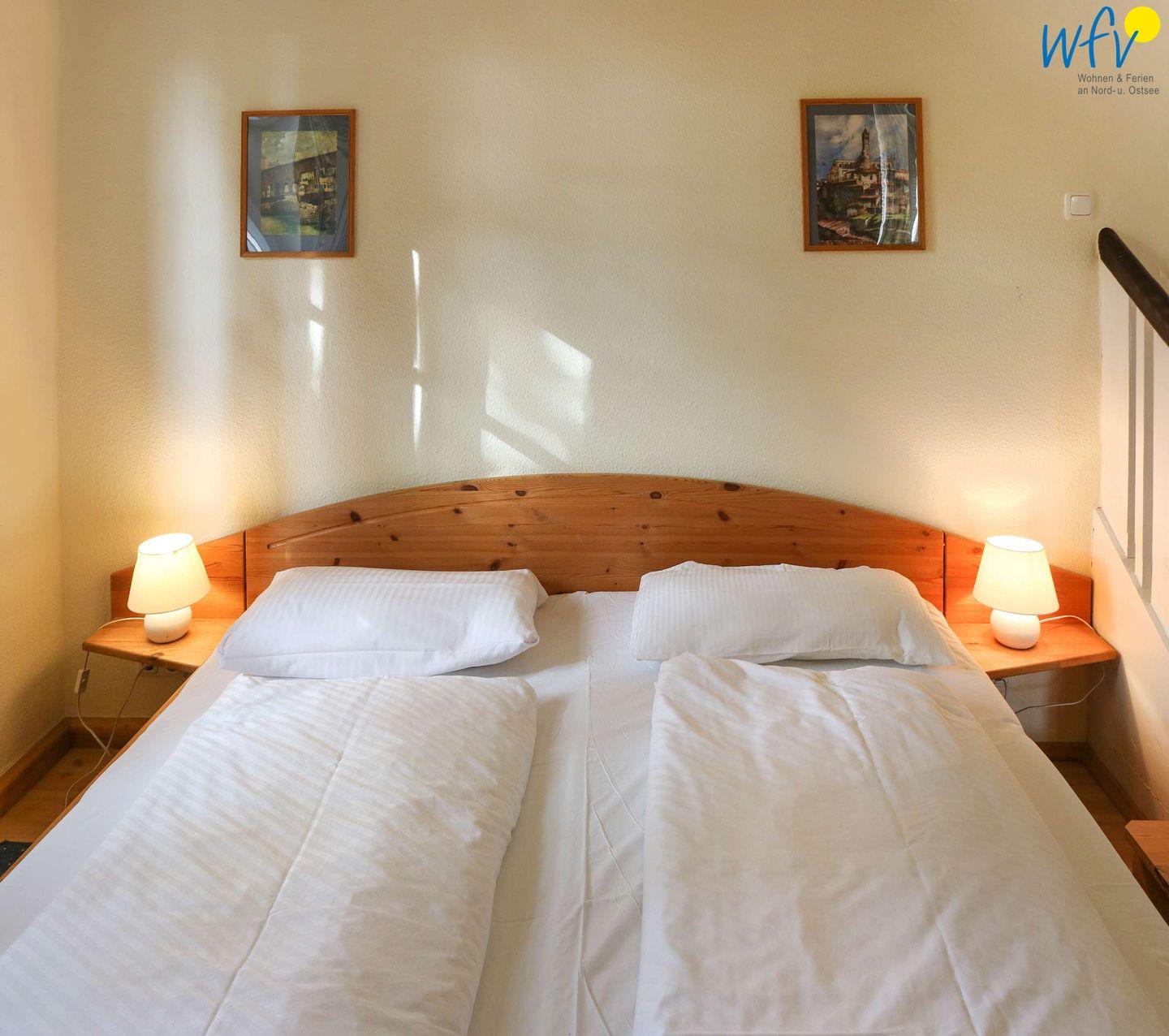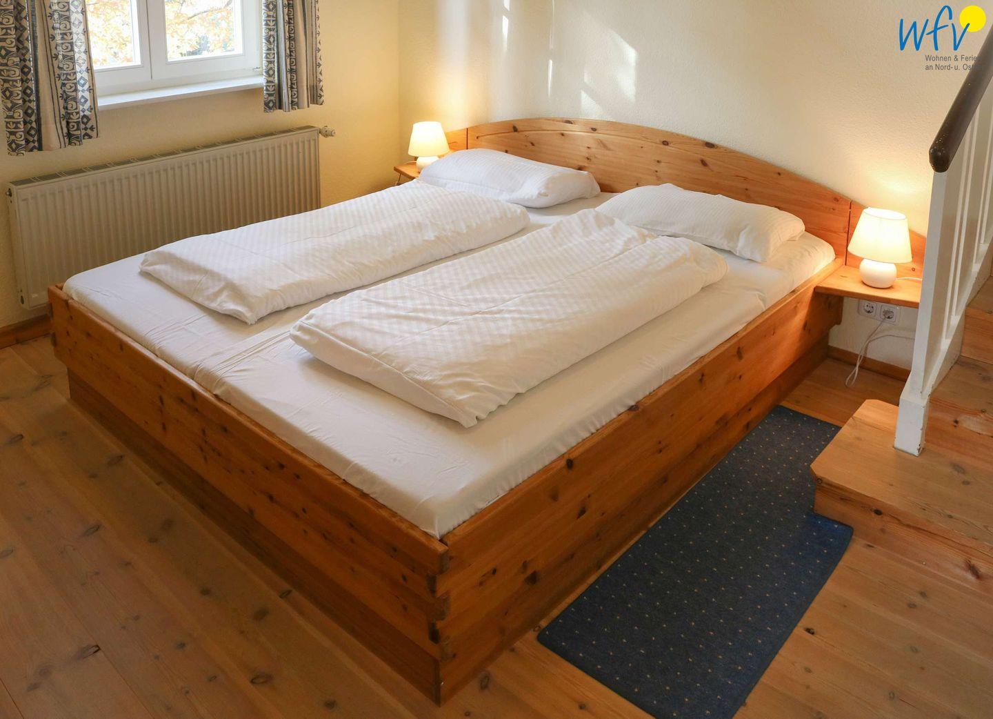 Zwei separate Schlafzimmer bieten angenehme Rückzugsmöglichkeiten. Eines der Schlafzimmer ist mit einem Doppelbett eingerichtet (200 x 180 cm), das andere Schlafzimmer mit einem versetzten Etagenbett (1 Bett 170 cm x 90 cm und 1 Bett 190 cm x 90 cm). Der Zugang erfolgt über das erste Schlafzimmer.
