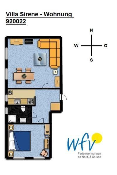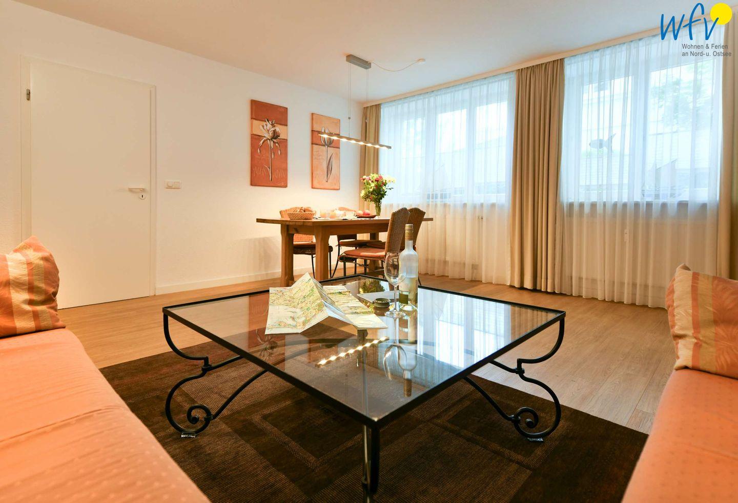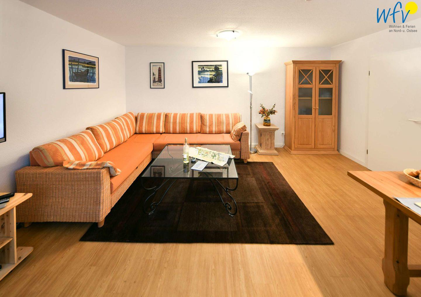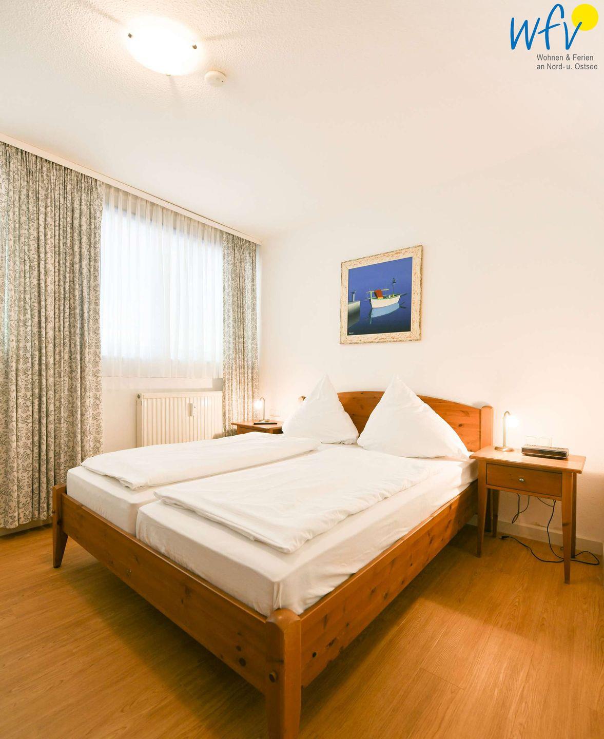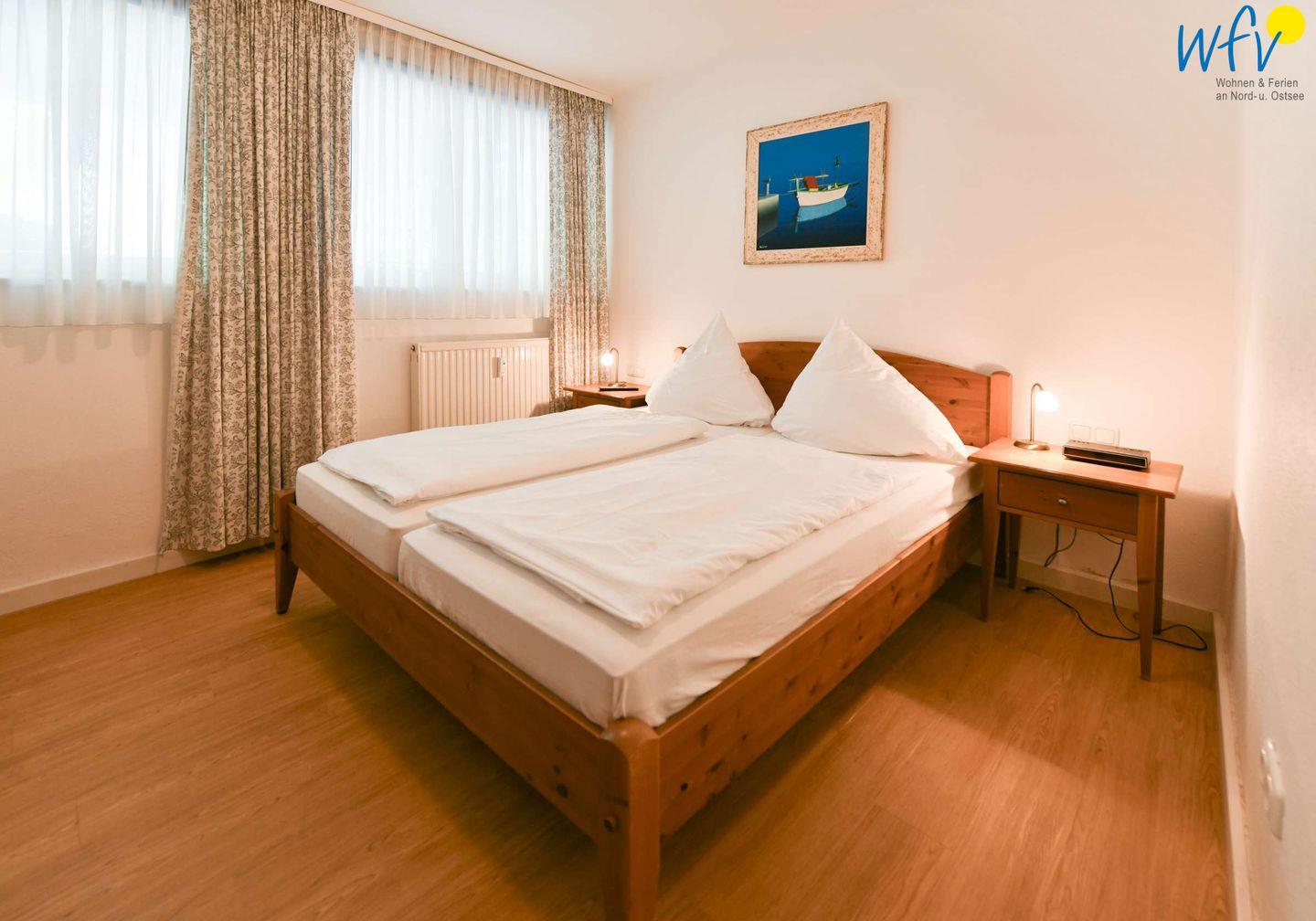 In dem separaten Schlafzimmer befindet sich ein Doppelbett (160 cm x 200 cm). Durch ein Schlafsofa im Wohnzimmer bestehen Schlafmöglichkeiten für eine 3. und/oder 4. Person (Liegefläche 200 cm x 200 cm).